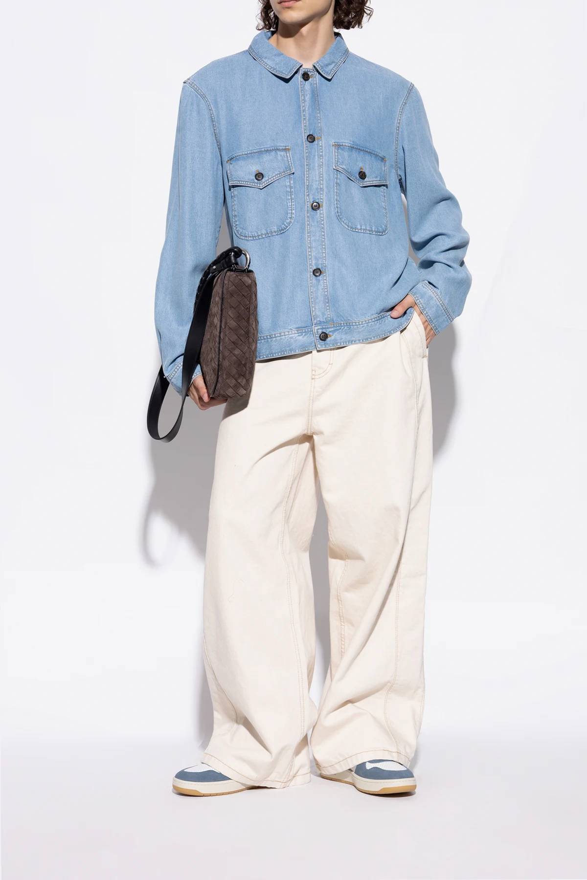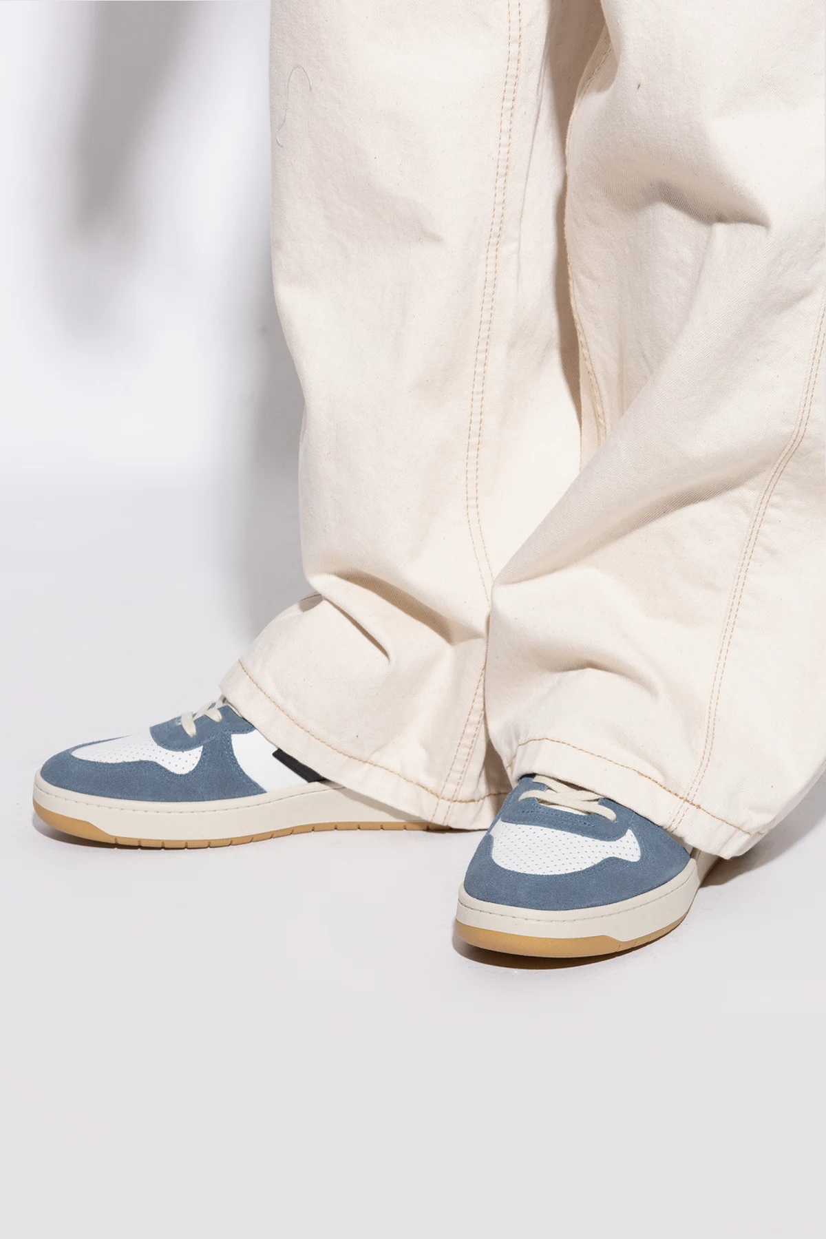 Cholewkę wykonano z najwyższej jakości skóry licowej i miękkiego zamszu w głębokim niebieskim odcieniu, który harmonijnie kontrastuje z białymi wstawkami. Beżowa podeszwa z naturalnej gumy dyskretnie podkreśla szlachetność materiałów.