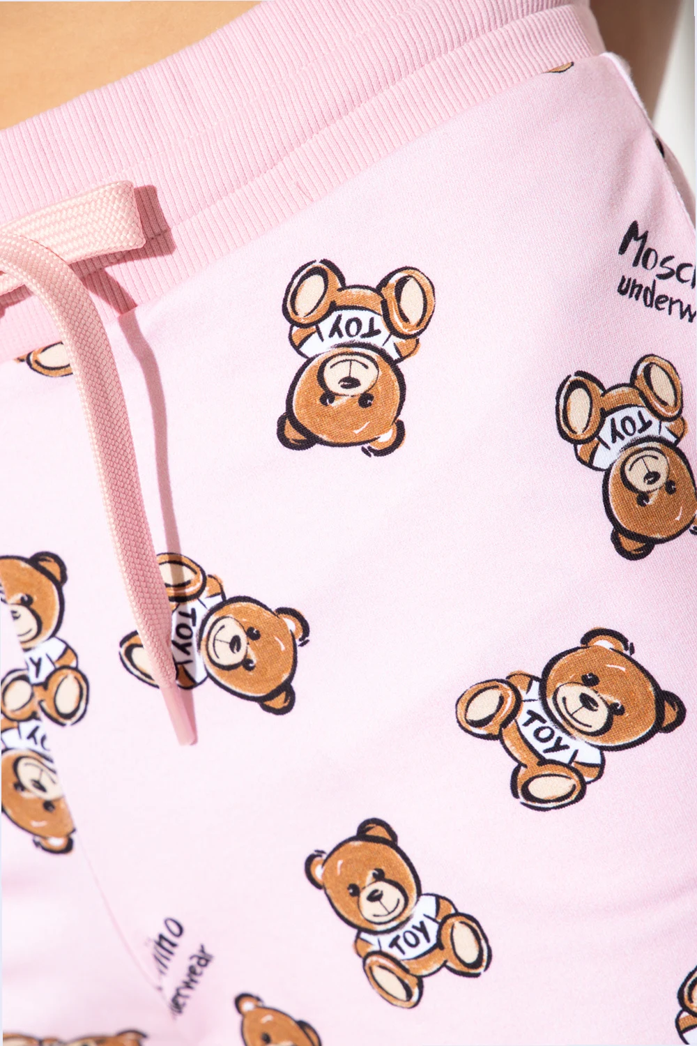 Różowe, bawełniane szorty Moschino, kolekcja ‘Underwear’. W pasie wszyta guma ściągana trokami. Ozdobione kolorowym wzorem z motywem misia. Z przodu dwie wsuwane kieszenie.