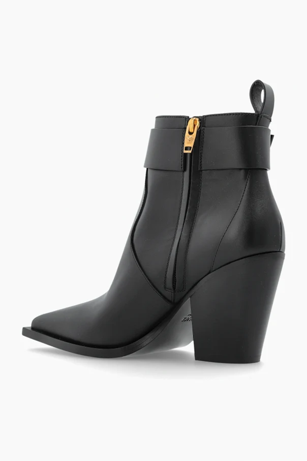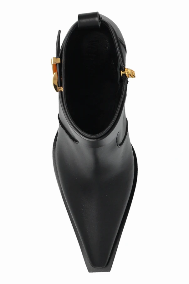 Skórzane botki na obcasie od Versace uosabiają wyrafinowaną estetykę i wyraźną dbałość o detale. Ich klasyczny, smukły kształt ze szpiczastym noskiem subtelnie wysmukla stopę, a dopasowana cholewka sięgająca do kostki otula ją z niezwykłą precyzją.