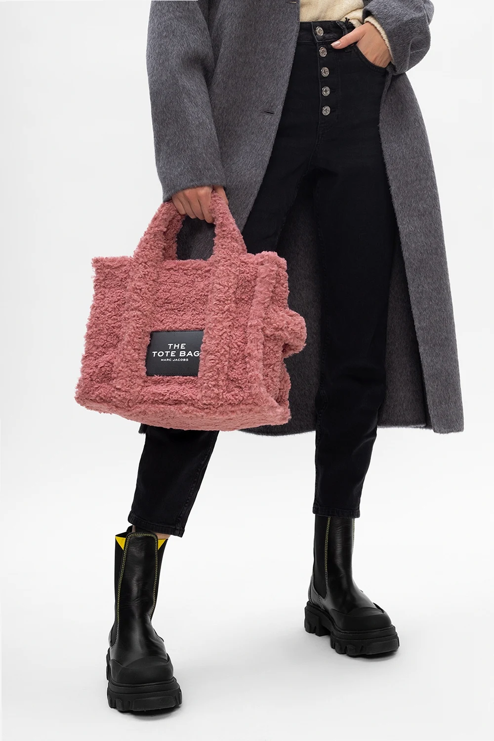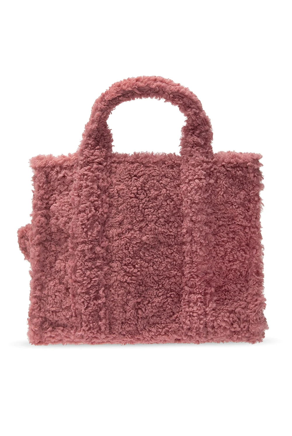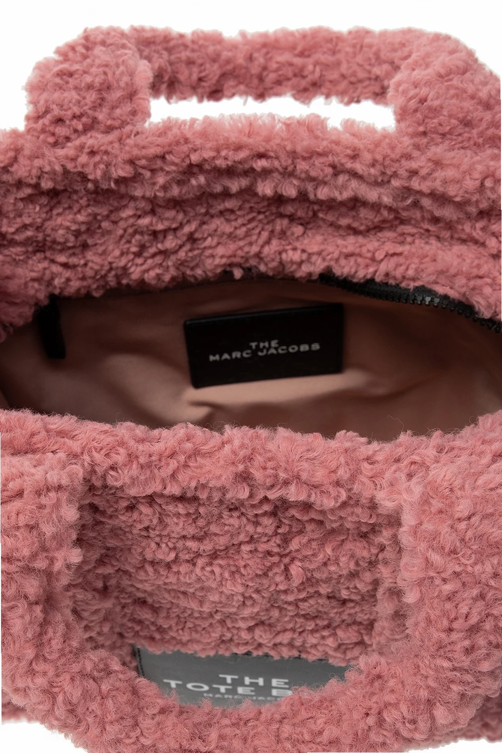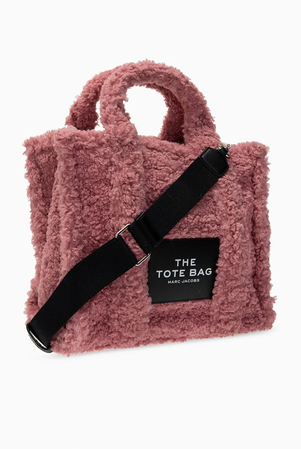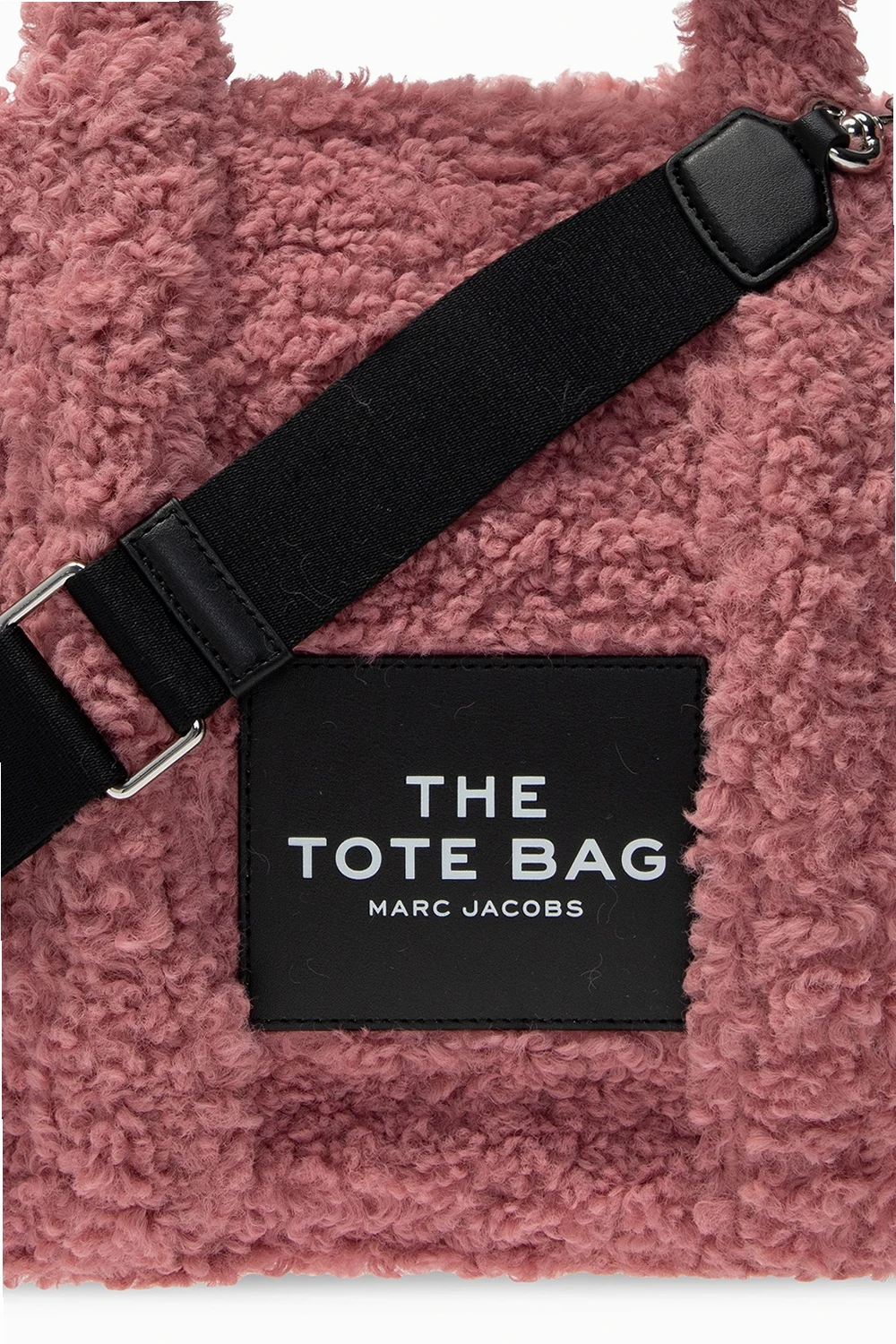 Różowa, futrzana torba na ramię, model 'The Medium Tote' Marc Jacobs. Zamykana na zamek. Ozdobiona czarną naszywką z białym logo. Trzy półokrągłe rączki. Dołączony czarny pas z możliwością regulacji długości. Wewnątrz komora oraz kieszeń zamykana na zamek. Metalowe wykończenie w kolorze srebrnym.