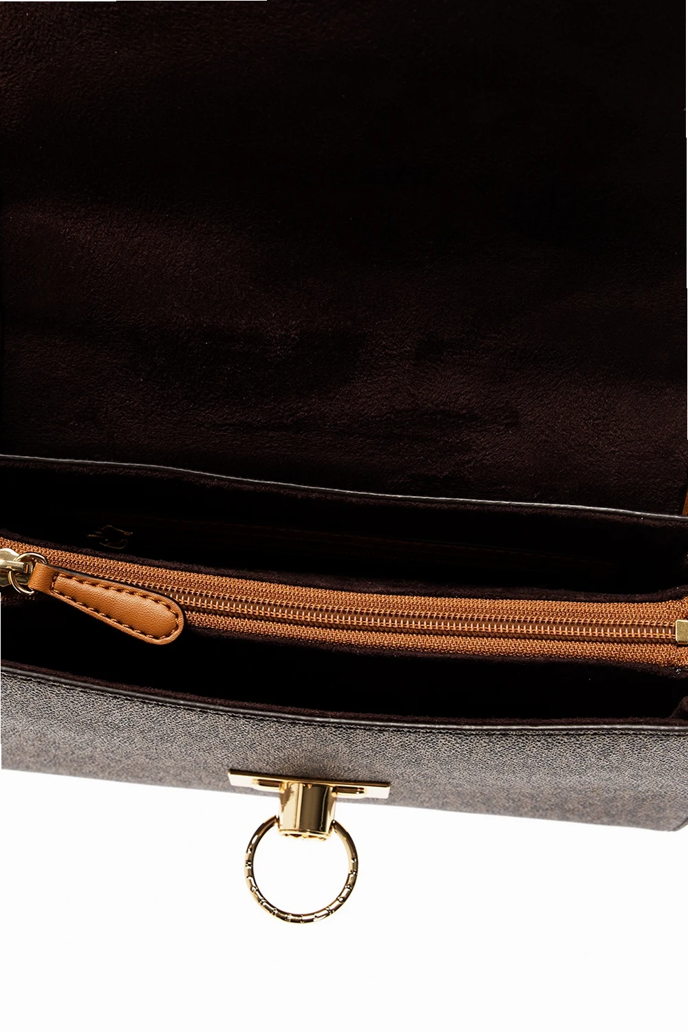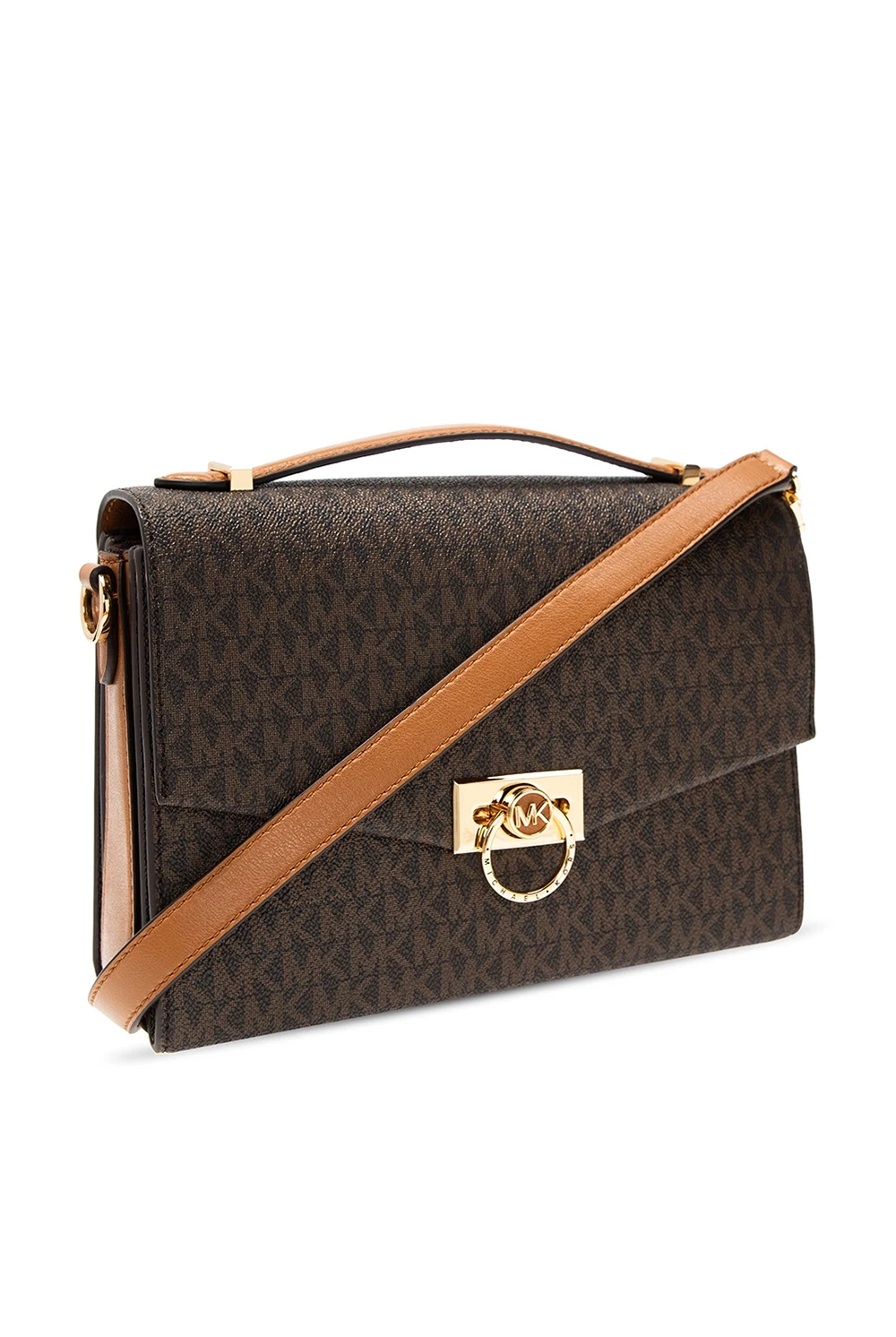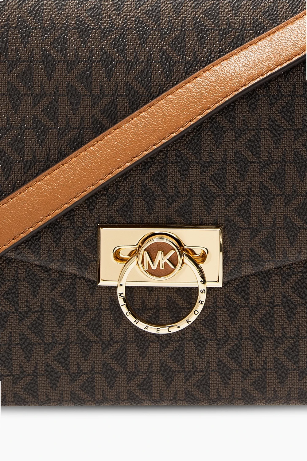 Brązowo-beżowa torba na ramię, model ’Hendrix’ Michael Michael Kors. Wykonana z płótna ozdobionego logo. Wykończona skórą. Dekoracyjne zamknięcie z logo. Z tyłu wsuwana kieszeń. Półokrągła rączka. Odpinany, regulowany pasek. Wewnątrz trzy oddzielne komory, jedna zamykana na zamek, kieszeń zamykana na zamek i wsuwana kieszeń. Metalowe elementy w kolorze złotym.