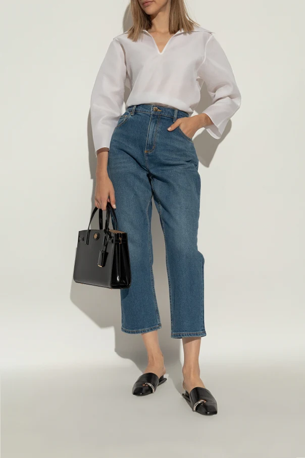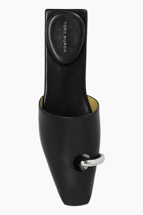 Detale: Kluczowym elementem dekoracyjnym jest metalowy pierścień umieszczony w przedniej części klapek, który przechodzi przez otwór w skórze, dodając nowoczesnego akcentu. Na wkładce wewnętrznej znajduje się logo marki Tory Burch .