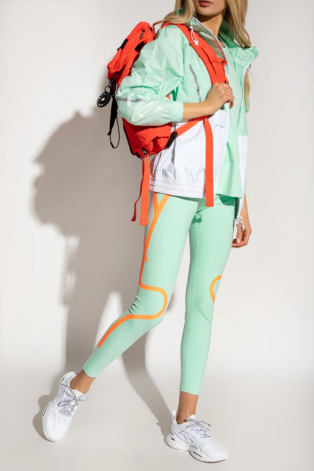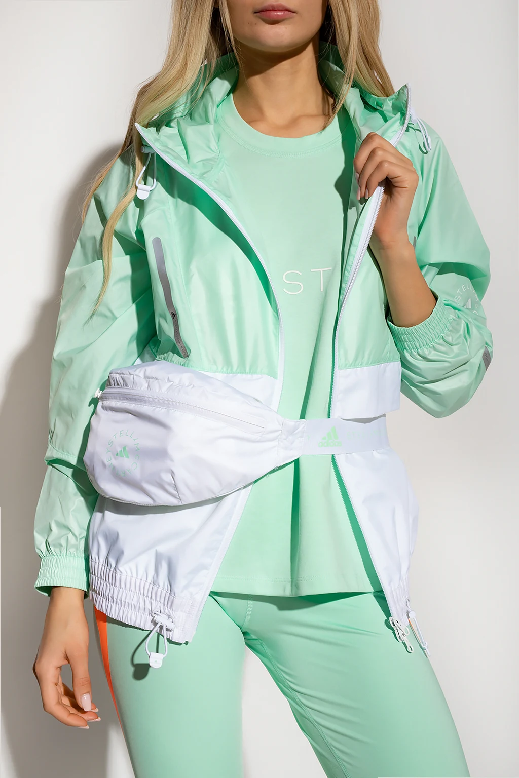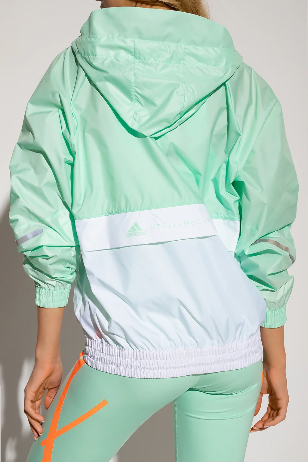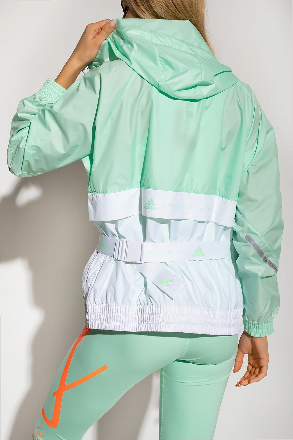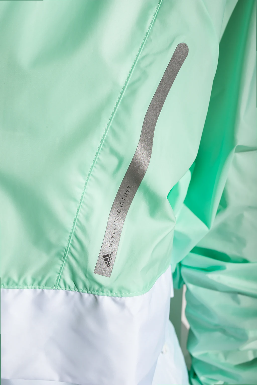 Biało-jasnozielona kurtka z kapturem ADIDAS by Stella McCartney. Wykonana z ‘Primegreen’: serii wysokowydajnych materiałów pochodzących z recyklingu oraz wyposażona w technologię ‘WIND.RDY.’, zapewniającą ochronę w wietrzne dni. Zapinana z przodu na dwubiegunowy zamek. Ozdobiona logo w kolorze białym oraz odblaskowymi elementami z przodu oraz na rękawach. Kaptur ściągany trokami wyposażony w usztywniany daszek. Całość można bez problemu spakować do dołączonej torby na pas, zapinanej na zamek oraz ozdobionej jasnozielonym logo. Dwie pojemne kieszenie zapinane na zamek, długie rękawy oraz dół wykończone ściągaczem.