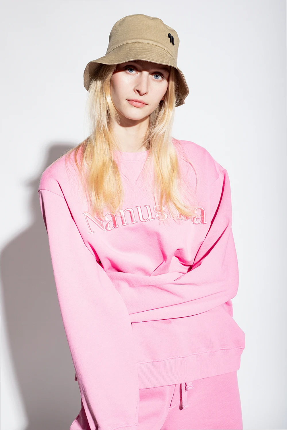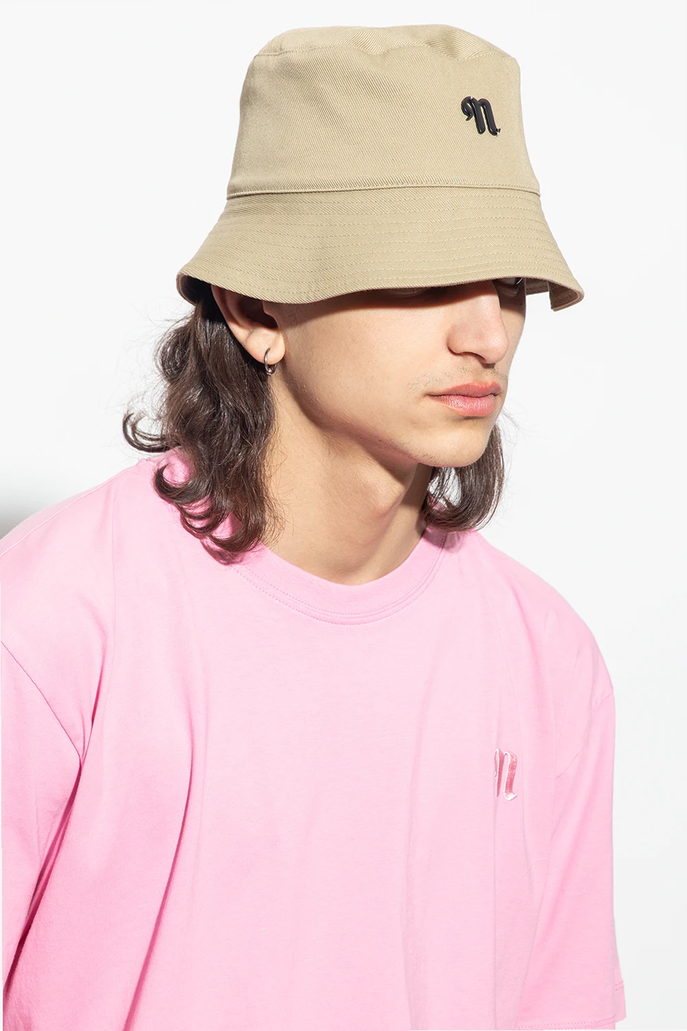 Beżowy kapelusz, model ‘Caran’ Nanushka. Wykonany z bawełny organicznej. Z przodu metalowa aplikacja z logo w kolorze czarnym.