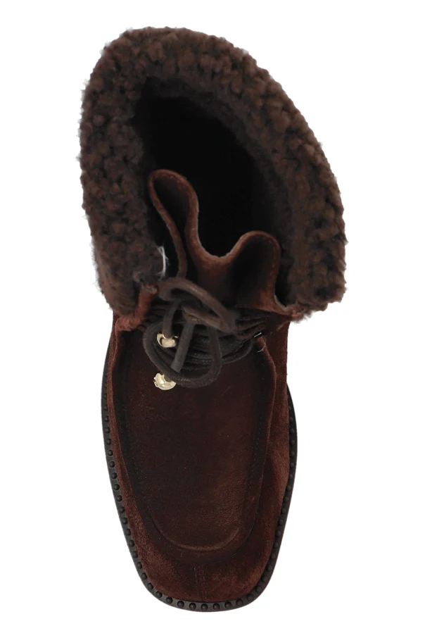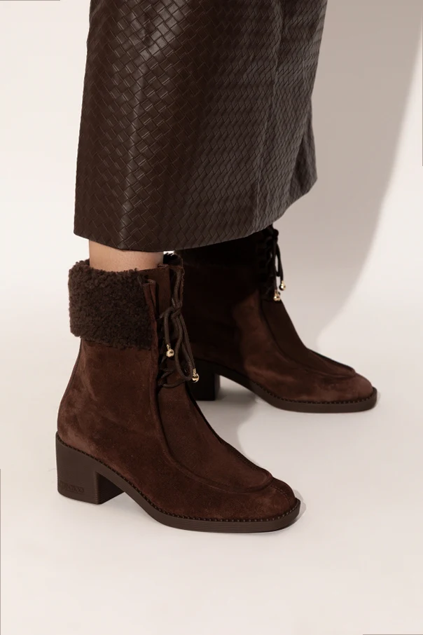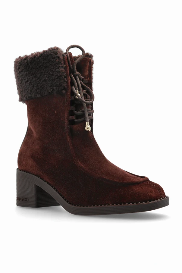 Sznurowanie z przodu, wykończone metalowymi akcentami w złotym odcieniu, nadaje projektowi niepowtarzalny, dekoracyjny sznyt. Precyzyjne wykonanie z naturalnej skóry, miękkiego futra oraz trwałej gumowej podeszwy podkreśla wyrafinowaną jakość oraz dbałość o szczegóły – znaki rozpoznawcze marki Jimmy Choo.