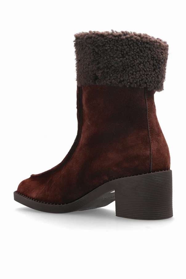 Botki na obcasie Hali autorstwa renomowanego domu mody Jimmy Choo to połączenie wyrafinowanego wzornictwa z niezrównanym komfortem. Głęboki, ciemny brąz zamszowej cholewki o matowym, miękkim wykończeniu subtelnie podkreślony szerokim obszyciem z futerka, buduje aurę ciepła i luksusu. Klasyczna wysokość do kostki oraz lekko zaokrąglony nosek harmonijnie komponują się z solidnym, szerokim obcasem typu block, gwarantując stabilność nawet podczas długiego użytkowania.