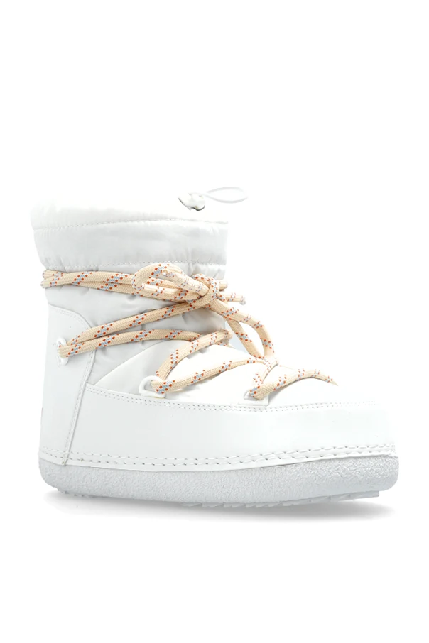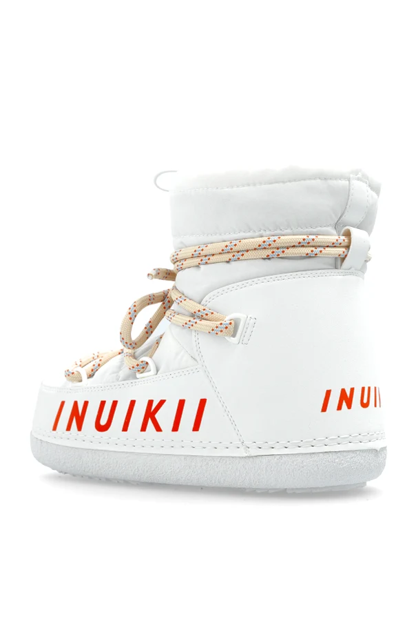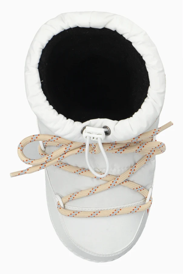 Wykonane z niezwykle gładkiej, wysokogatunkowej materii, śniegowce urzekają idealną bielą, podkreśloną subtelną linią przeszyć, które świadczą o solidności i dbałości o każdy detal. Wyraziste, białe sznurówki z pomarańczowymi akcentami, przeplecione przez szerokie pętle materiałowe, stanowią nieoczywisty element ozdobny, dodając całości oryginalności i charakteru.
