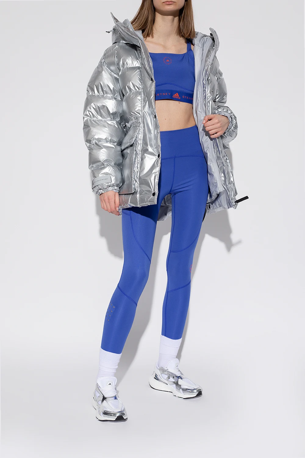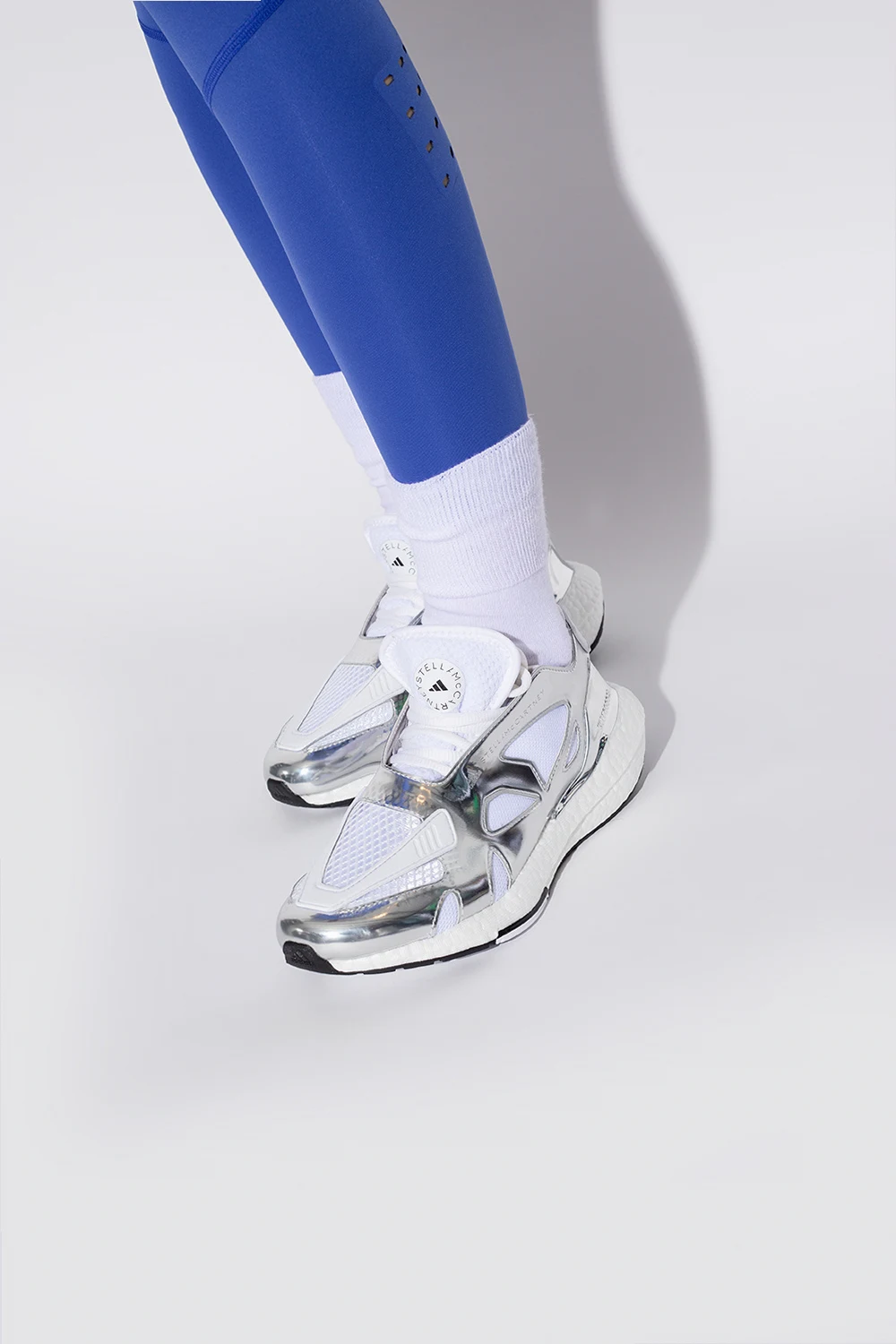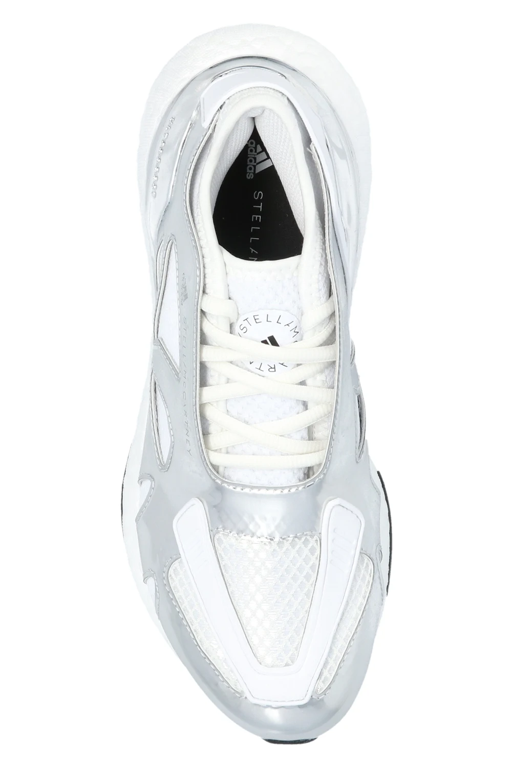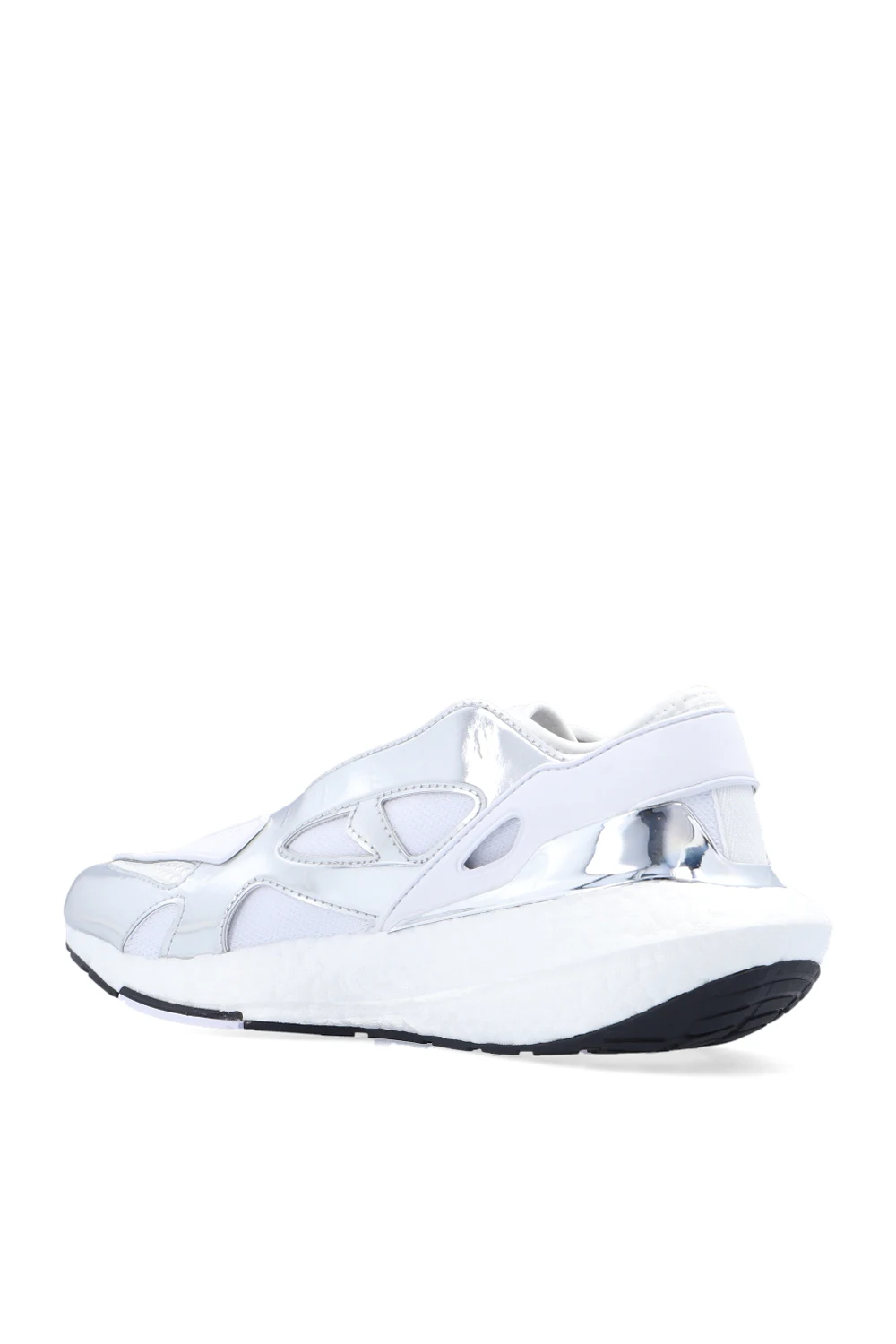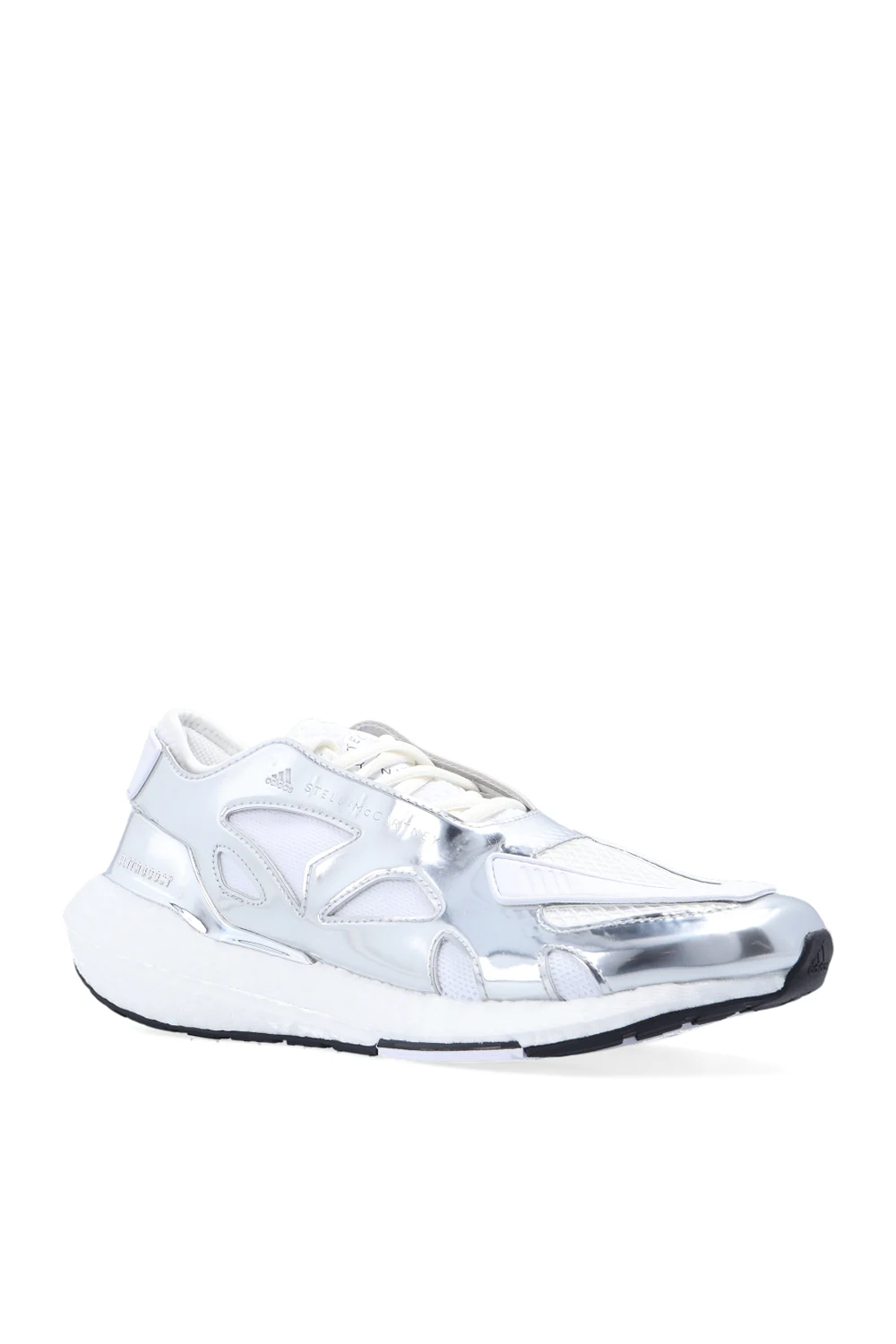 Sznurowane buty sportowe w kolorze biało-srebrnym, model ‘Ultraboost 22’ ADIDAS by Stella McCartney. Wykonane z materiałów z recyklingu. Z boku ozdobione logo. Czarno-biała, gumowa podeszwa.