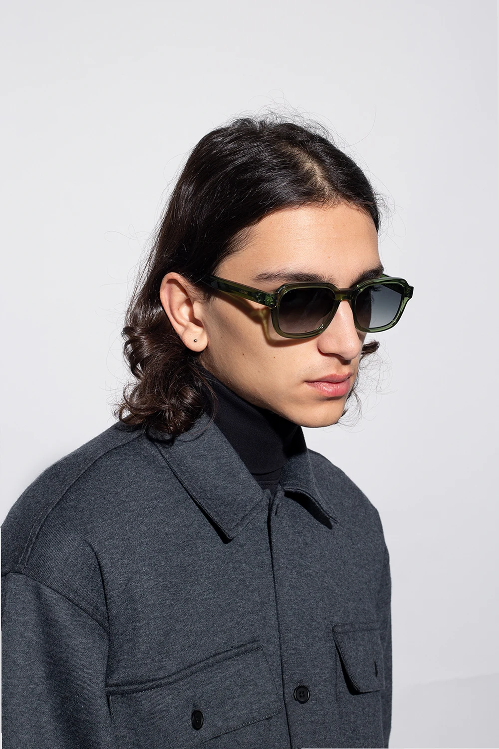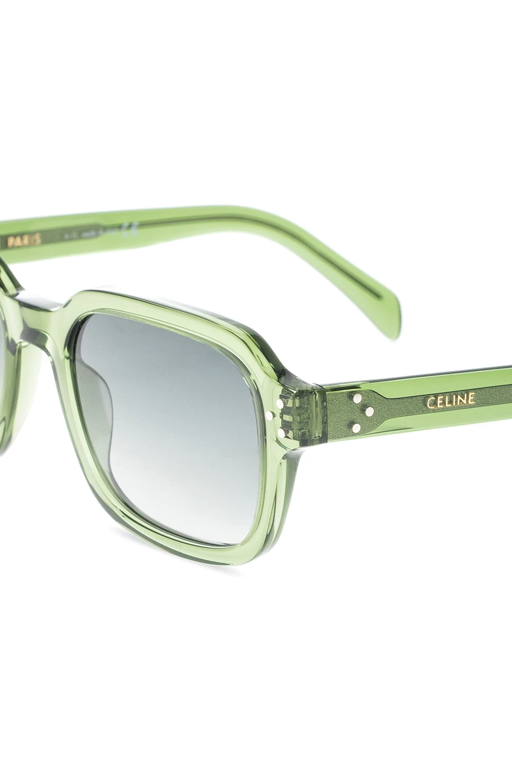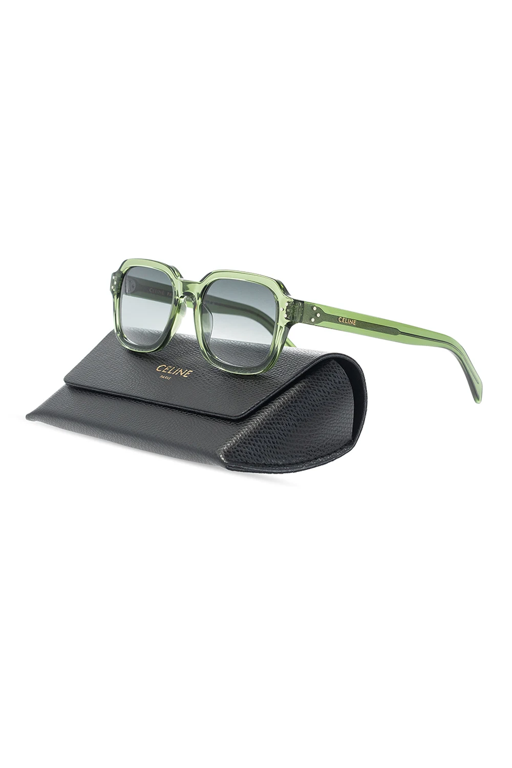 Zielone, wzorzyste okulary przeciwsłoneczne Celine. Po bokach wytłoczone logo oraz aplikacja w kolorze złotym. Szare, certyfikowane soczewki 100% UVA/UVB. Dołączone skórzane etui.