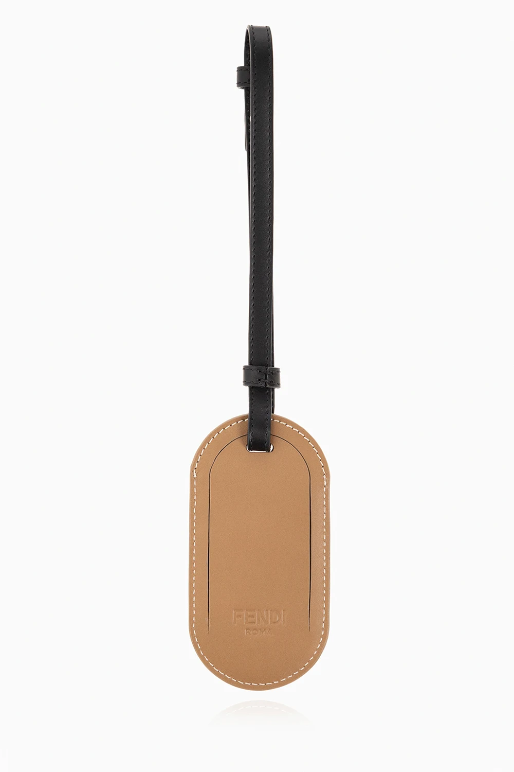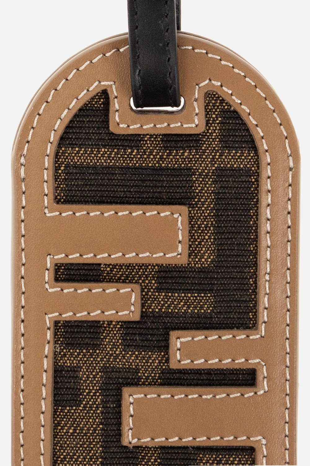 Brązowo-czarny identyfikator Fendi. Wykonany ze skóry cielęcej. Ozdobiony monogramem. Z tyłu wytłoczone logo oraz plakietka. Czarny, skórzany pasek.