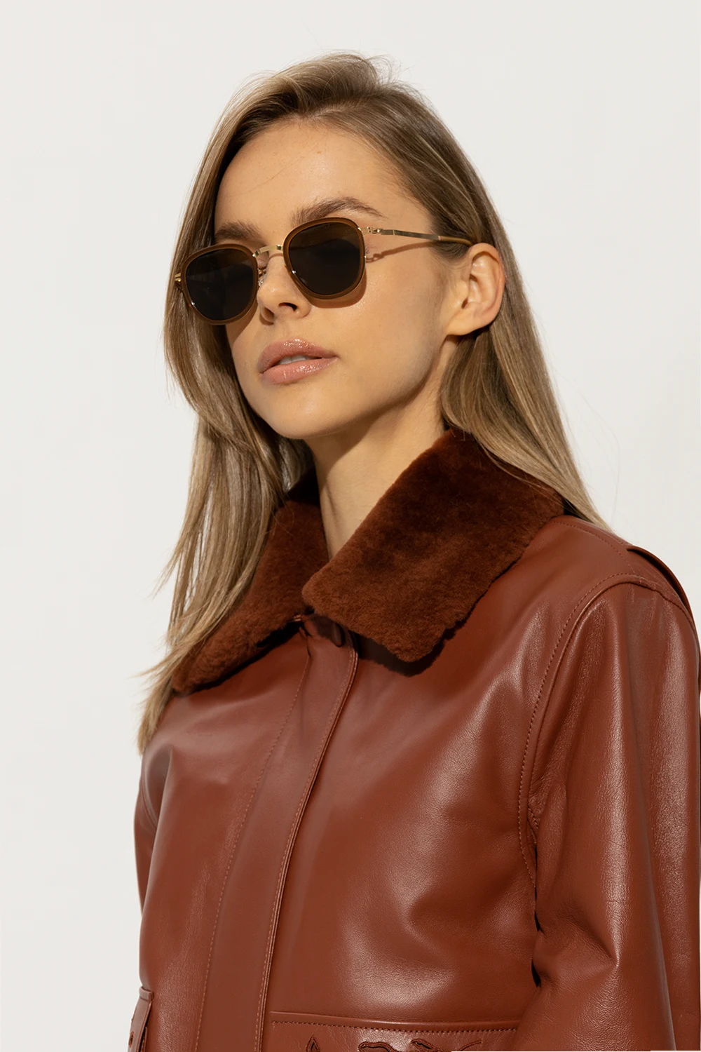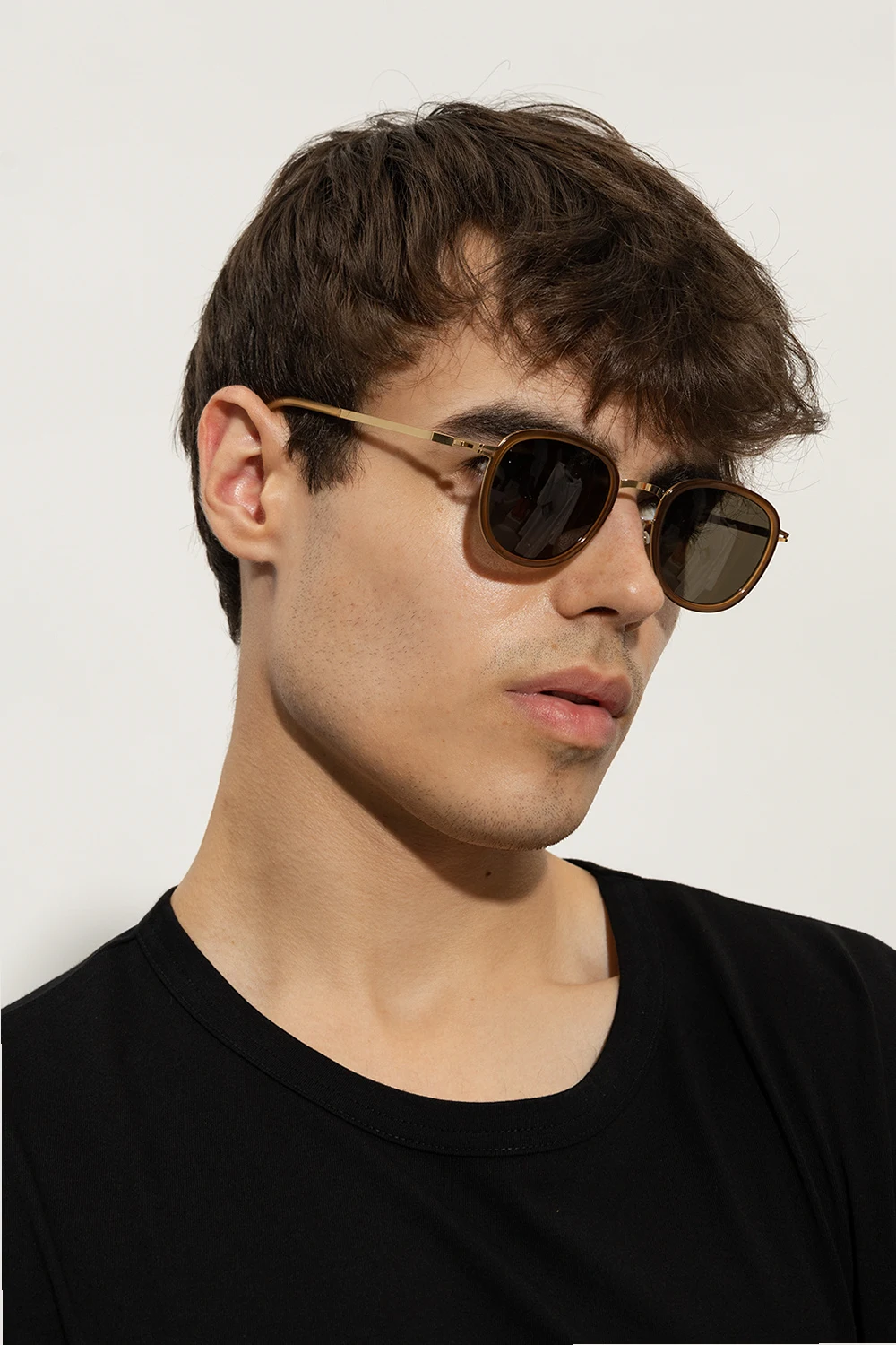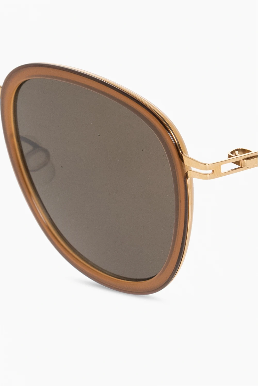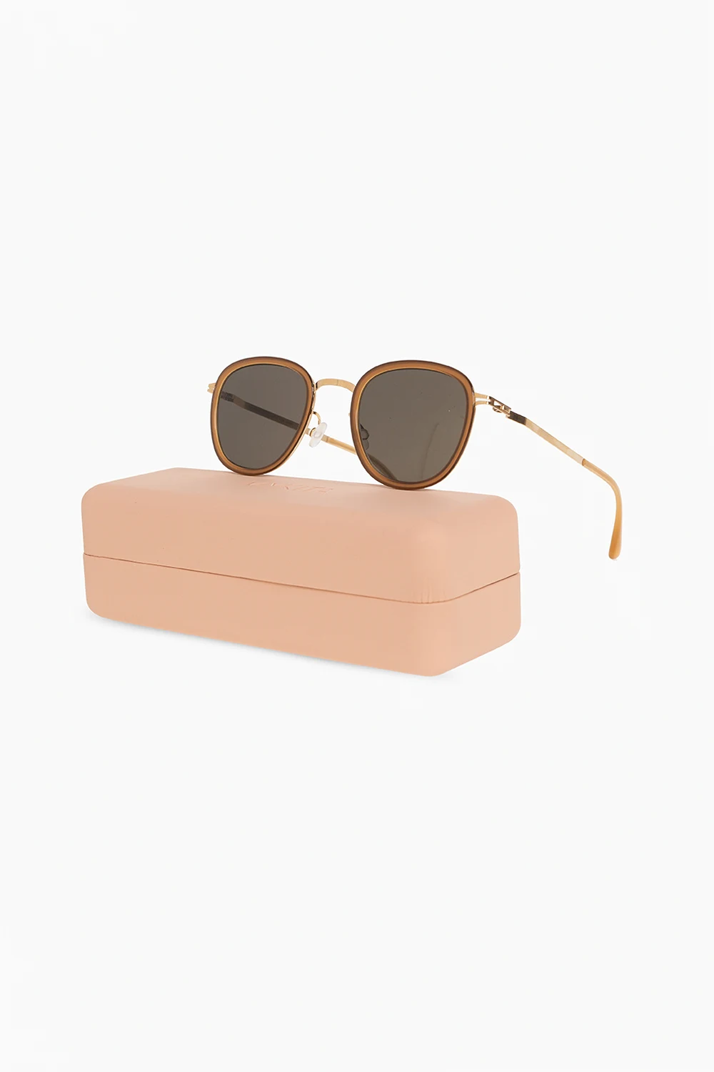 Okulary przeciwsłoneczne w kolorze brązowo-złotym, model ‘Helmi’ Mykita, kolekcja ‘Lite’. Wykonane ze stali nierdzewnej. Okrągłe oprawki z pierścieniem z lśniącego acetatu. Zauszniki z opatentowanym, bezśrubowym systemem zawiasów zakończone transparentną nakładką. Pojedynczy mostek wykończony silikonowymi, ruchomymi noskami. Szare, przyciemniane szkła z powłoką antyrefleksyjną, zapewniające całkowitą ochronę przed promieniami UVA i UVB, a także maksymalną ochronę przed odblaskami. Dołączone etui. Ręcznie wykonane w Berlinie.