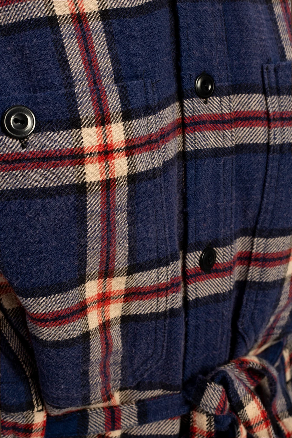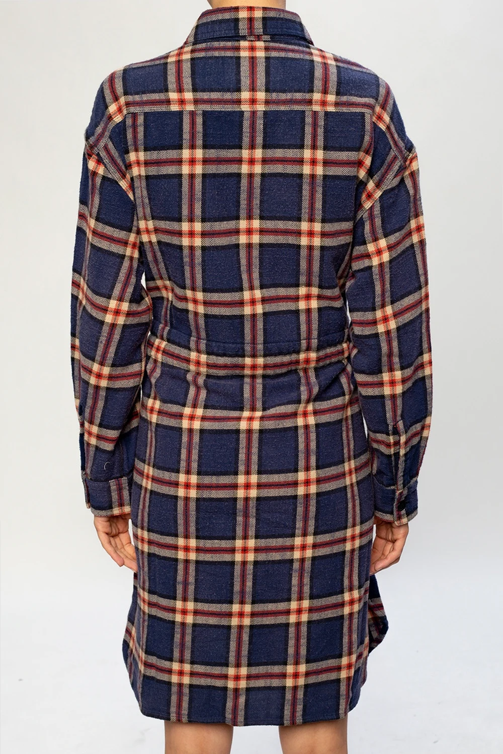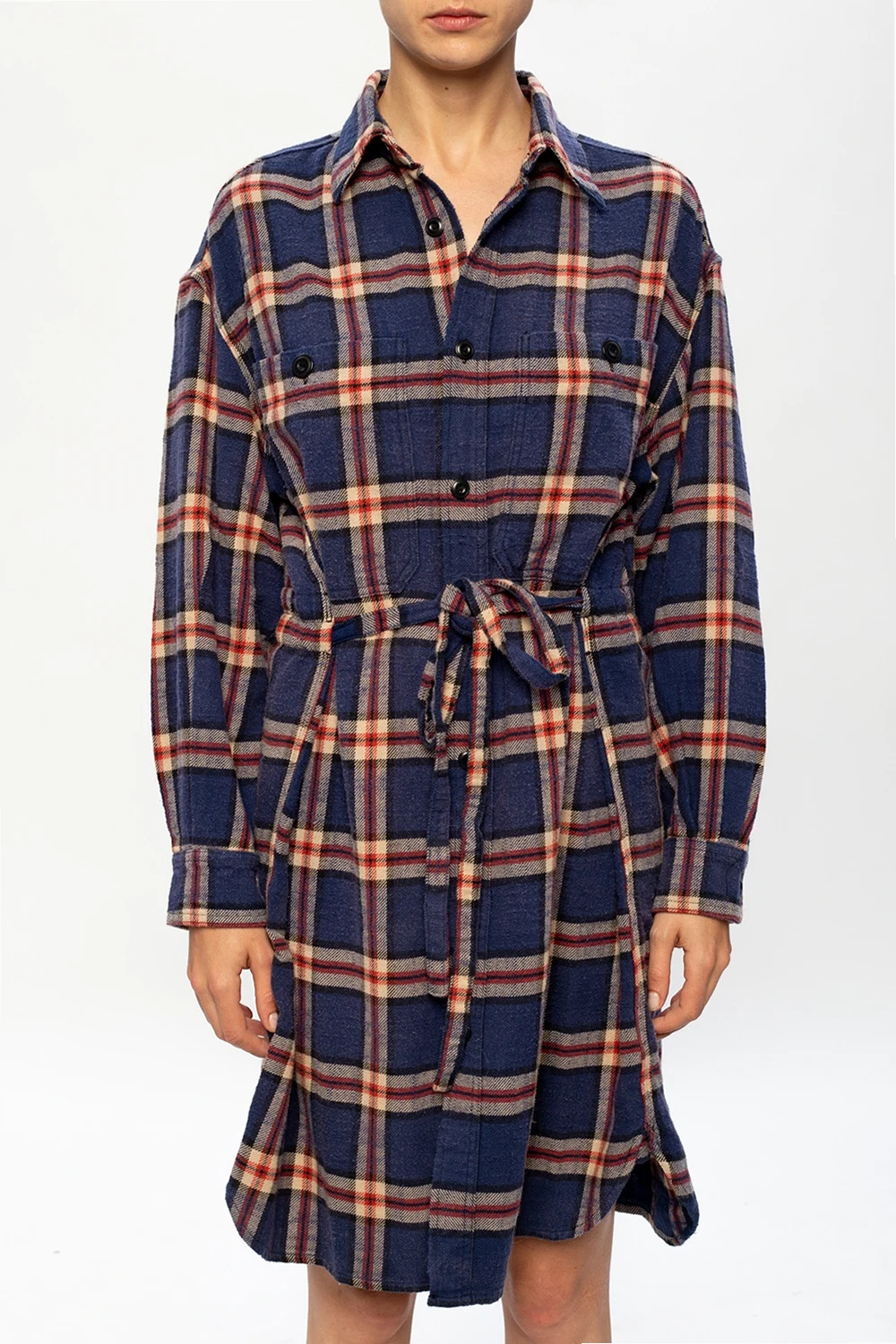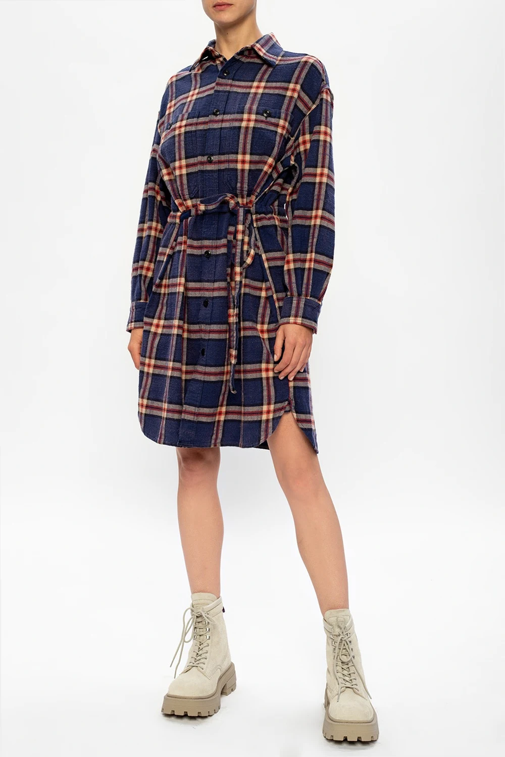 Granatowo-beżowo-czerwona, bawełniana sukienka R13. Zapinana na guziki oraz wiązana paskiem w talii. Ozdobiona wzorem w kratę. Z przodu dwie kieszenie zapinane na guzik.
