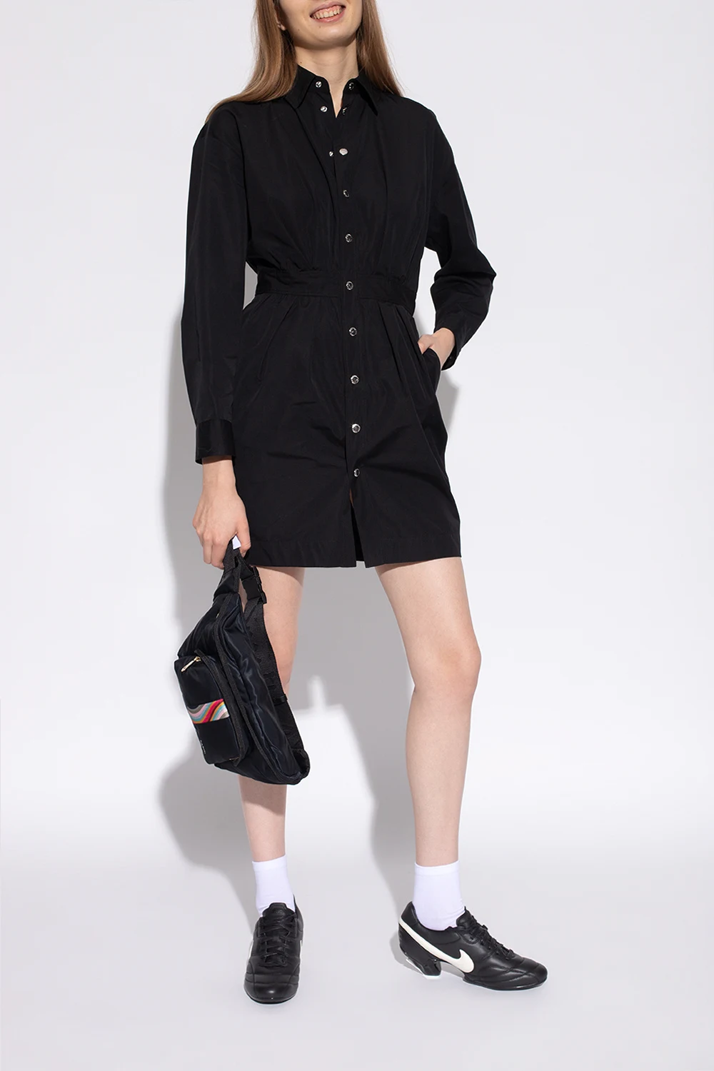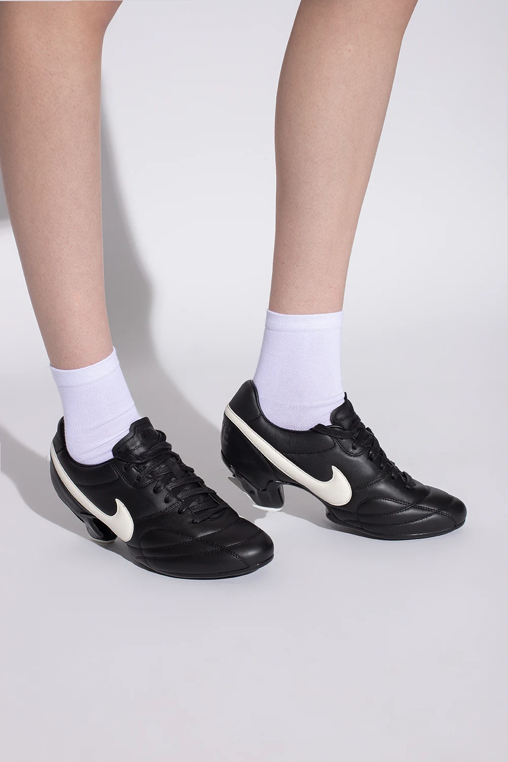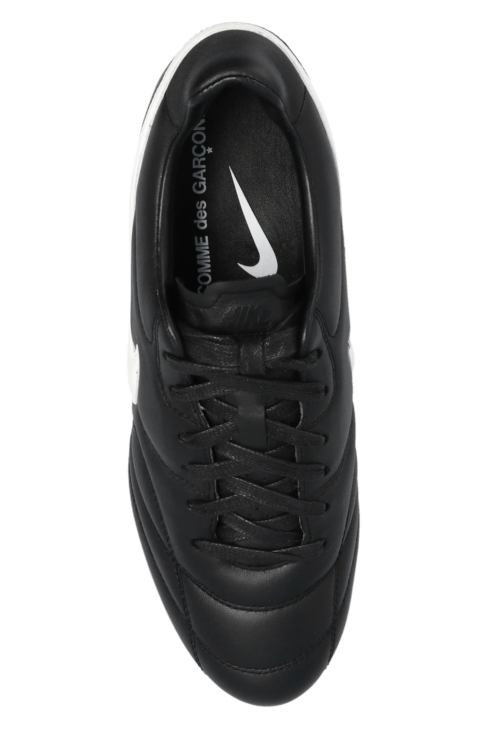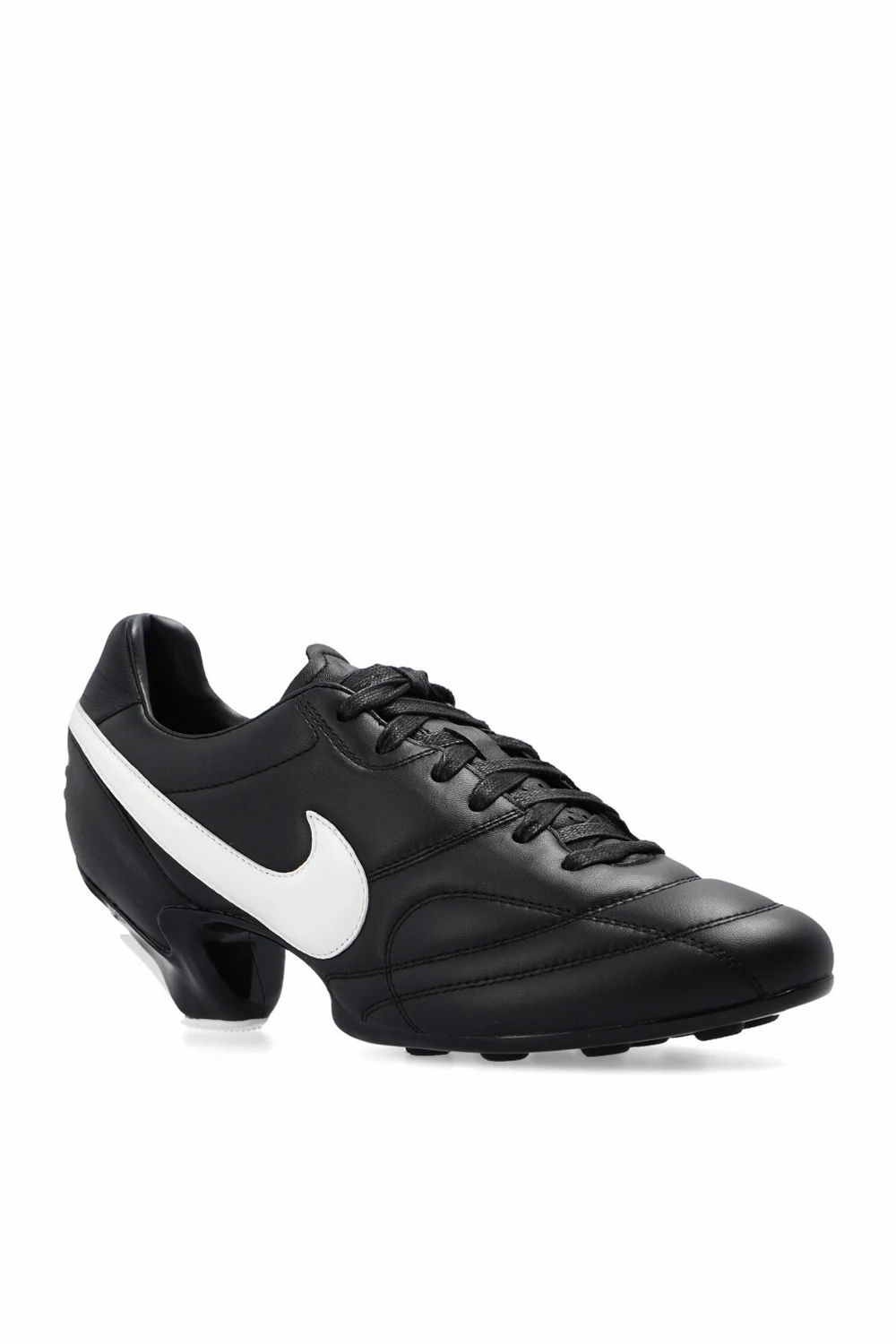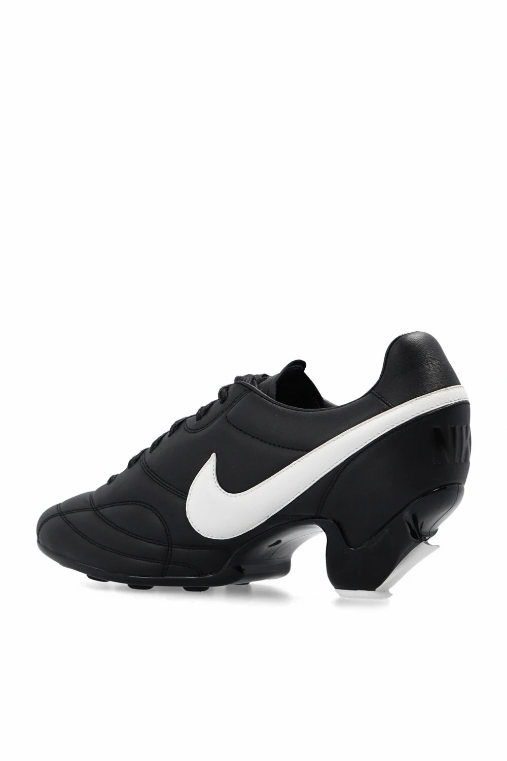 Czarne, sznurowane buty sportowe na obcasie Comme des Garçons x Nike. Wykonane ze skóry. Po bokach logo w kolorze białym. Z tyłu wytłoczone logo. Biała, gumowa podeszwa.