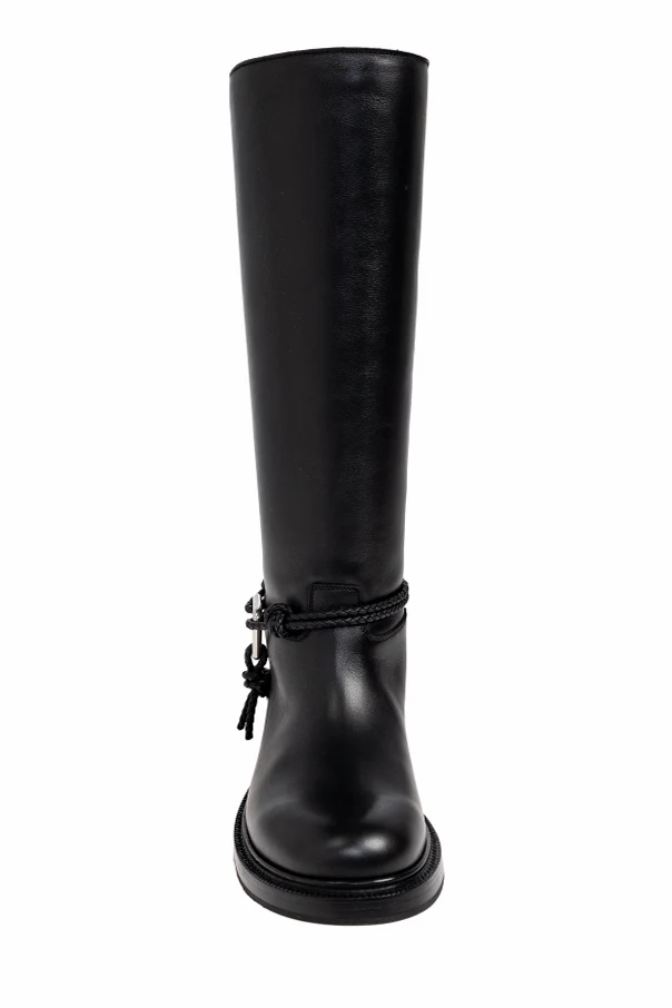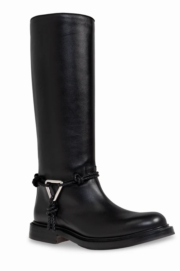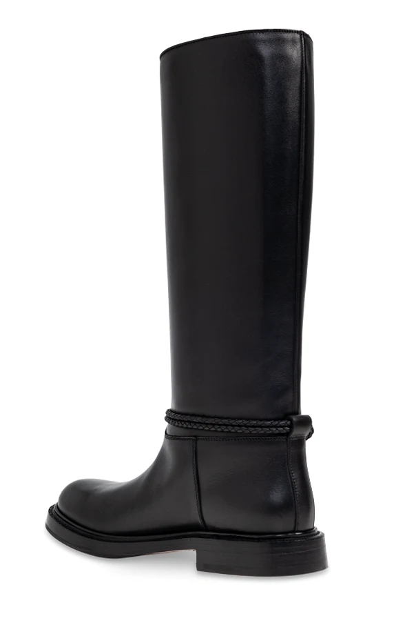 Skórzane kozaki ‘James’ marki Bottega Veneta to esencja współczesnej elegancji, łącząca w sobie prostotę formy z luksusowym wykończeniem. Wysoka, sięgająca do kolan cholewka harmonijnie współgra z minimalistycznym kształtem oraz lekko zaokrąglonym noskiem i solidną, płaską podeszwą. Gładka, błyszcząca skóra cielęca, wykorzystana zarówno na zewnątrz, jak i wewnątrz buta, zapewnia wyjątkowy komfort oraz trwałość, a także podkreśla wyrafinowany charakter produktu.
