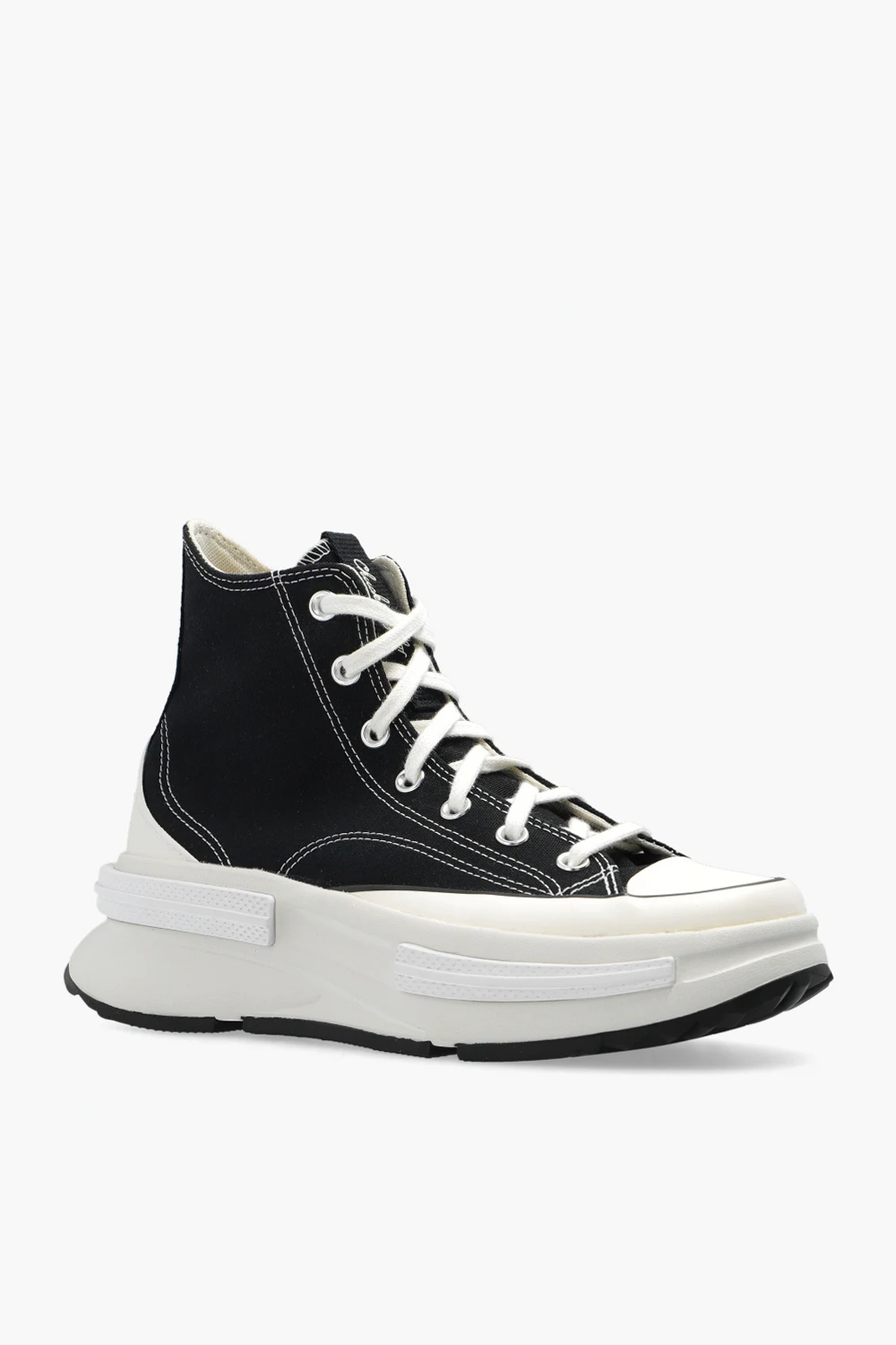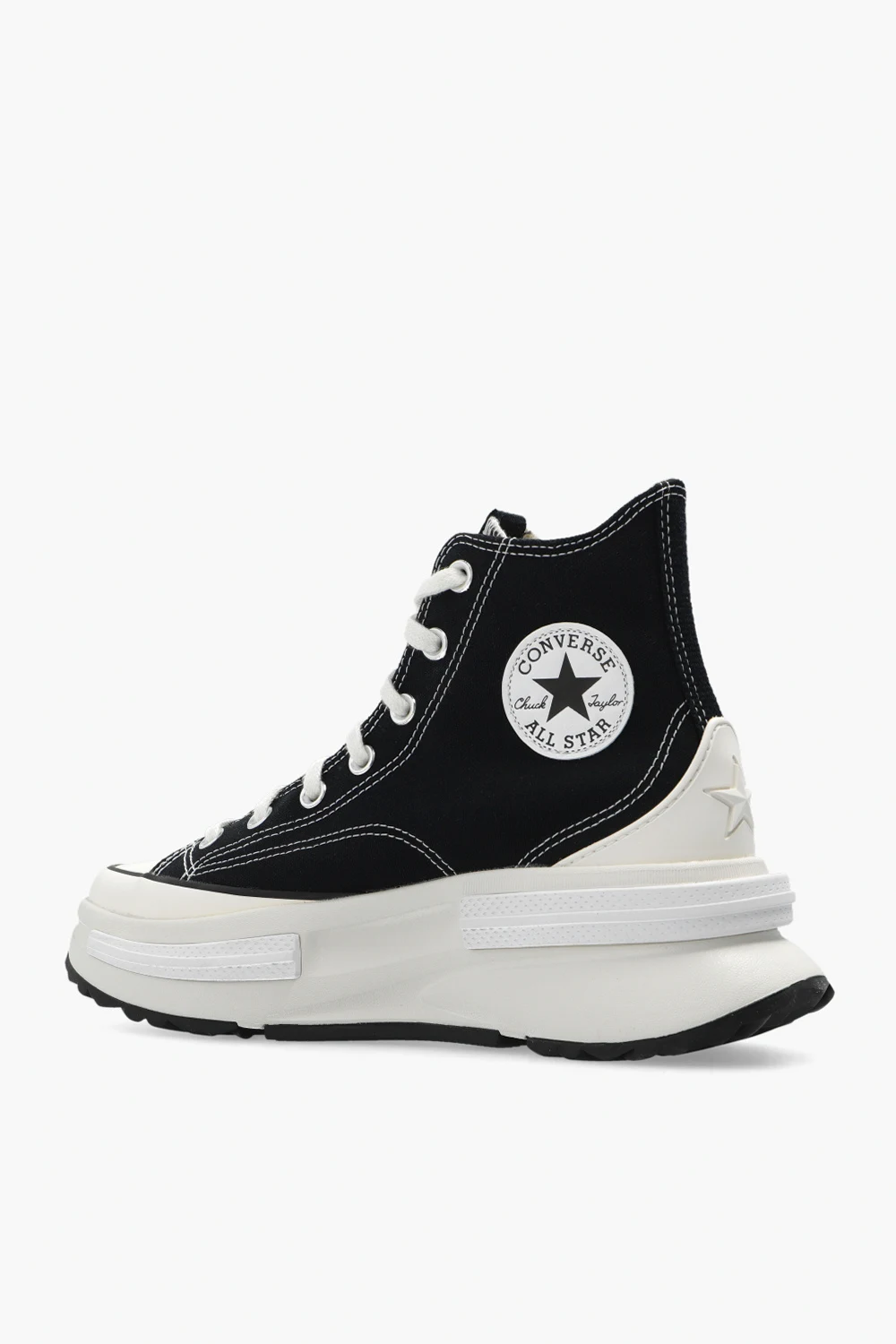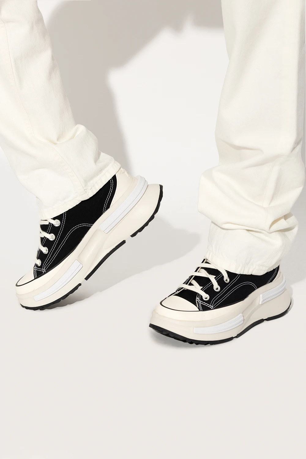 Czarno-kremowe, sznurowane buty sportowe za kostkę, model ‘Run Stal Legacy CX’ Converse. Wykonane z materiału. Ozdobione kultową naszywką z logo. Wkładka amortyzująca OrthoLite. Czarno-kremowo-biała, gumowa podeszwa.