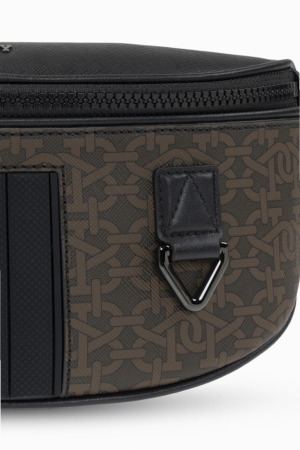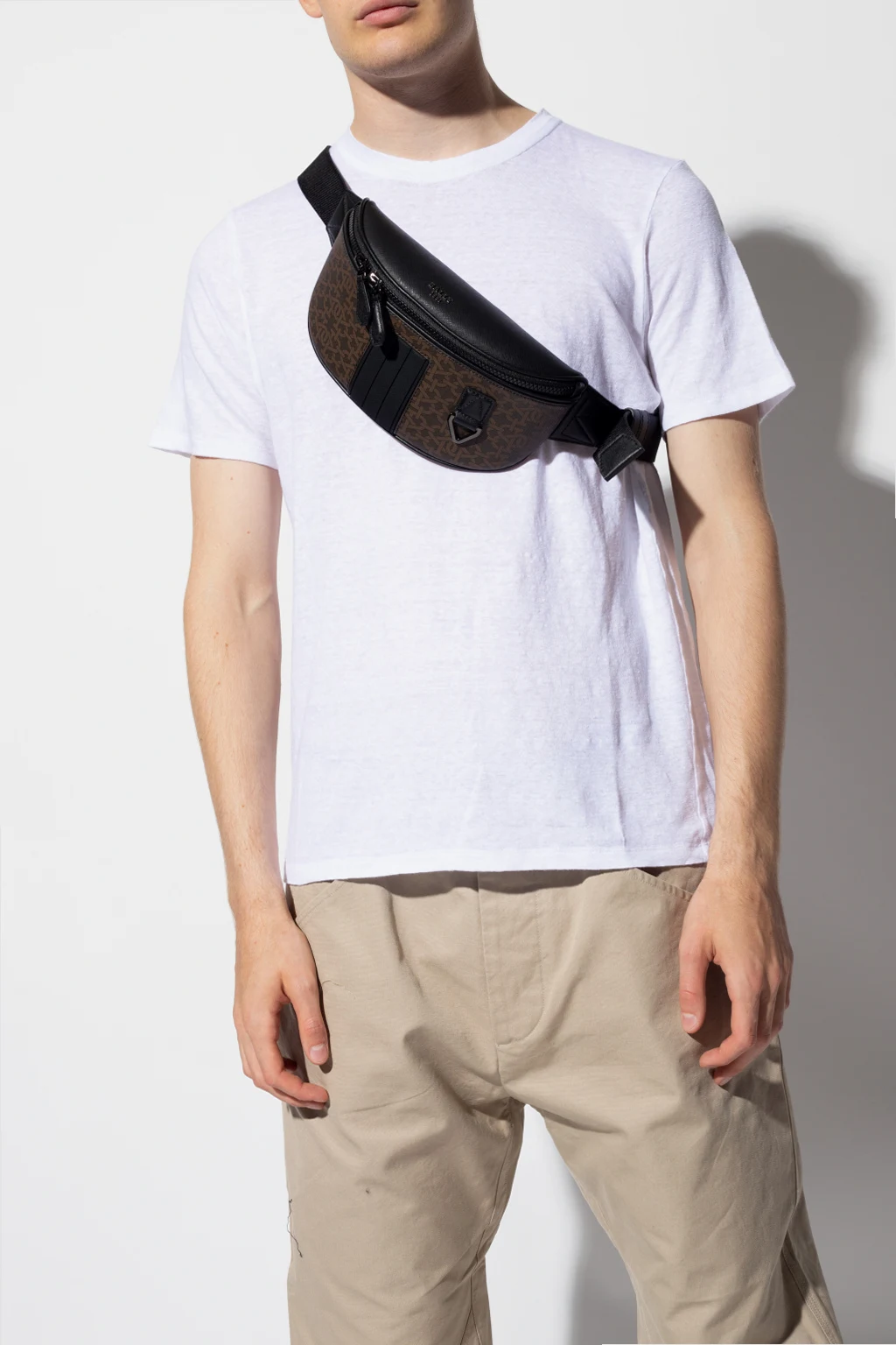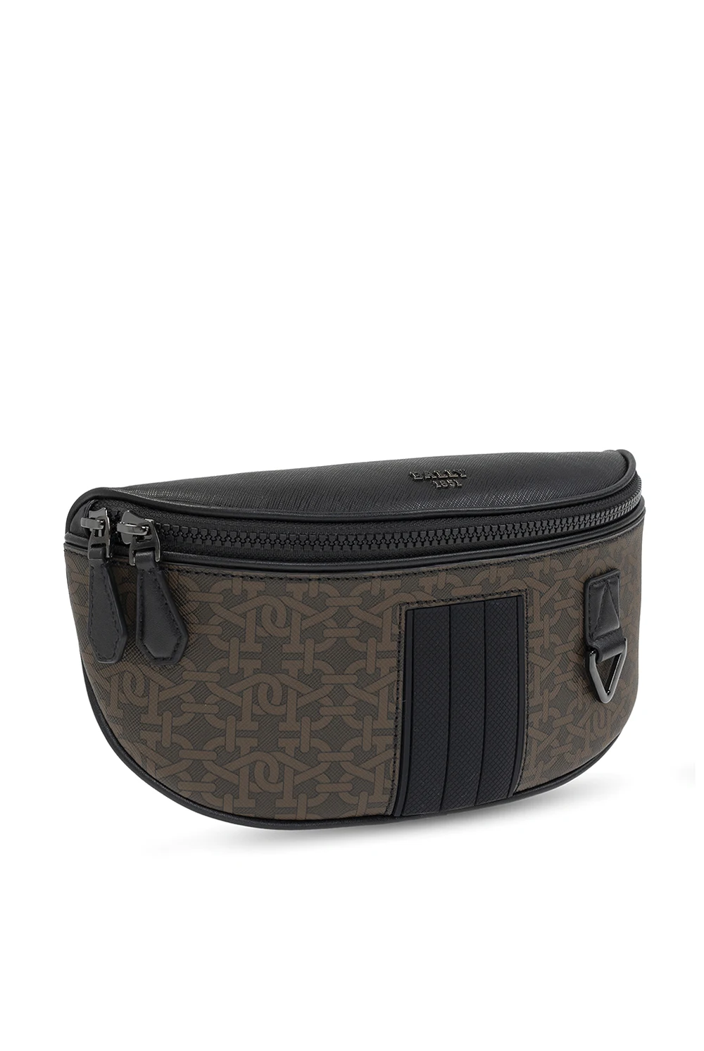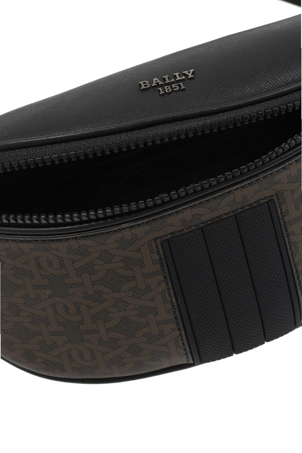 Brązowo-czarna torba na pas, model ‘Matey’ Bally. Zamykana na dwubiegunowy zamek. Z przodu ozdobiona monogramem oraz aplikacjami. Na górze metalowe, wypukle logo w kolorze srebrnym. Z tyłu kieszeń zamykana na zamek. Pas z możliwością regulacji długości. Wewnątrz komora oraz wsuwana kieszeń. Metalowe elementy w kolorze czarnym.