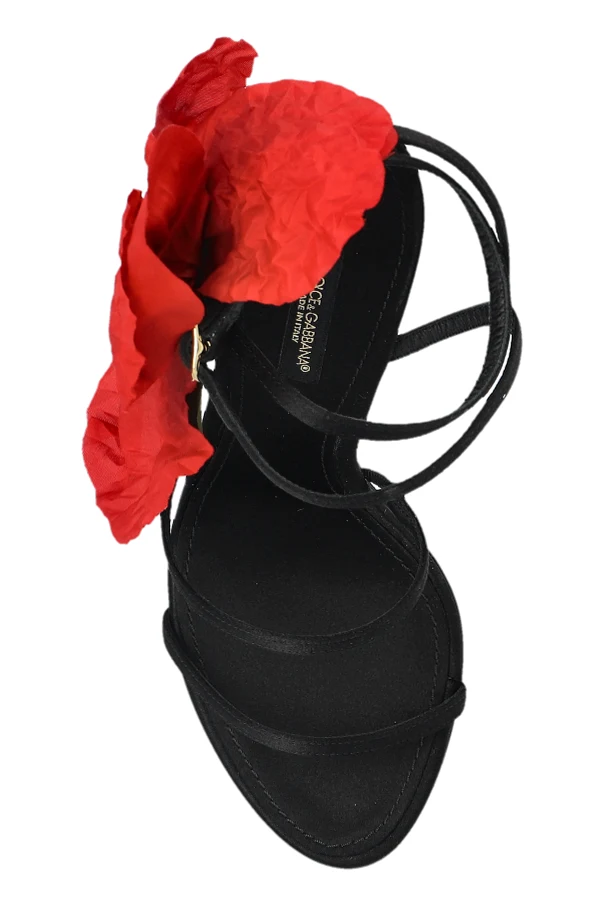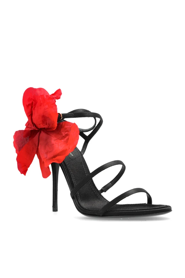 Minimalistyczne paski w głębokim odcieniu czerni harmonijnie oplatają stopę, zapewniając nie tylko stabilność, ale także zmysłową lekkość kroku. Urzekający detal stanowi spektakularna, trójwymiarowa aplikacja w postaci czerwonego kwiatu, wykonana z kunsztownego, lekkiego materiału, umieszczona z zewnętrznej strony przy pięcie.