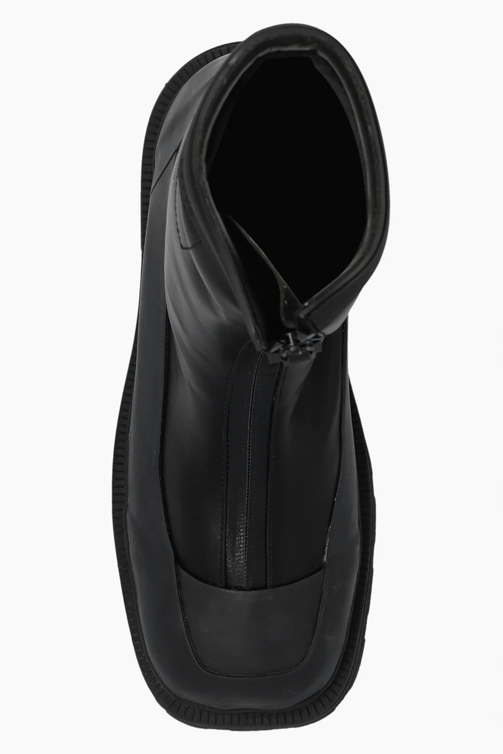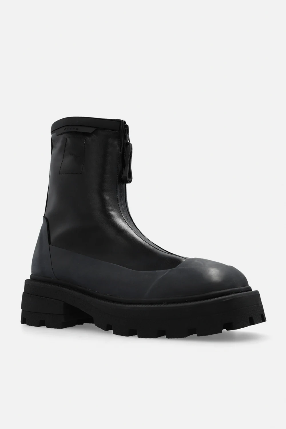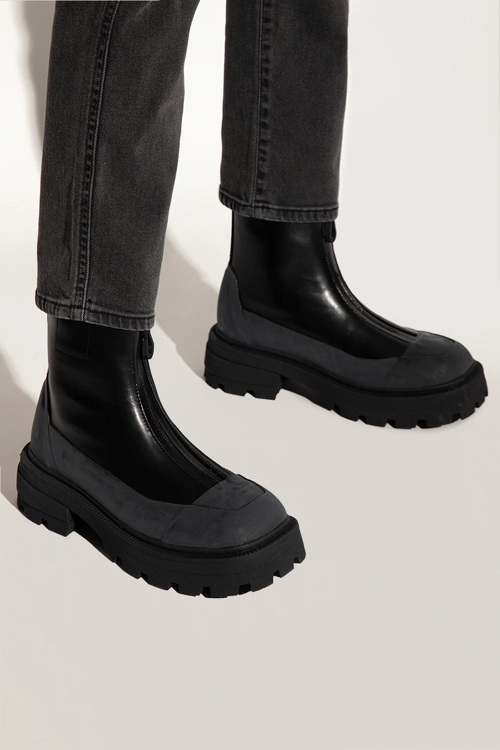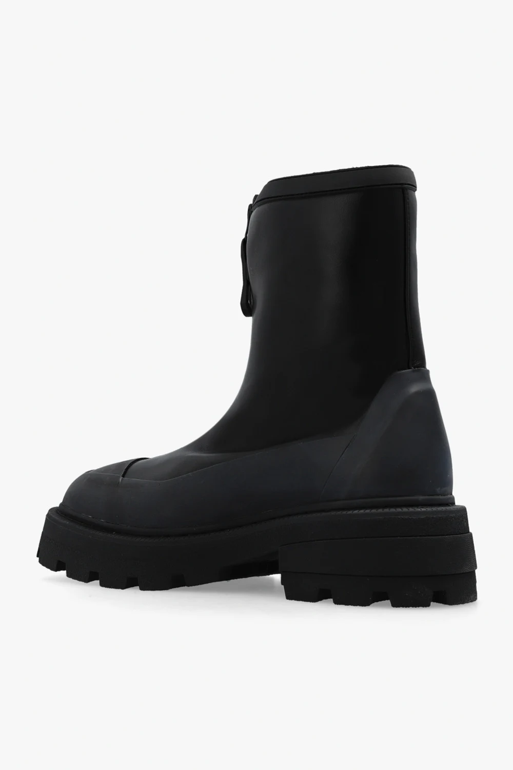 Czarne botki, model ‘Aquari’ Eytys. Wykonane z imitacji skóry i wykończone gumą. Zapinane z przodu na zamek. Ozdobione wytłoczonym logo. Czarna, masywna podeszwa wykonana z gumy.