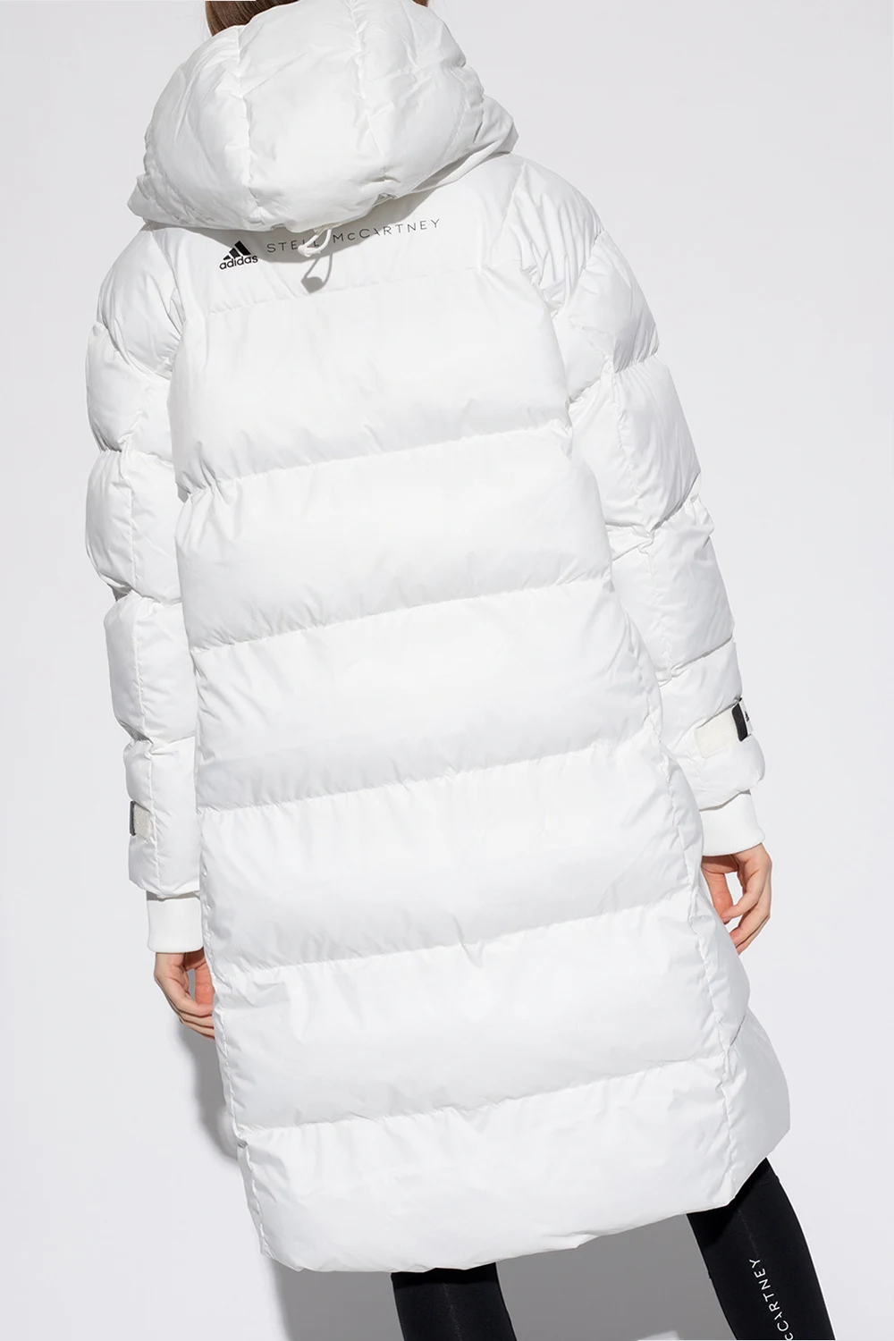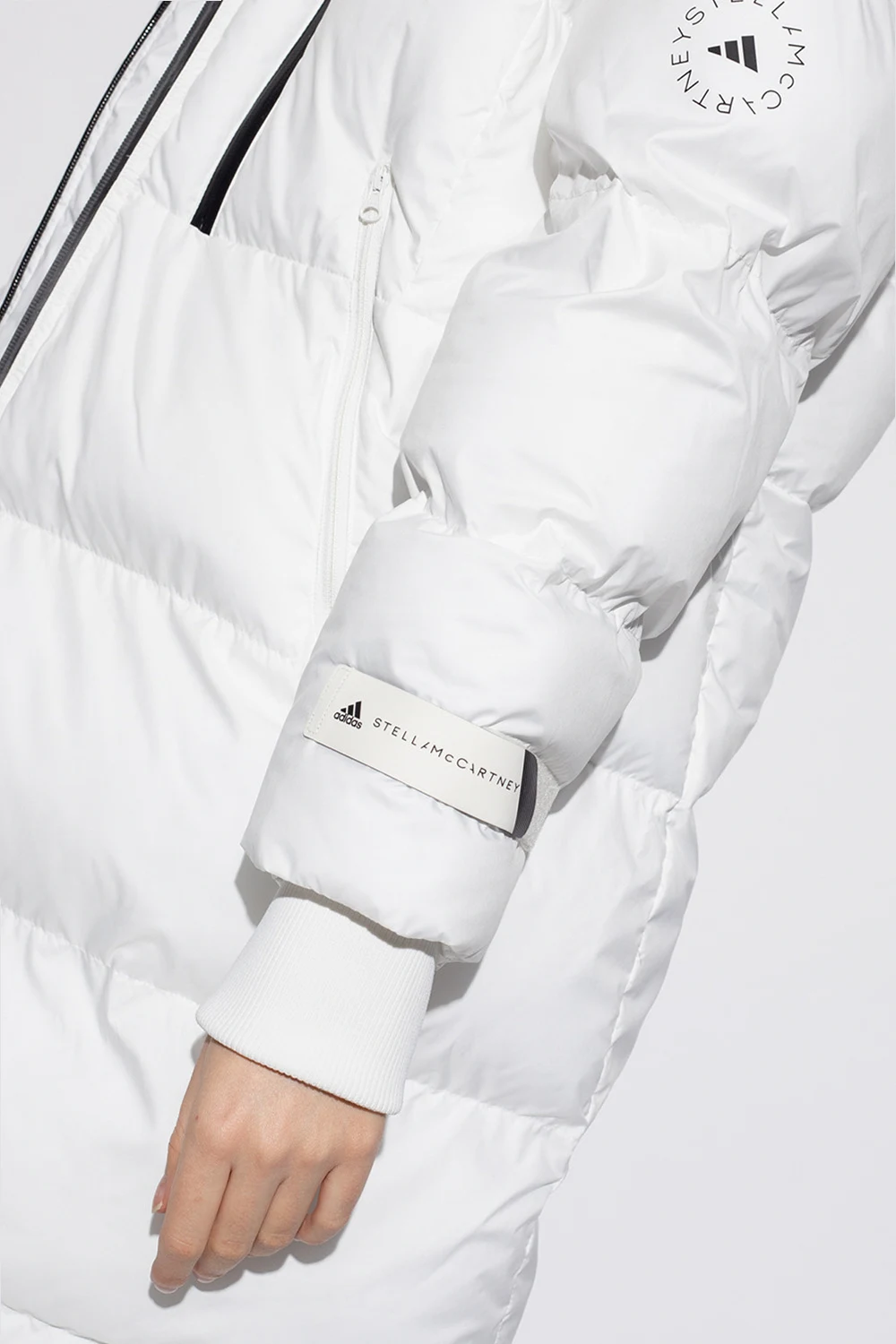 Biała, puchowa kurtka z odpinanym kapturem ADIDAS by Stella McCartney. Wykonana z materiału pochodzącego z recyklingu. Zapinana na dwubiegunowy zamek. Ozdobiona przeszyciami oraz logo. Trzy kieszenie zapinane na zamek. Długie rękawy zakończone ściągaczem oraz zapięciem na rzep.