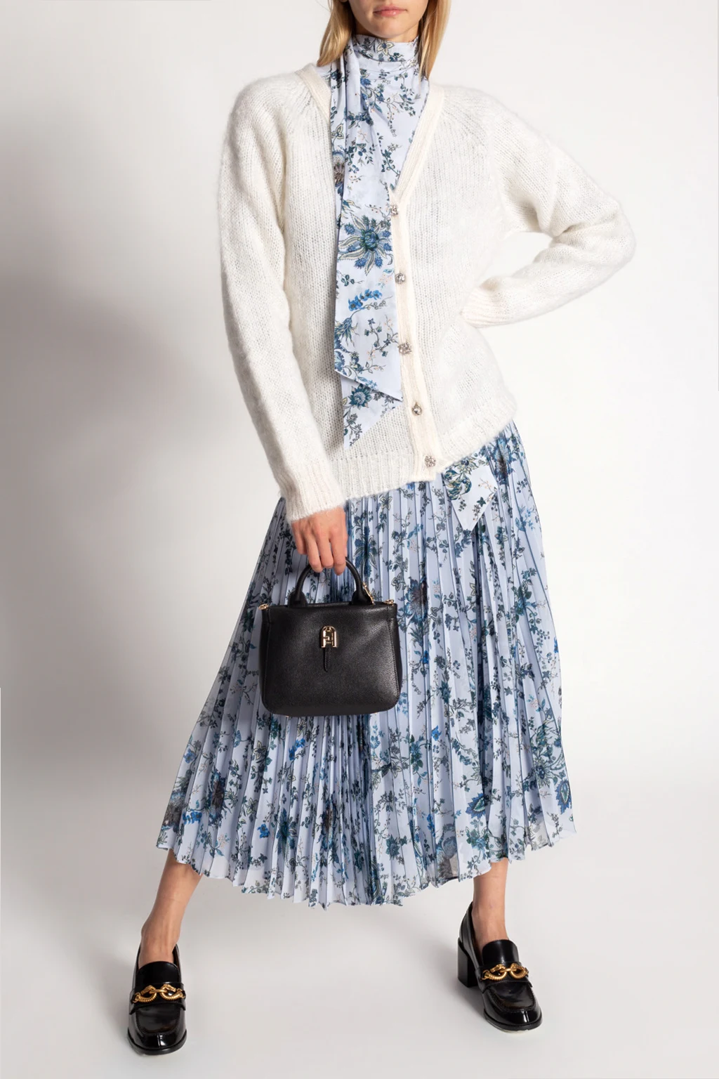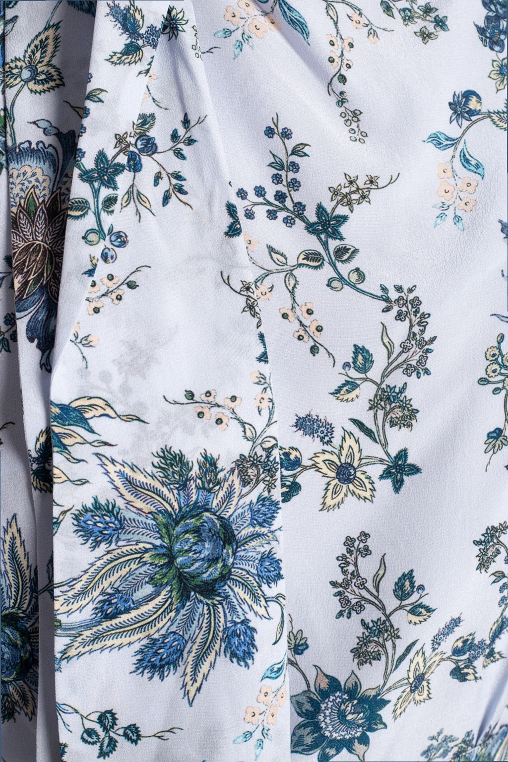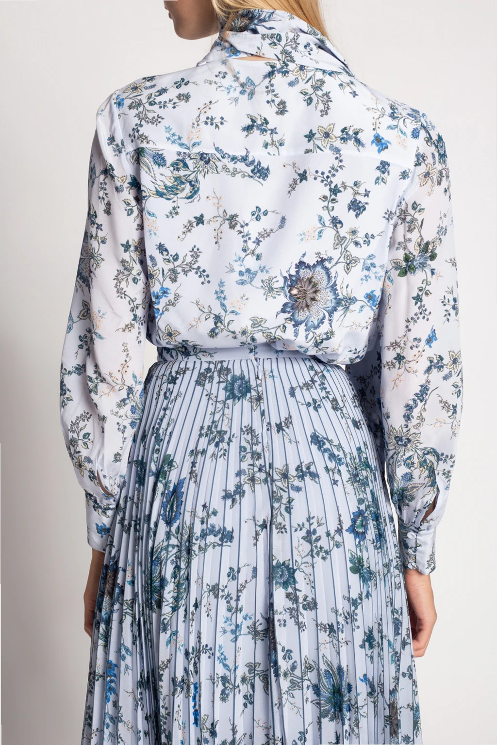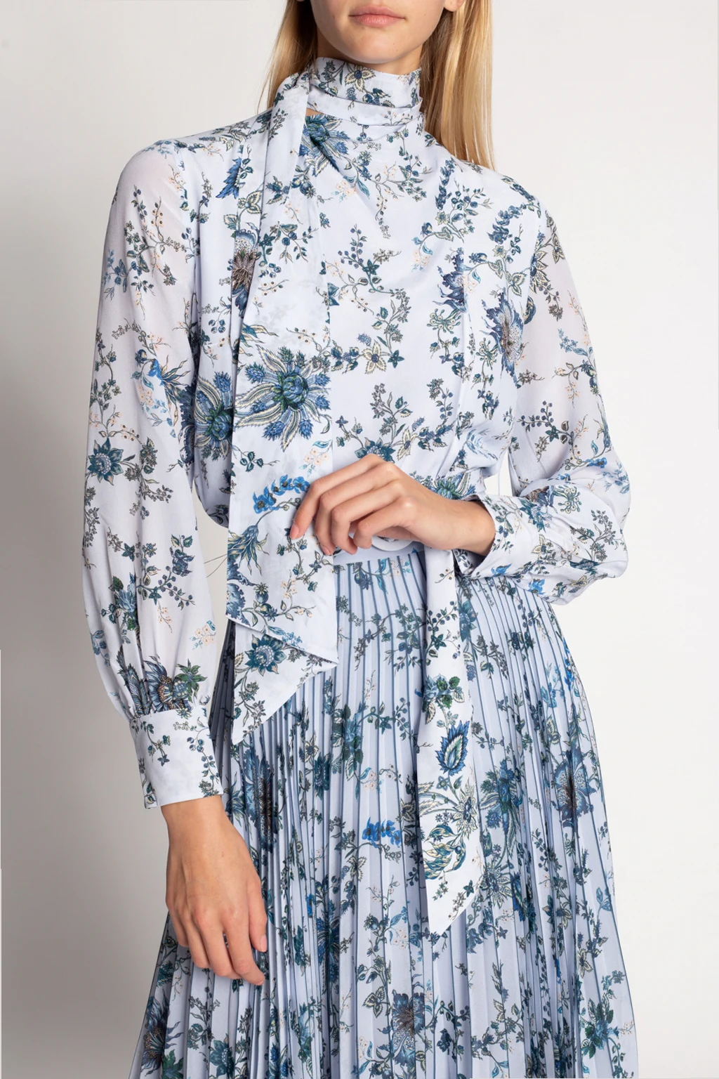 Niebieski, jedwabny top Erdem. Ozdobiony kolorowym wzorem z motywem kwiatowym. Dekoracyjne wiązanie przy dekolcie. W talii pas z klamrą. Długie rękawy zakończone mankietem z zapięciem na guzik.