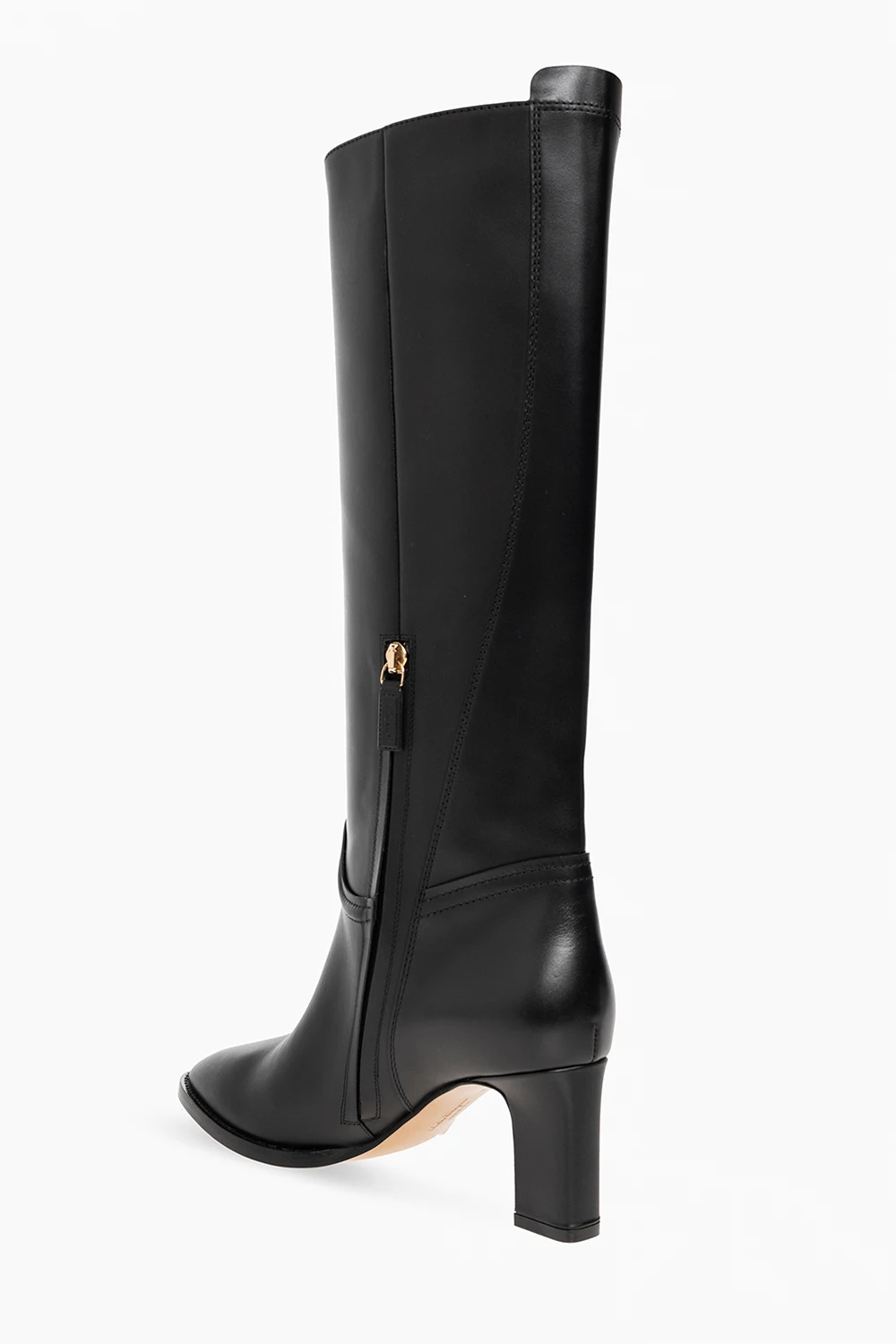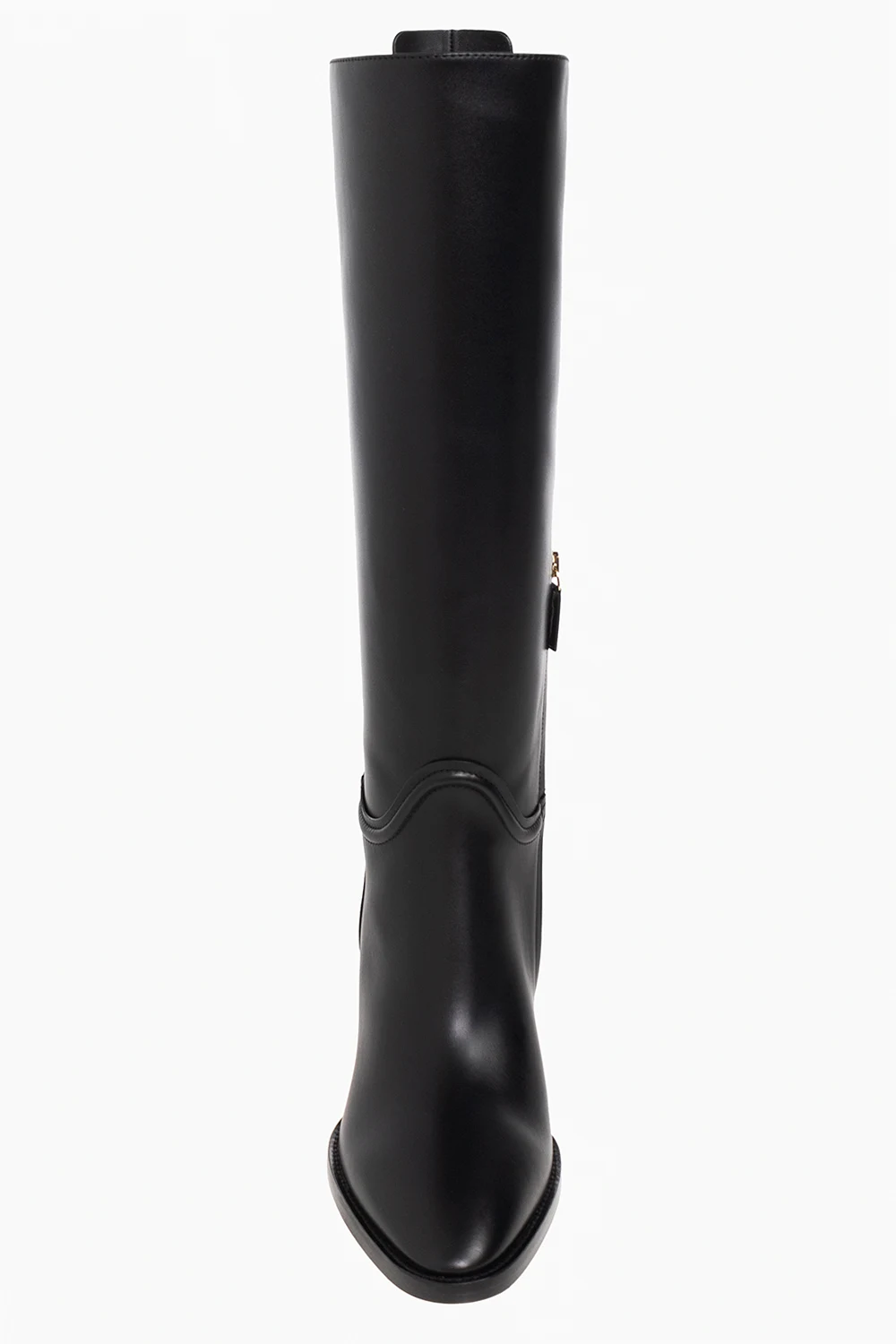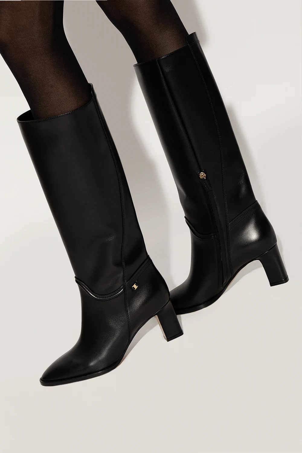 Czarne kozaki na obcasie, model ‘Torris’ Salvatore Ferragamo. Wykonane ze skóry. Zapinane na zamek. Ozdobione aplikacją z wytłoczonym logo w kolorze złotym. Migdałowy nosek. Beżowa, skórzana podeszwa ze wstawkami antypoślizgowymi.