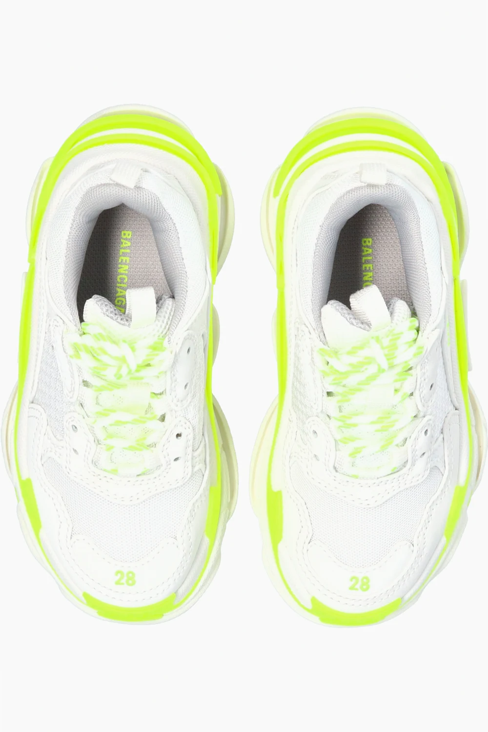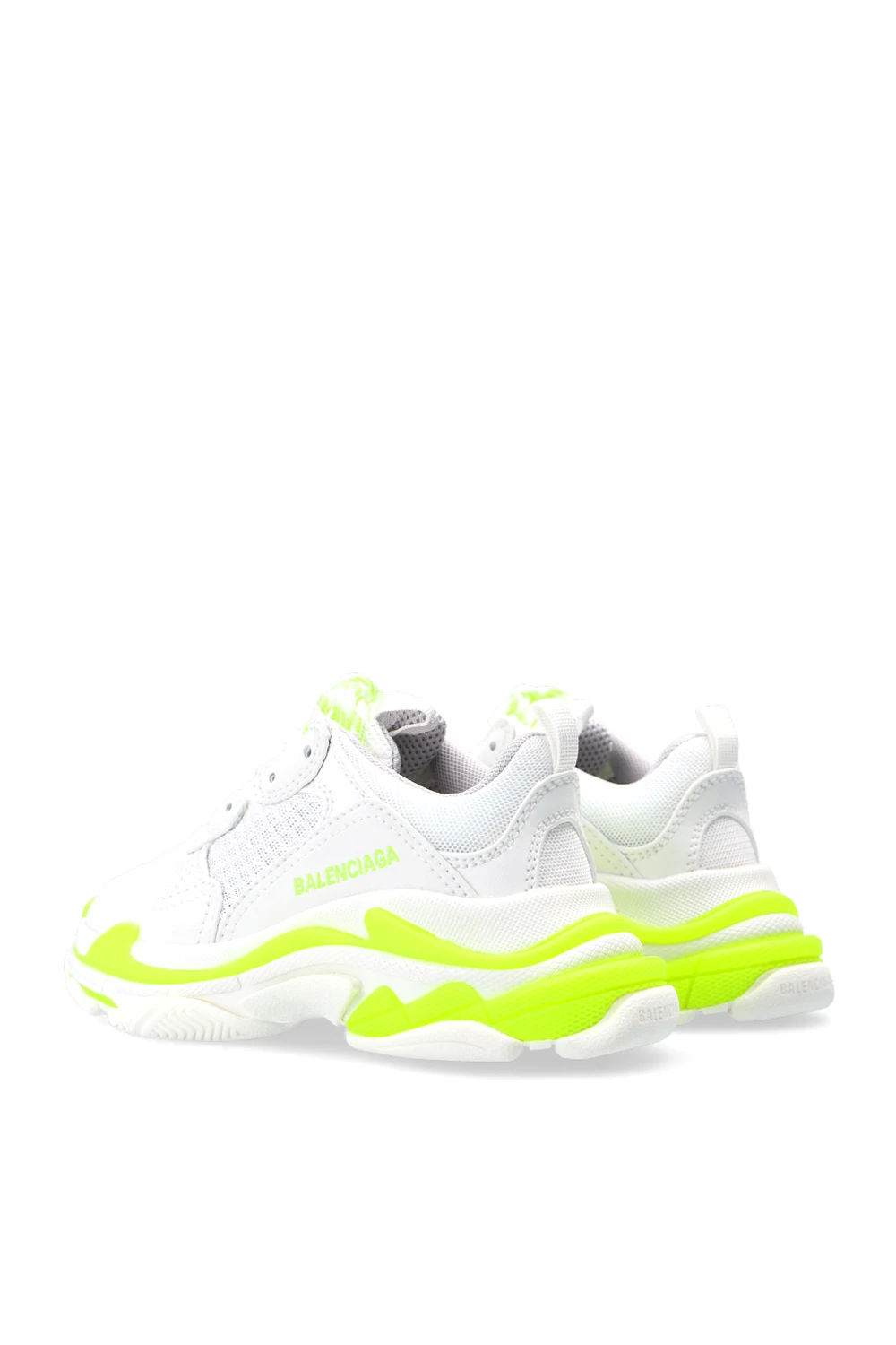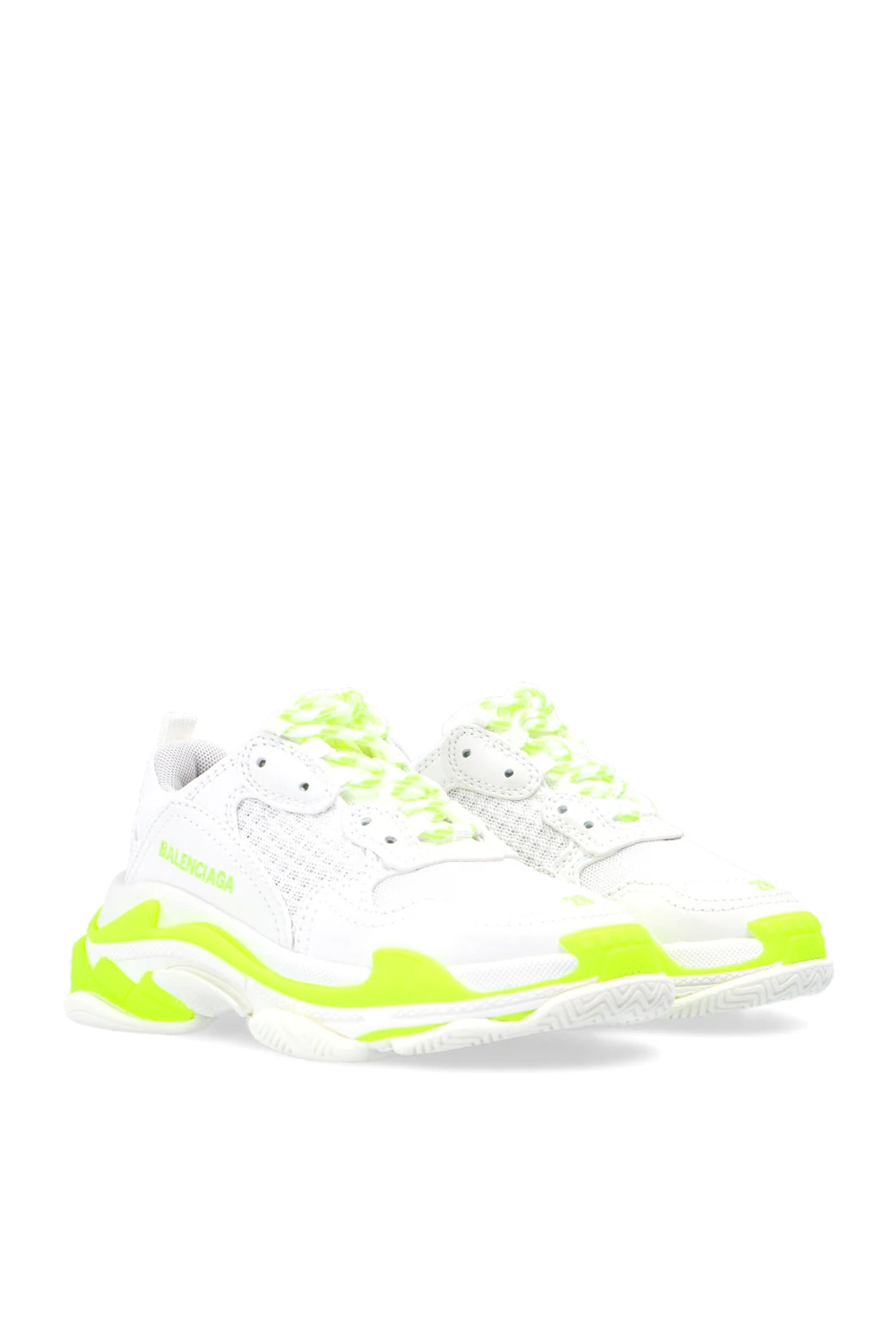 Biało-żółte, sznurowane buty sportowe, model ‘Triple S’ Balenciaga Kids. Wykończone siatką. Wyszyte logo w kolorze czarnym. Biała, gumowa podeszwa.