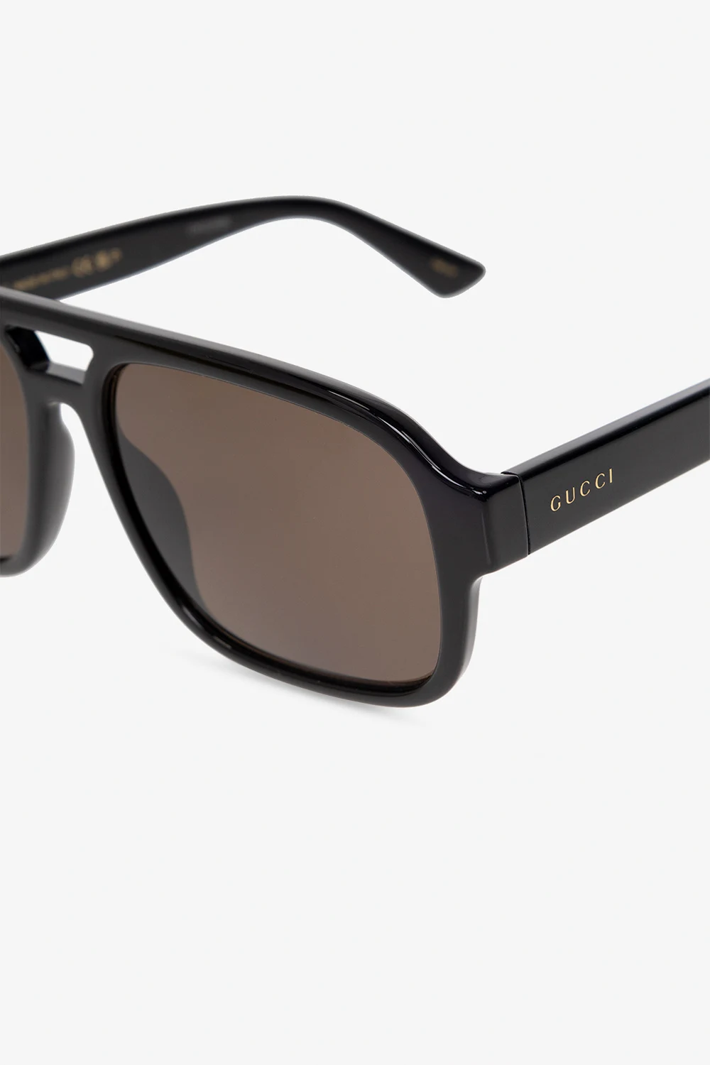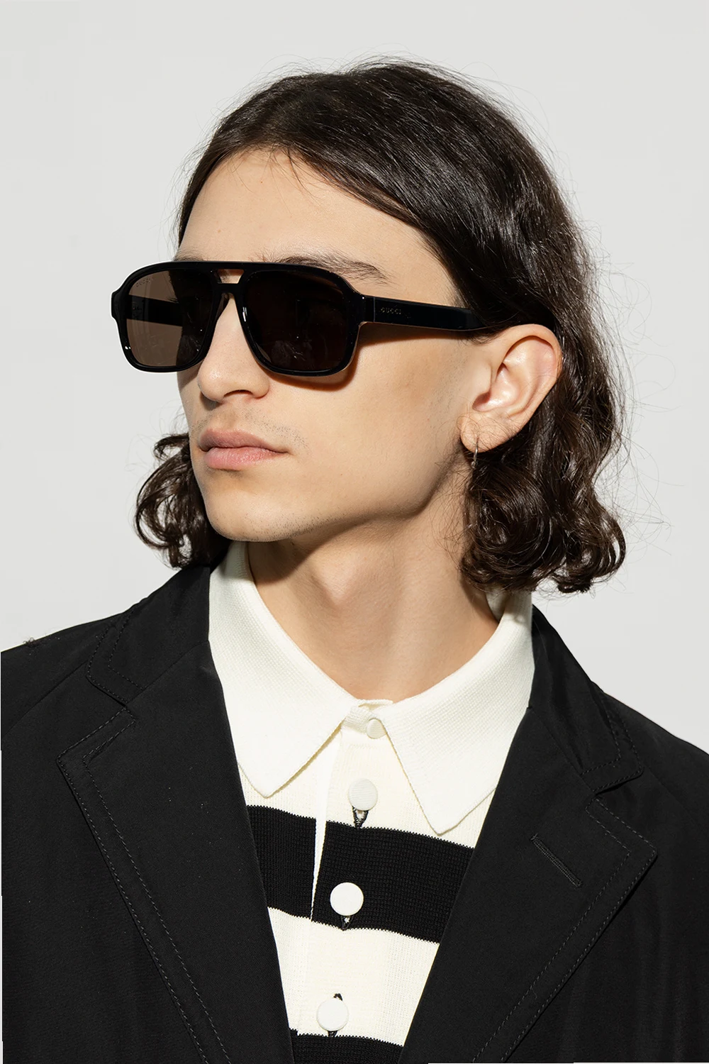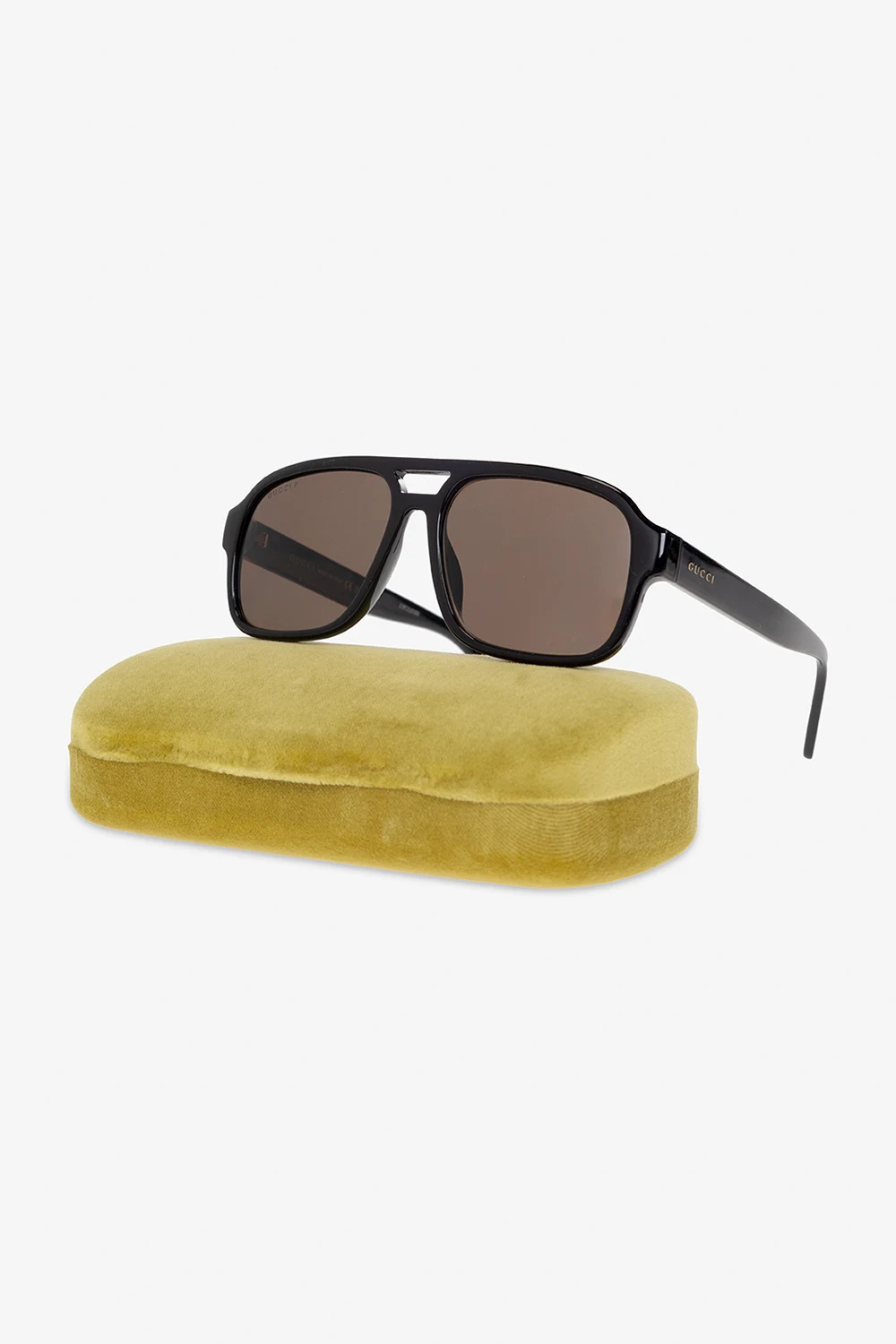 Czarne okulary przeciwsłoneczne Gucci. Wykonane z acetatu. Oprawki typu ‘aviator’ z podwójnym mostkiem. Zauszniki ozdobione logo. Brązowe szkła ze 100% ochroną przed promieniami UV. Dołączone etui w losowo wybranym kolorze.