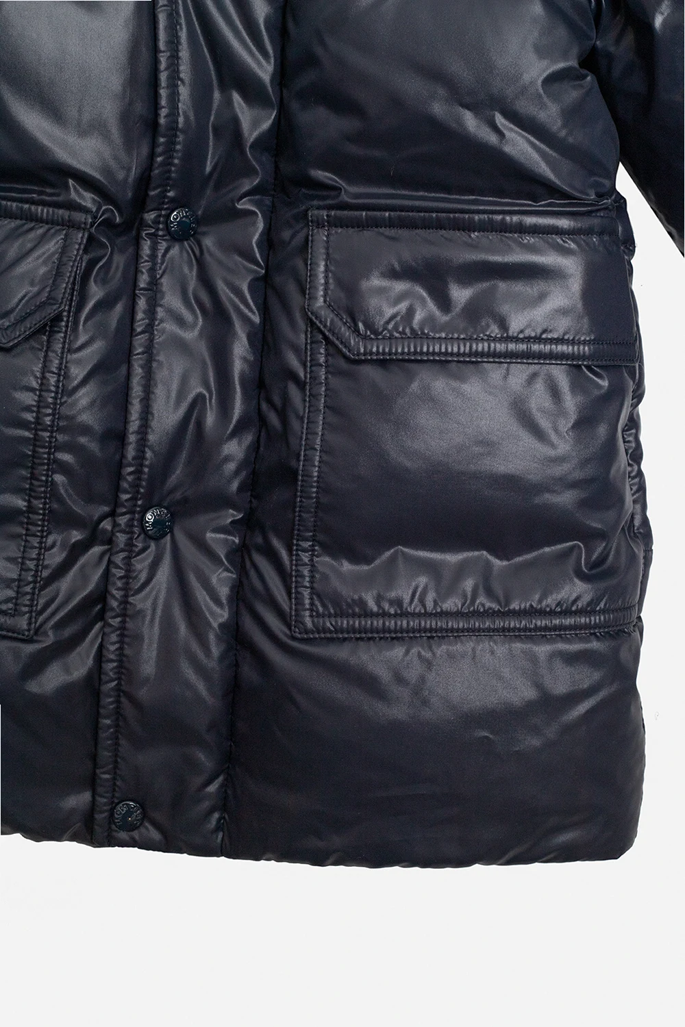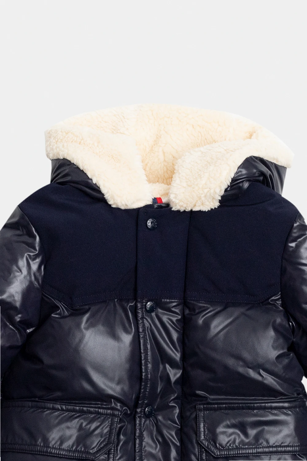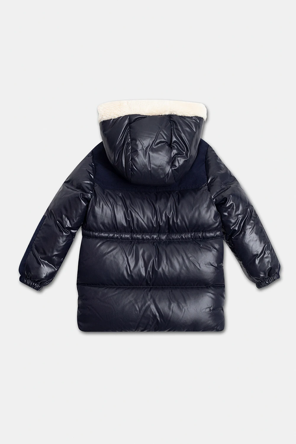 Granatowa, pikowana kurtka puchowa z kapturem, model ‘Comil’ Moncler Enfant. Zapinana na zamek oraz plisę z zatrzaskami. na ramięniu charakterystyczna dla marki filcowa naszywka z logo. Kaptur wykończony kremową imitacją futra. Dwie kieszenie zapinane na patki z zatrzaskami. Długie rękawy zakończone ściągaczem.