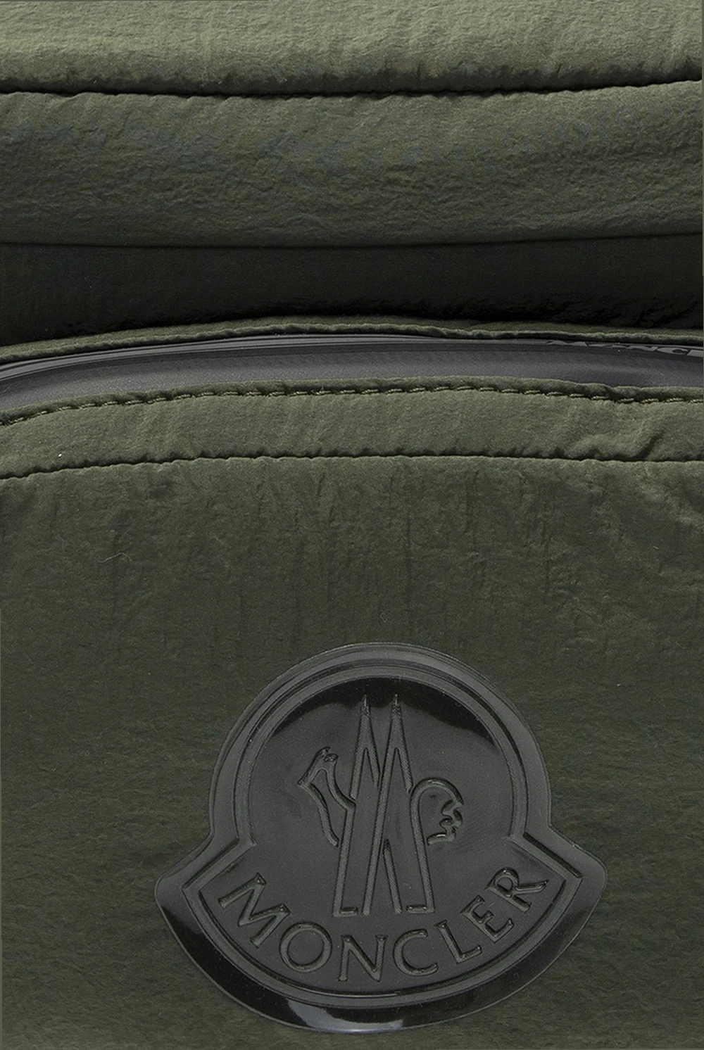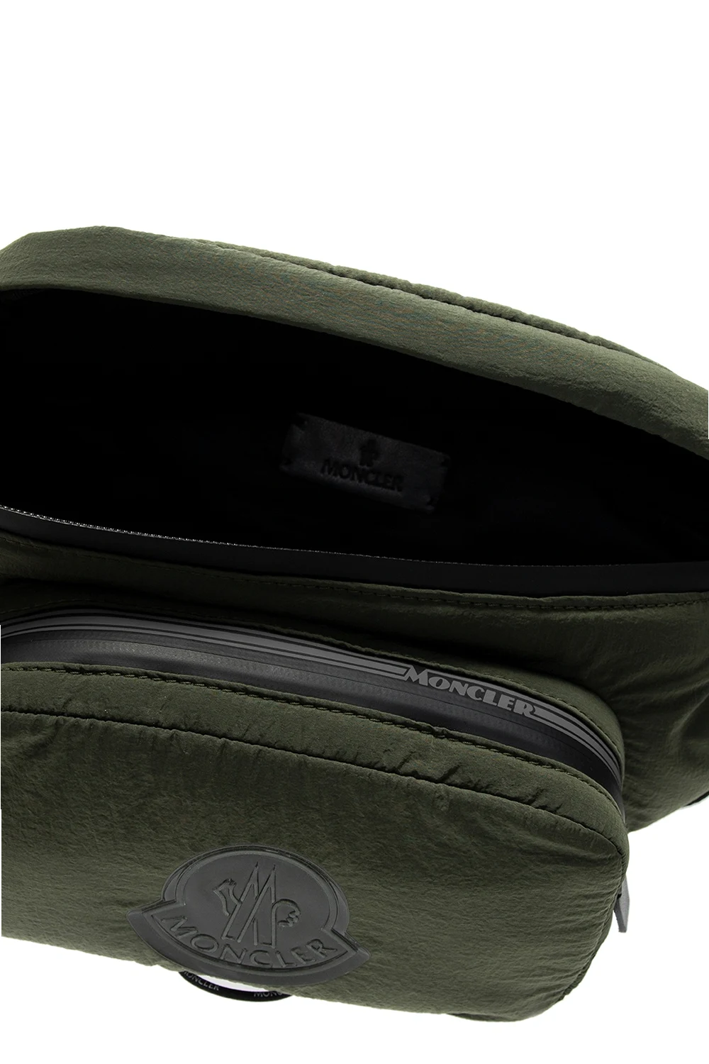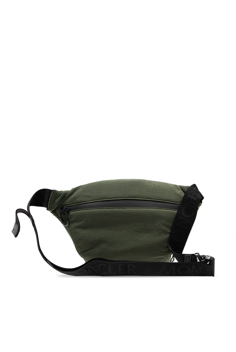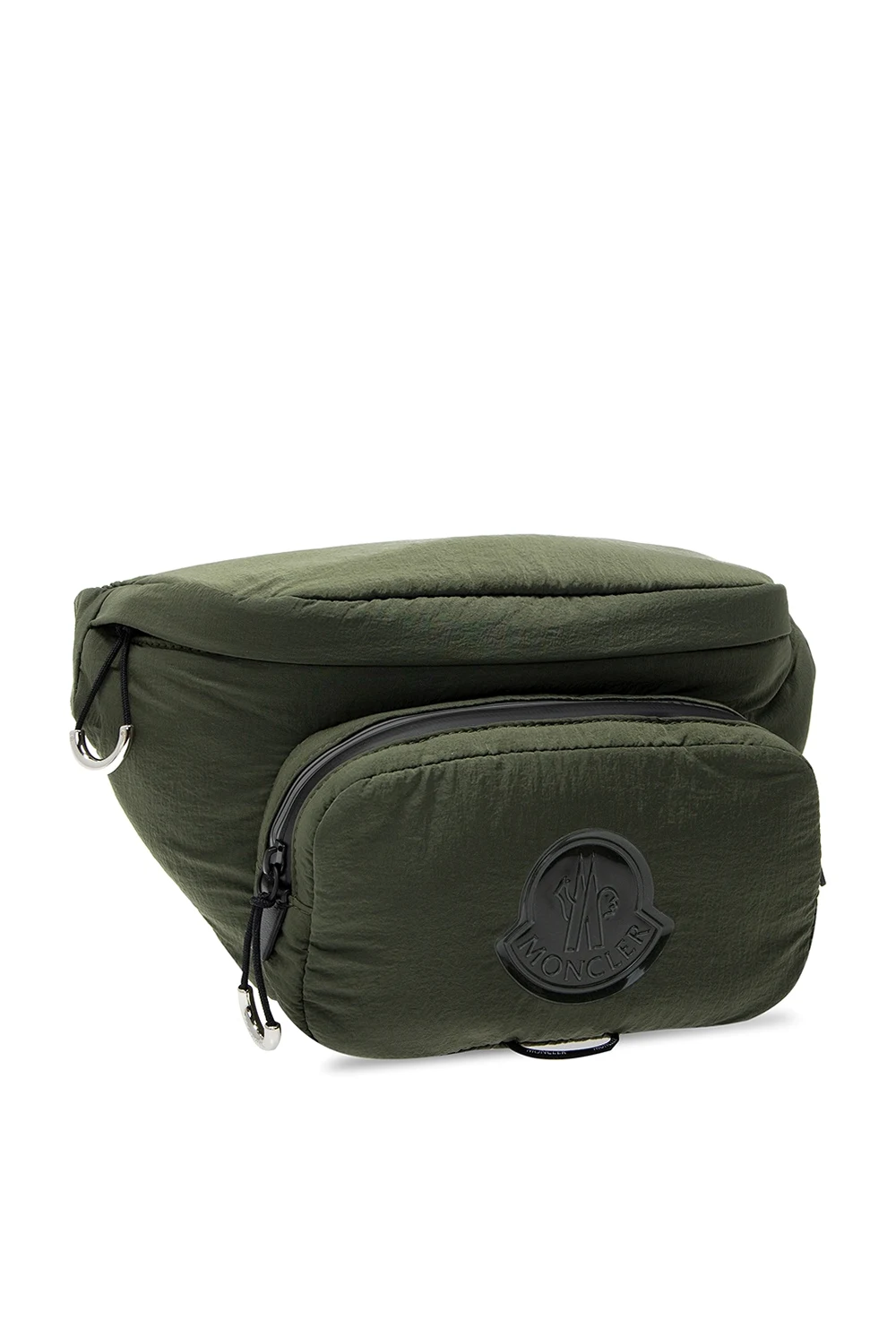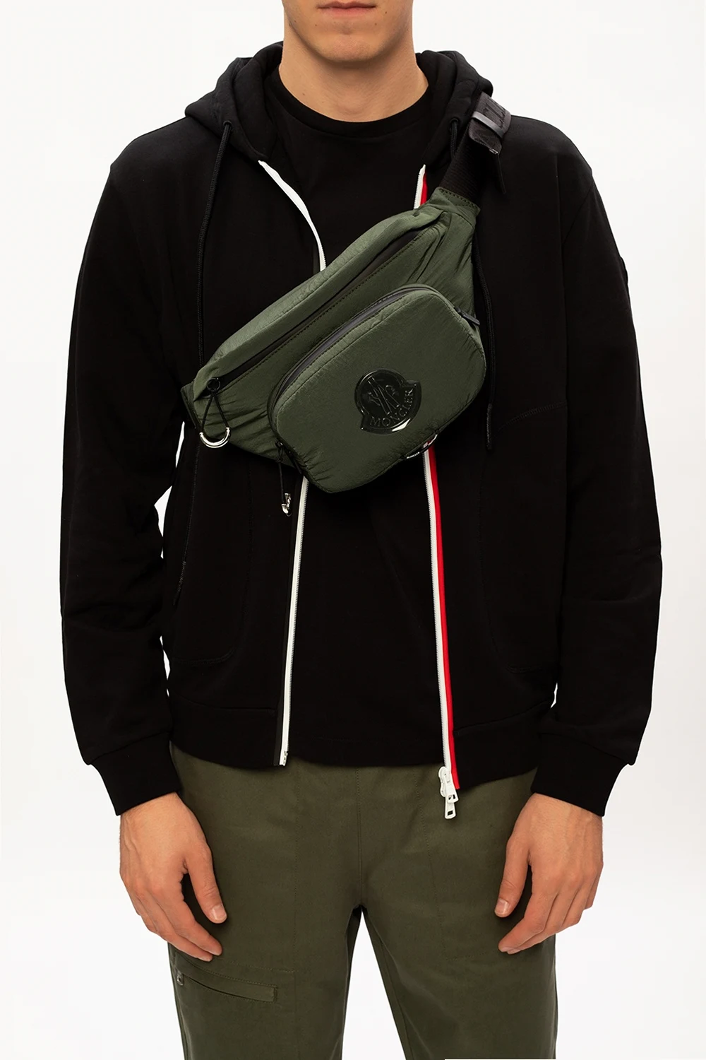 Zielona torba na pas, model ‘Durance’ Moncler. Zamykana na zamek. Ozdobiona gumową aplikacją z logo. Z przodu kieszeń zamykana na zamek. Na dole czerwony pasek z wyszytym, białym logo. Z tyłu kieszeń zamykana na zamek. Regulowany pasek biodrowy w kolorze czarnym. Wewnątrz komora.