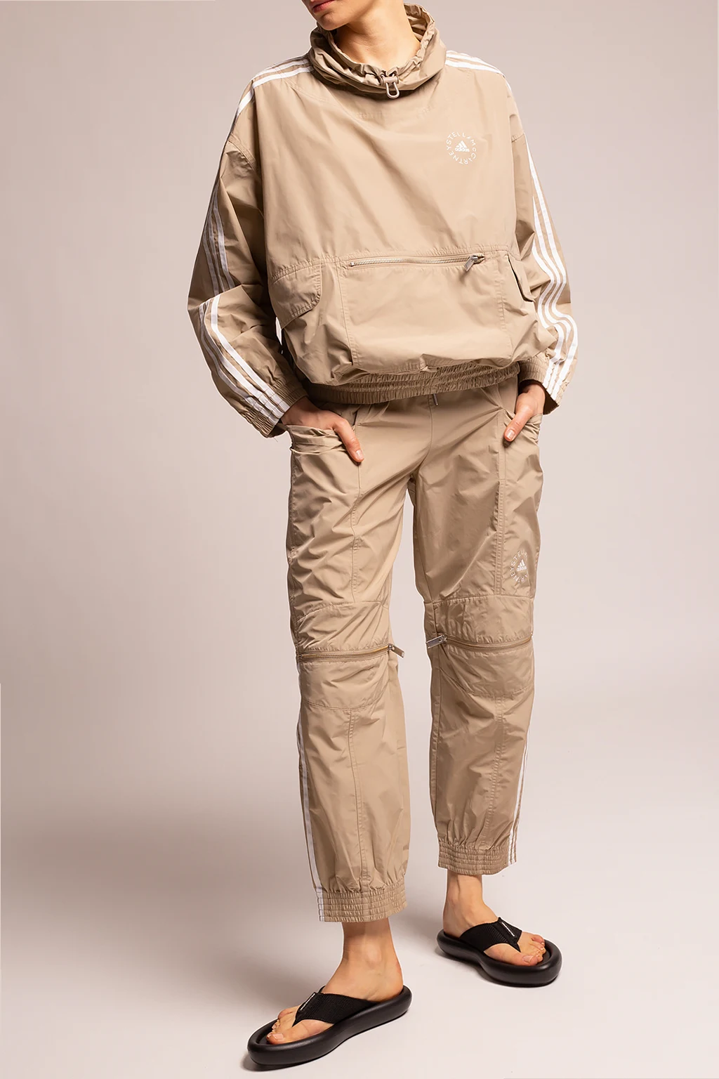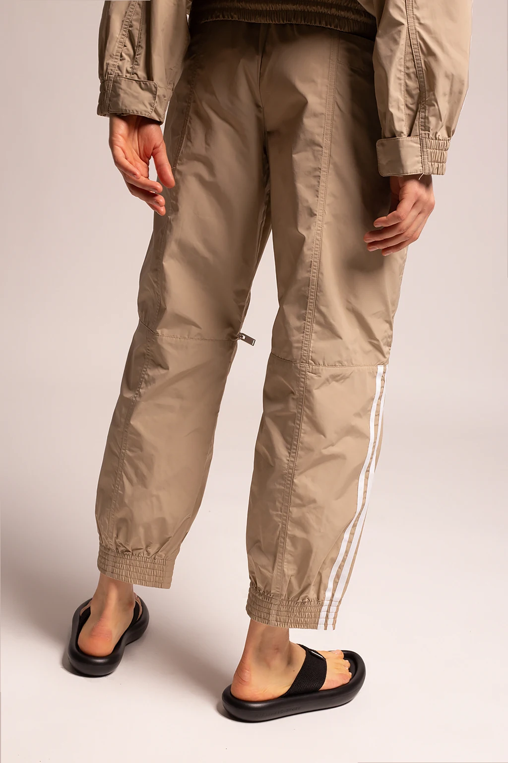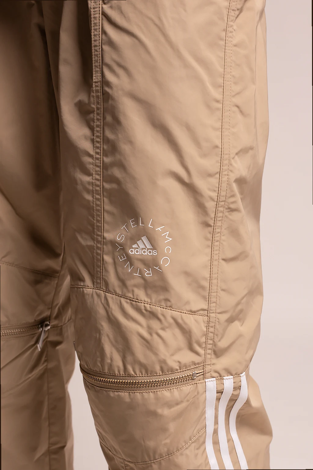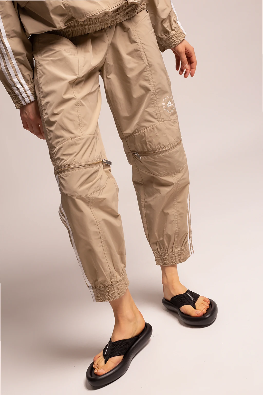 Beżowo-białe spodnie ADIDAS By Stella McCartney. W pasie ściągane trokami. Ozdobione nadrukowanym białym logo. Liczne kieszenie.