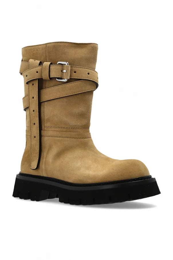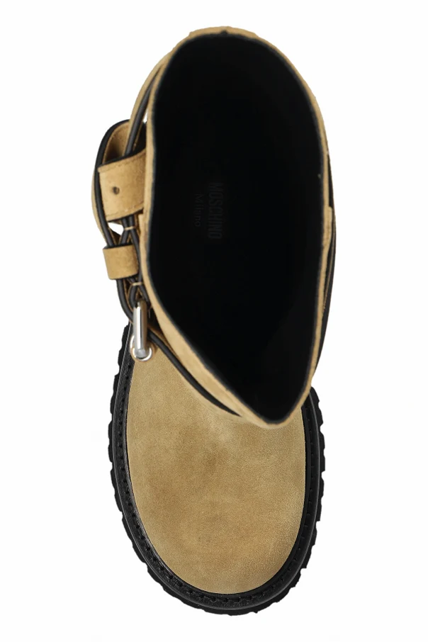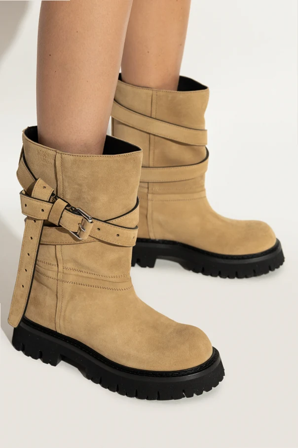 Zamszowe botki marki Moschino to kwintesencja wyrafinowanego stylu i ponadczasowej elegancji. Starannie wykonane z najwyższej jakości skóry zamszowej w kolorze beżowym , urzekają klasycznym, masywnym fasonem za kostkę oraz subtelną okrągłością noska.