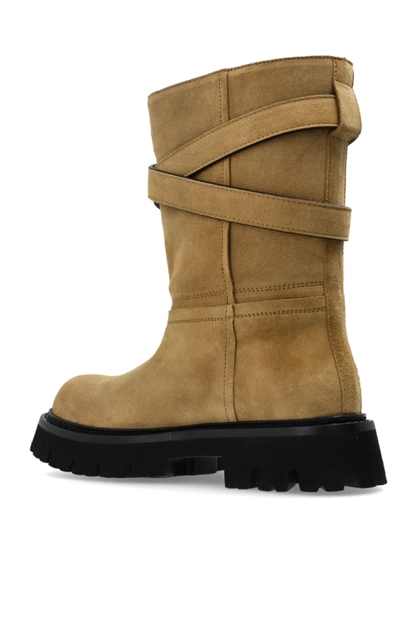 Usztywniona, szeroka cholewka gwarantuje niepowtarzalny komfort użytkowania oraz podkreśla unikatowość sylwetki. Projekt wzbogacają szerokie, zamszowe paski oplatające górę cholewki – efektowny detal dodający obuwiu niepowtarzalnego charakteru.