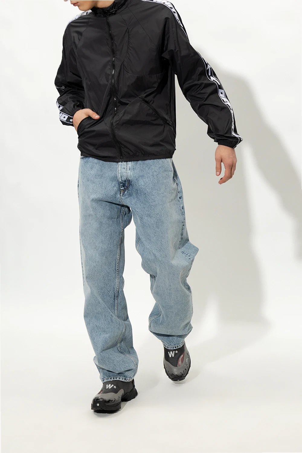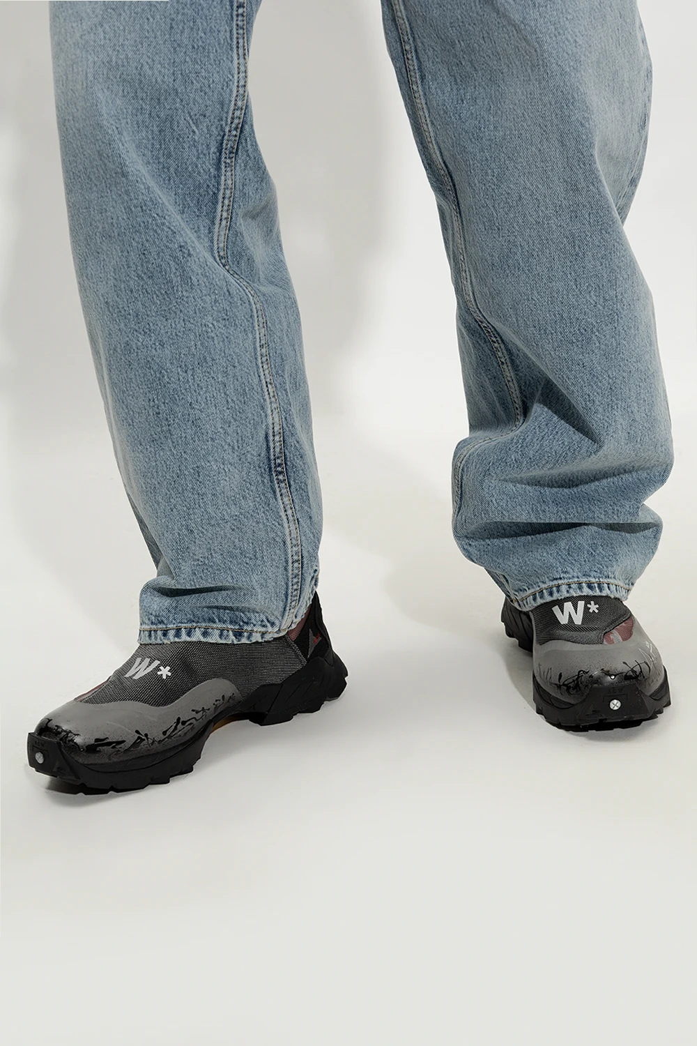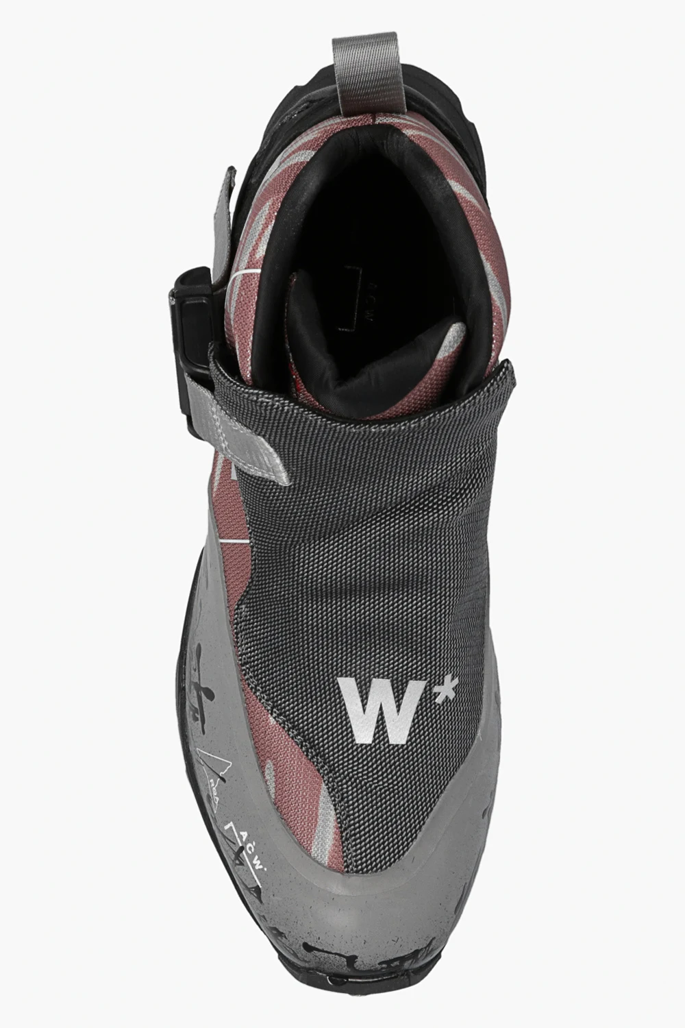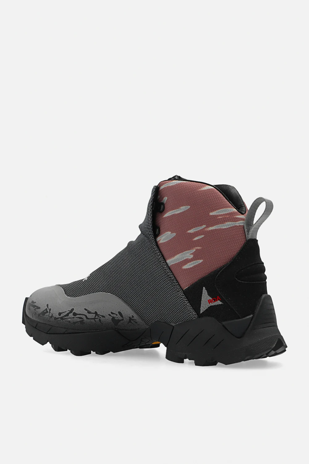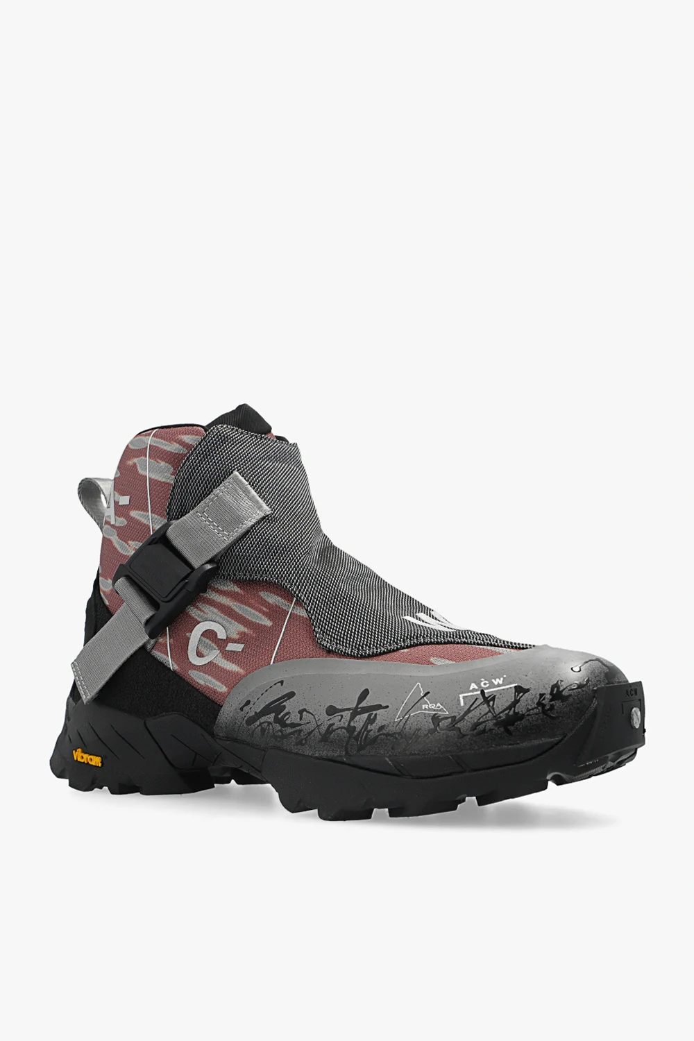 Szaro-brązowo-czarne, sznurowane buty trekkingowe za kostkę, model ‘Andreas’ A-COLD-WALL* x ROA. Z przodu panel z regulowanym paskiem zapinanym na zaczep. Ozdobione logo. Dekoracyjny czarny nadruk oraz szare, odblaskowe elementy. Czarna, gumowa podeszwa Vibram®.