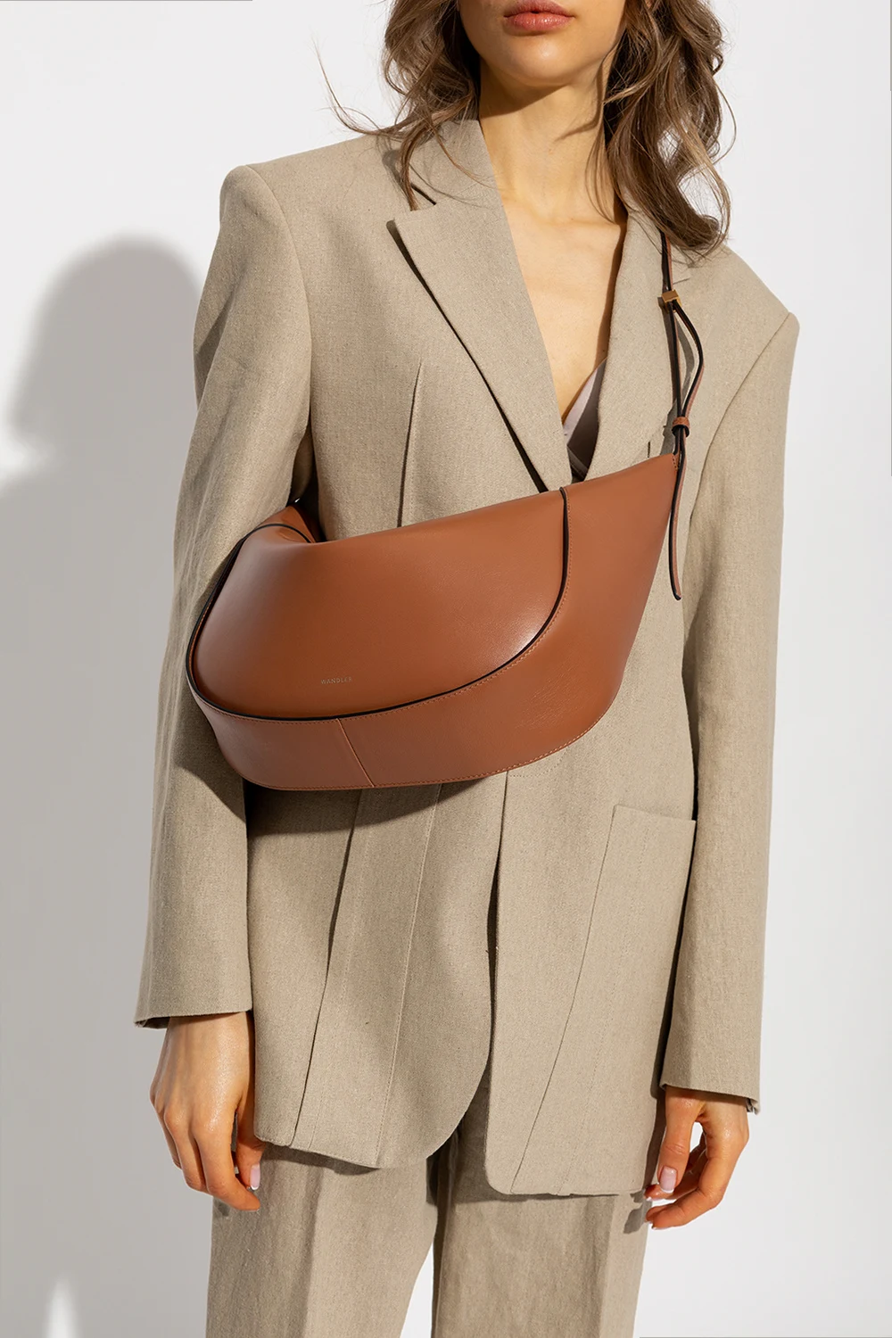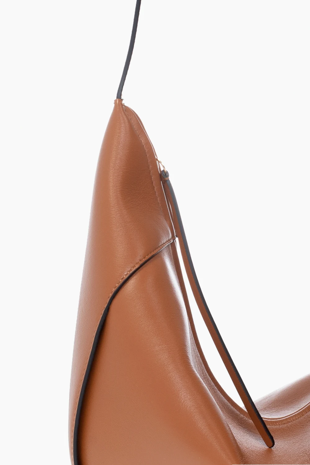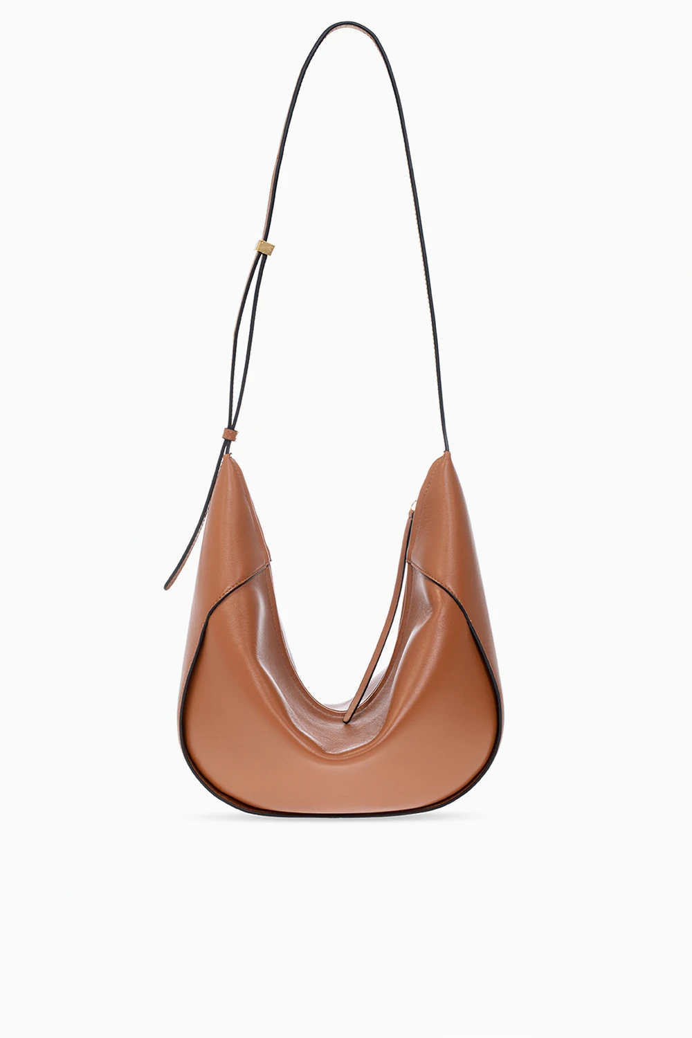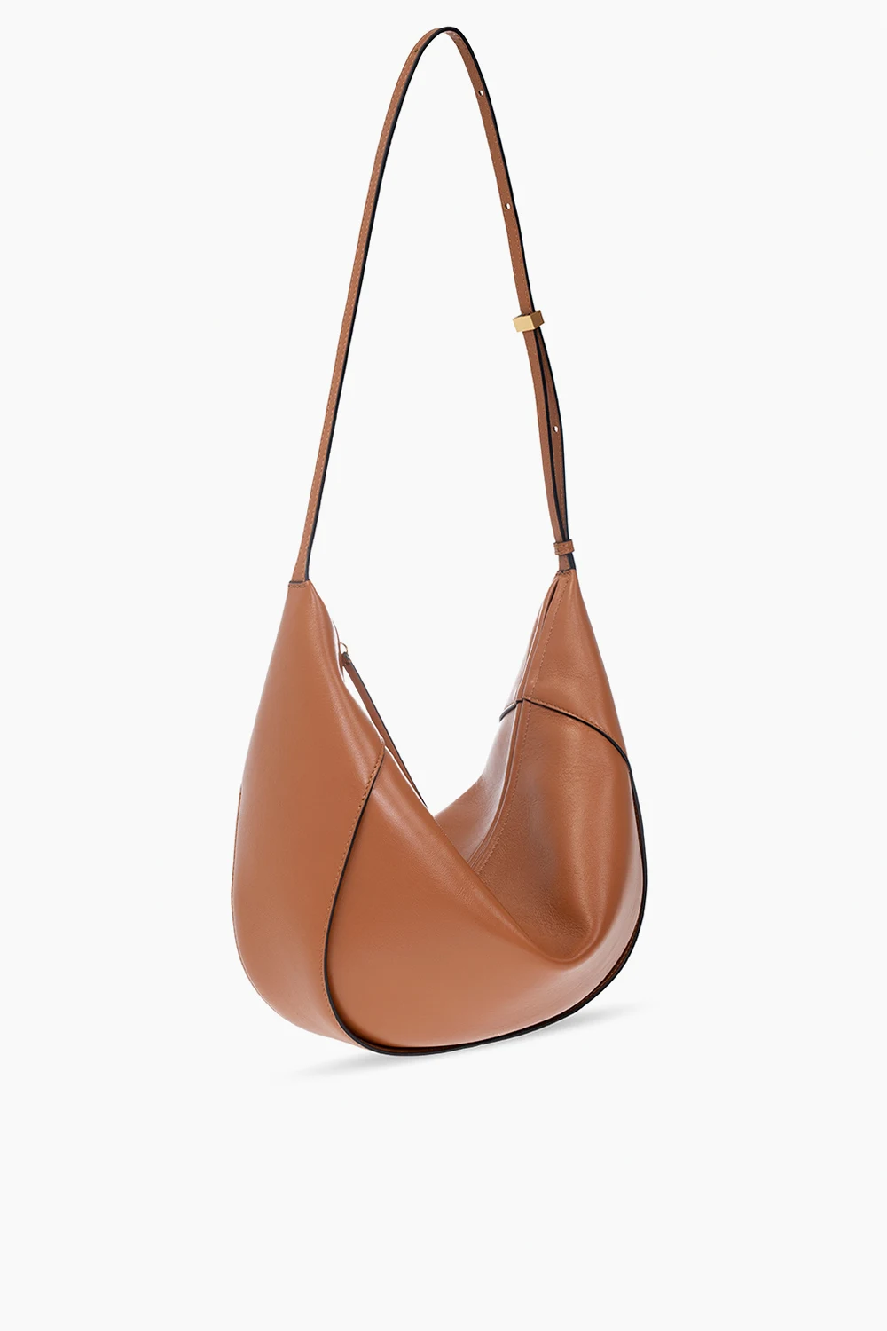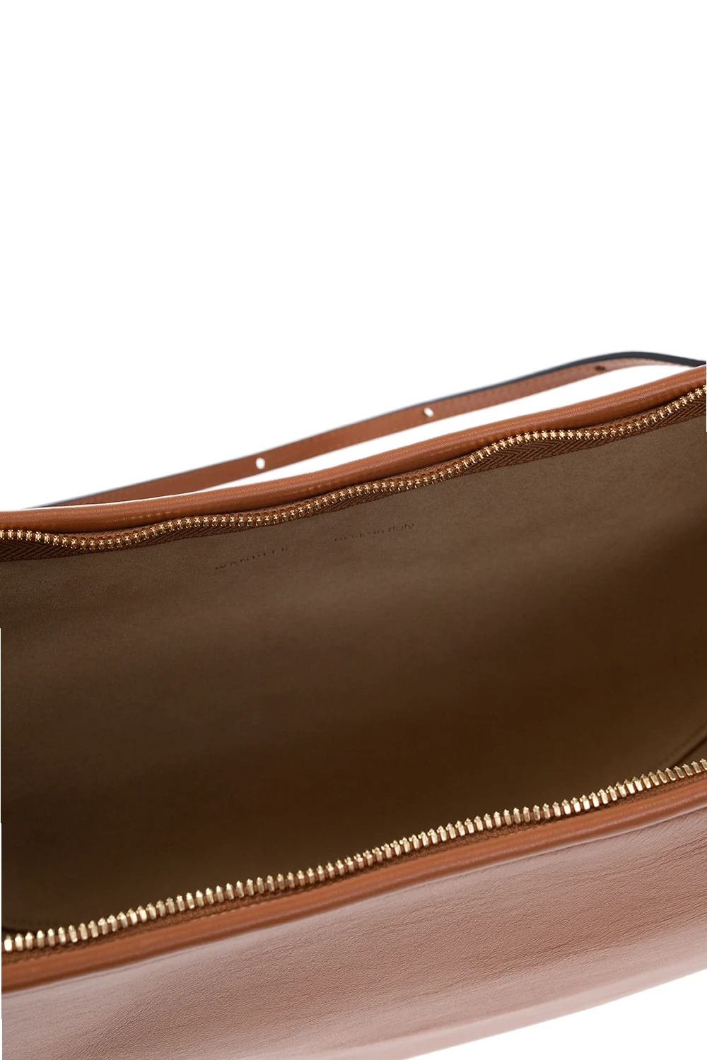 Brązowa torba na ramię, model 'Maggie' Wandler. Wykonana z cielęcej skóry. Zamykana na zamek. Z przodu nadrukowane logo w kolorze złotym. Pas z możliwością regulacji długości. Wewnątrz komora. Metalowe wykończenie w kolorze złotym.