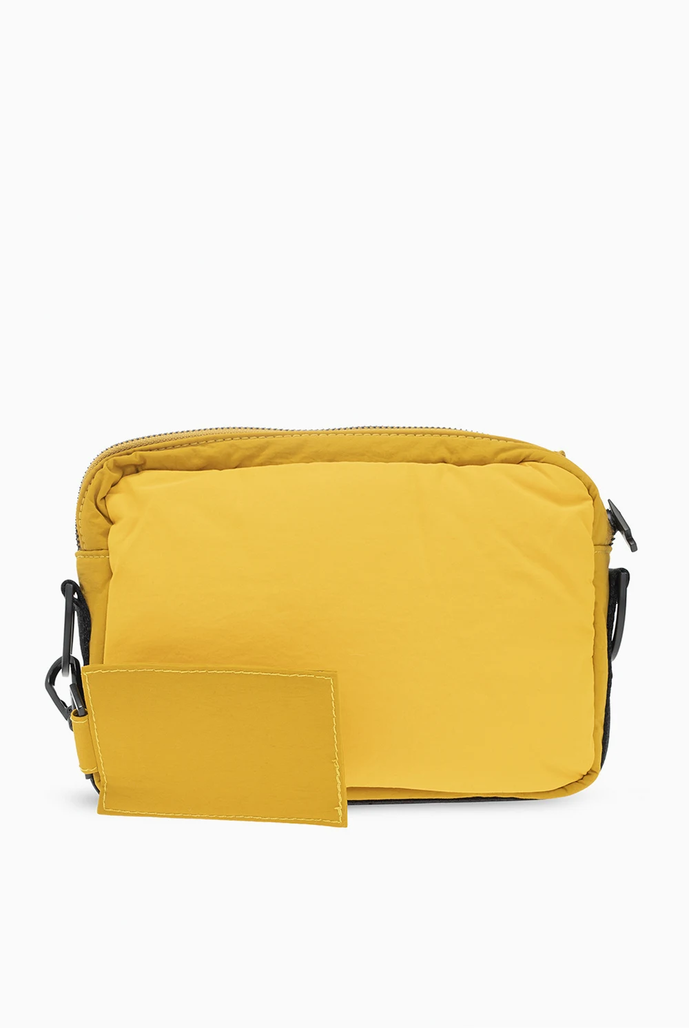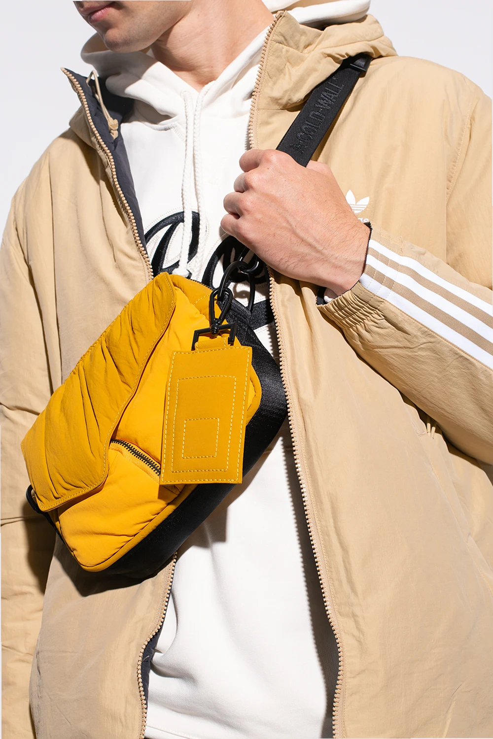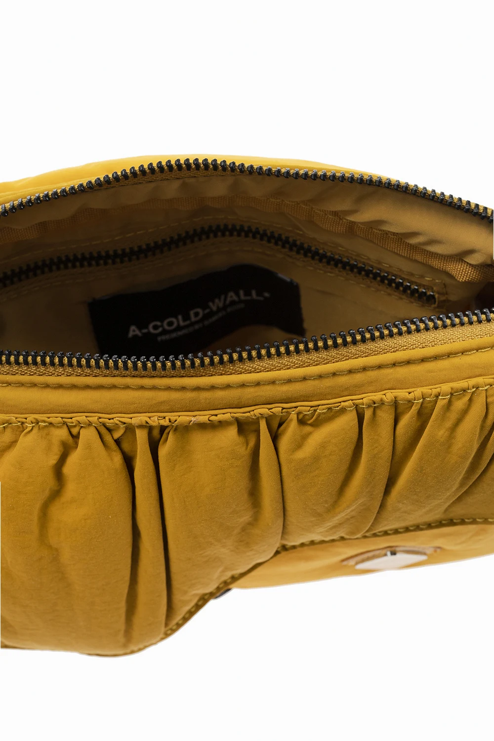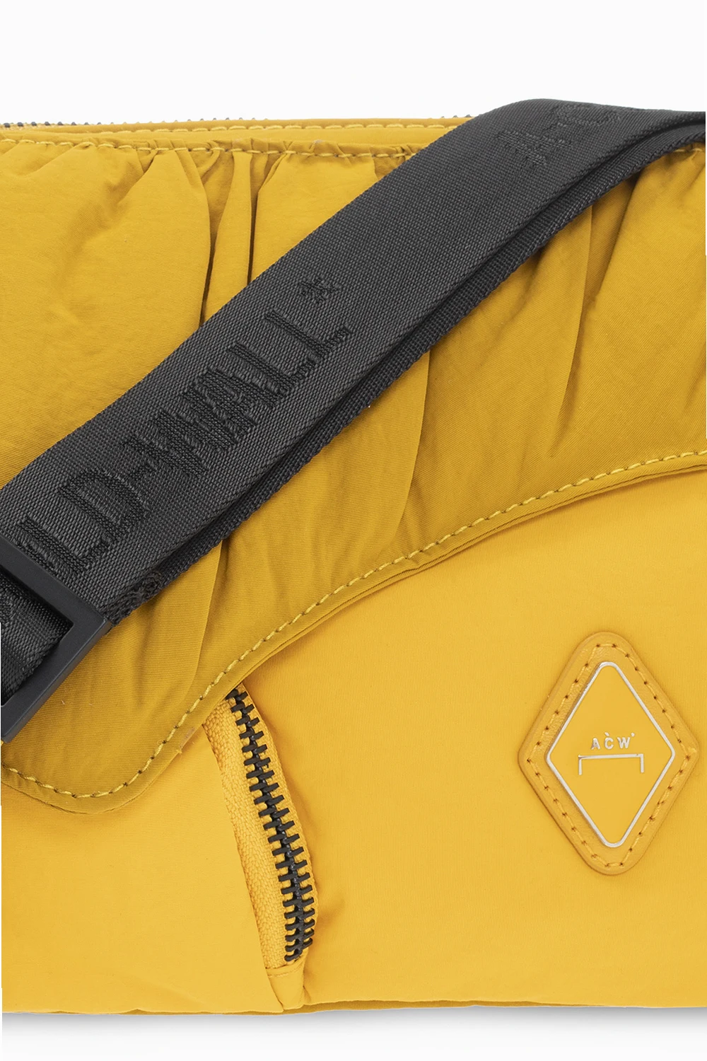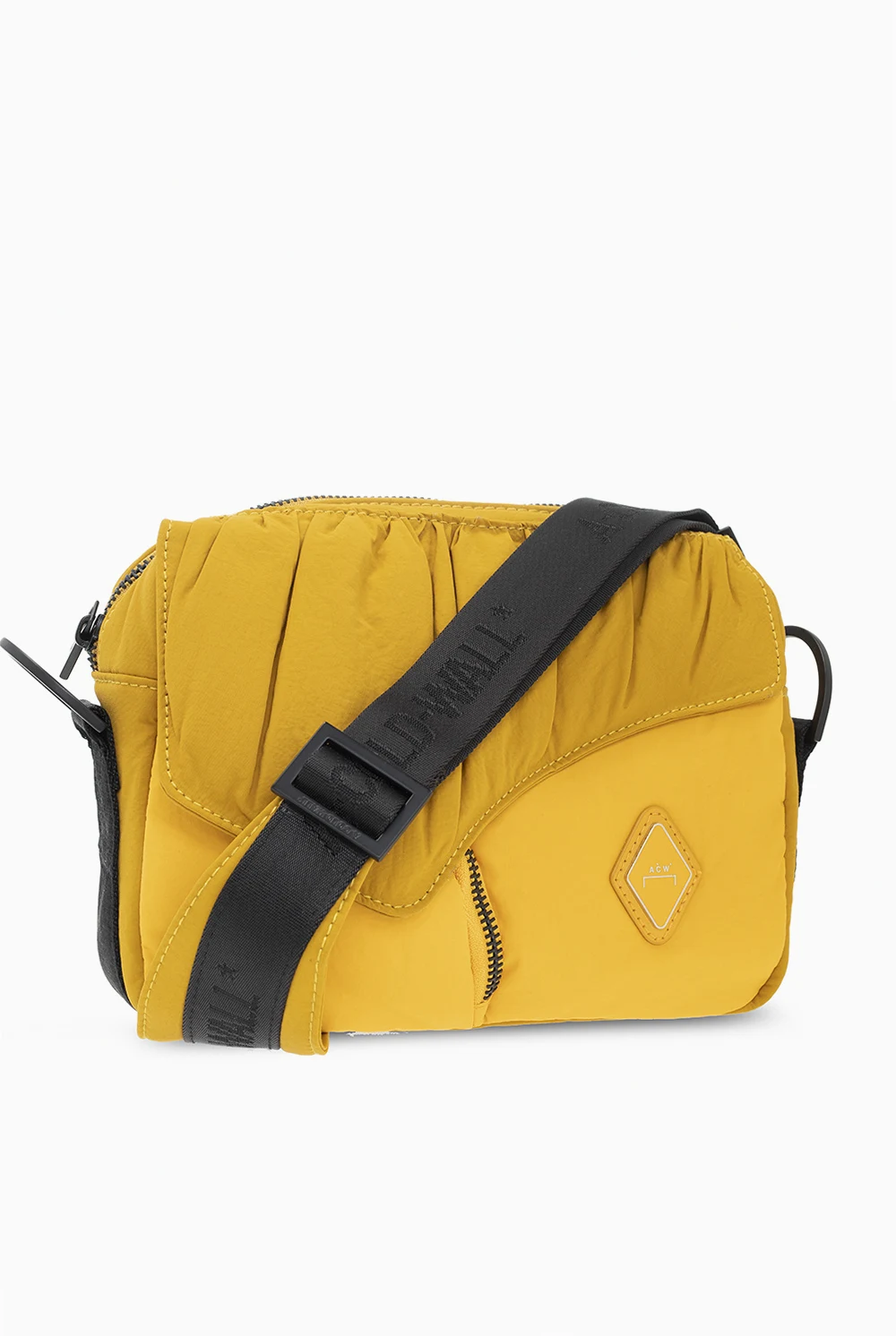 Żółto-czarna torba na ramię A Cold Wall. Zamykana na zamek biegnący dookoła. Ozdobiona wypukła aplikacją z logo. Z przodu dwie kieszenie – pierwsza z patką zamykaną na magnetyczny zatrzask, druga zamykana na zamek. Odpinana zawieszka i pasek z możliwością regulacji długości. Wewnątrz komora z kieszenią zamykaną na zamek.