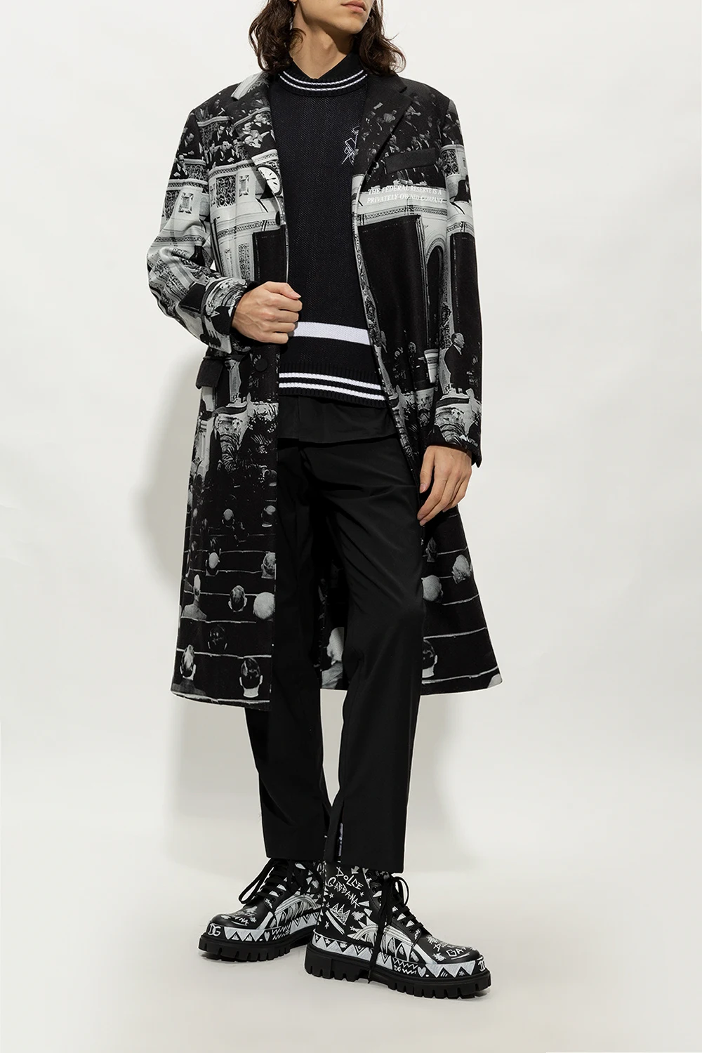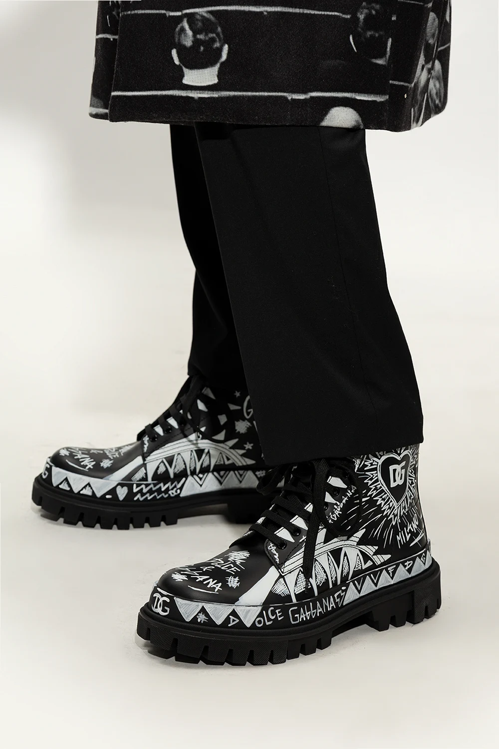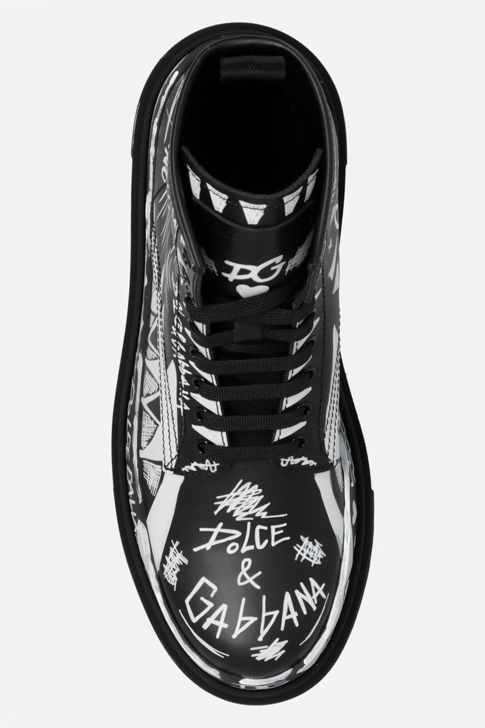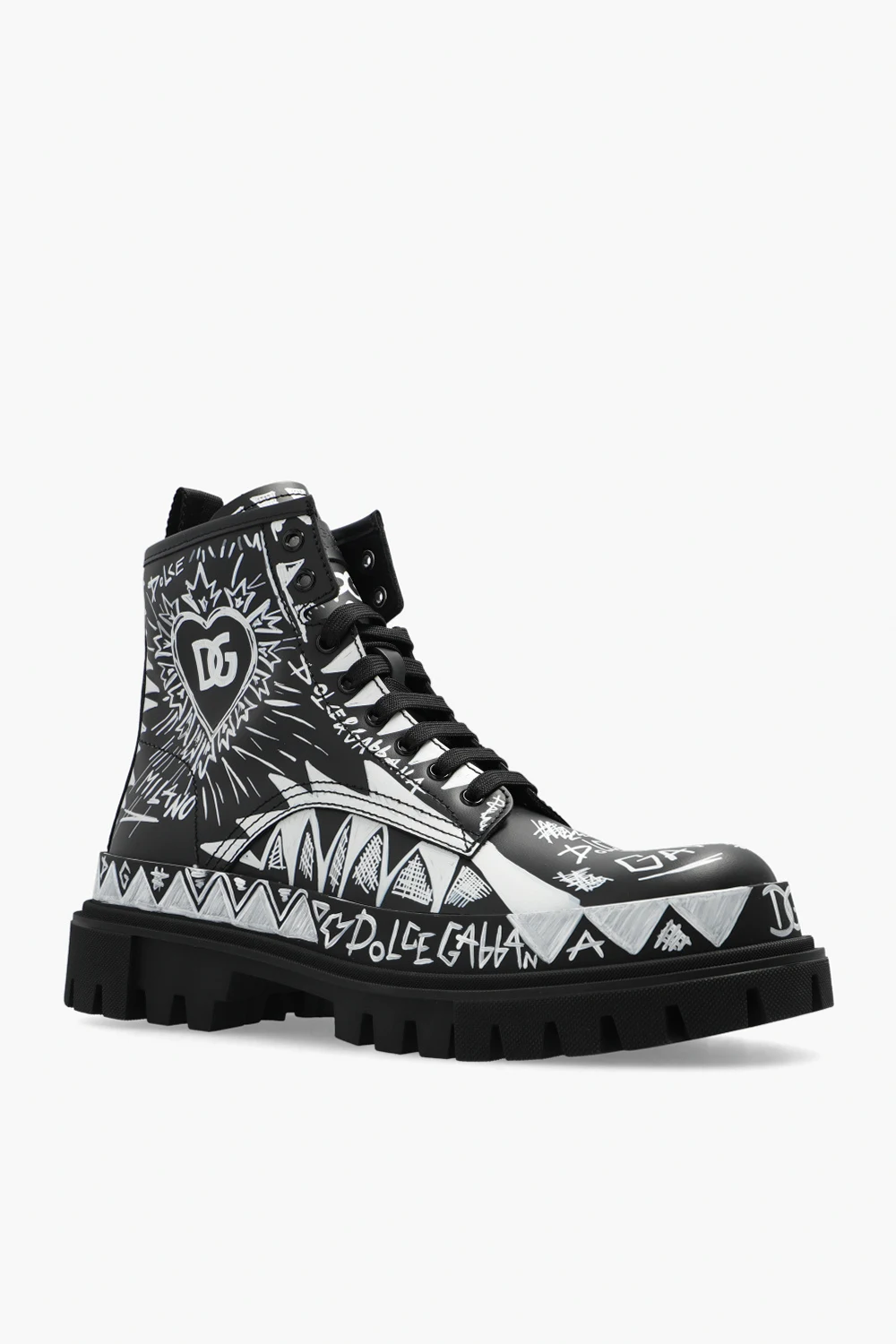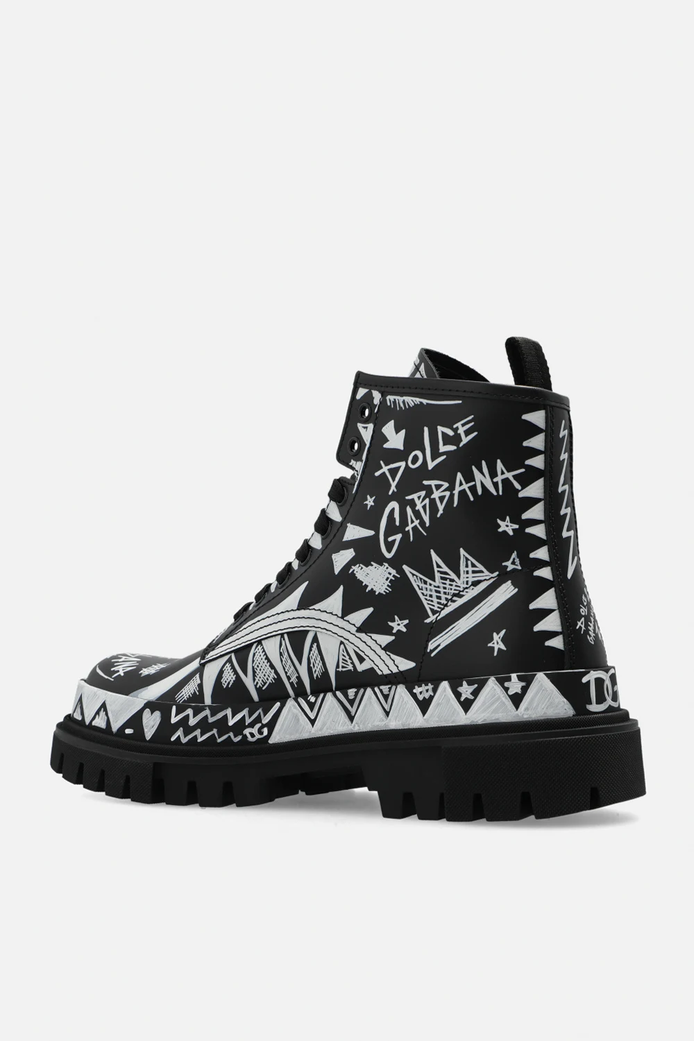 Czarne, sznurowane buty za kostkę typu ‘combat’ Dolce & Gabbana. Wykonane ze skóry. Ozdobione nadrukowanym wzorem z motywem logo w kolorze białym, inspirowanym sztuką graffiti. Z przodu naszywka z wytłoczonym logo. Z tyłu rypsowy pasek. Czarna podeszwa wykonana z gumy.