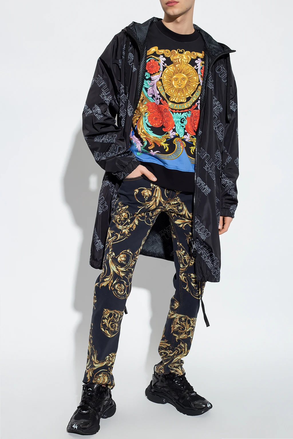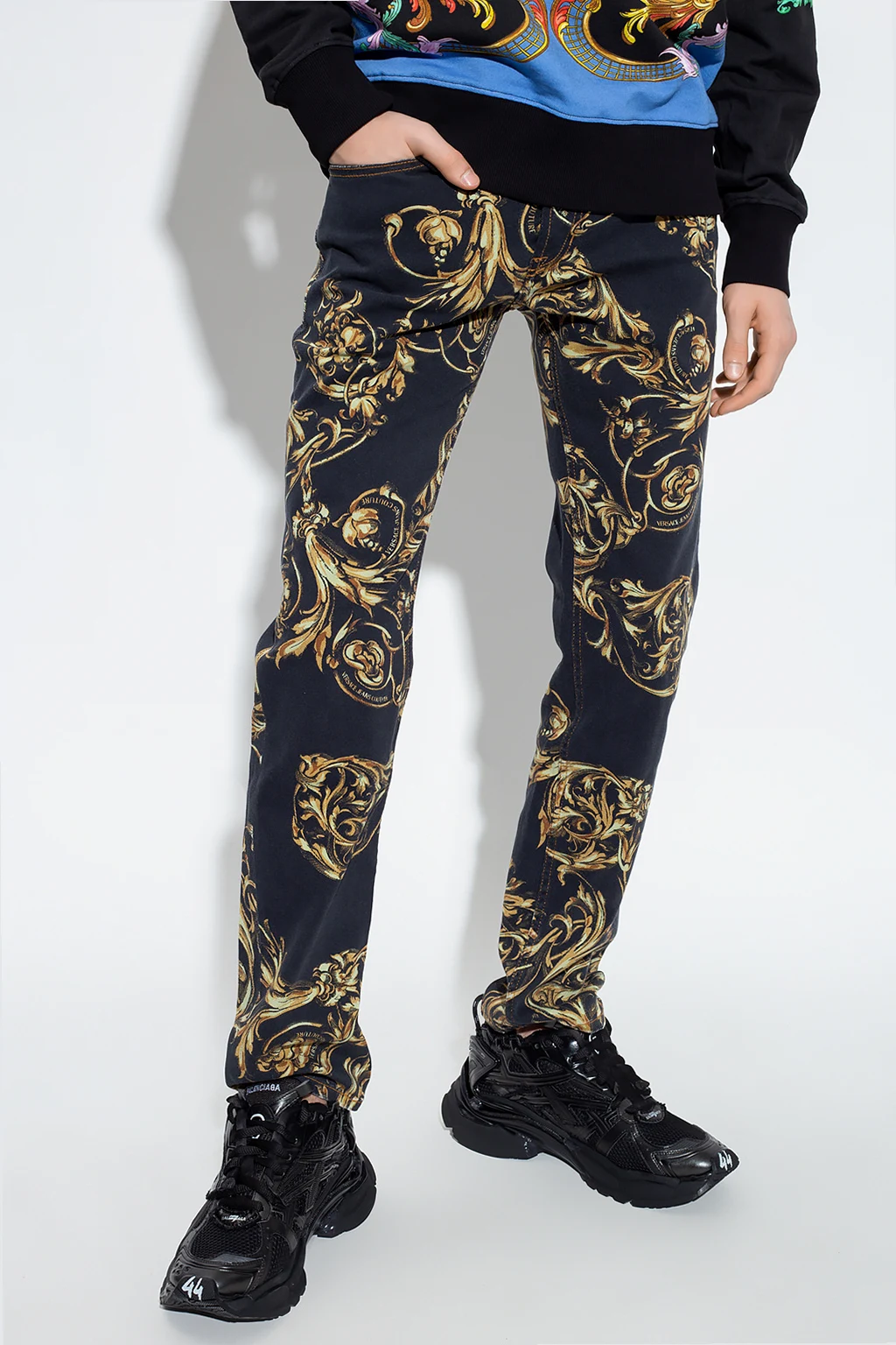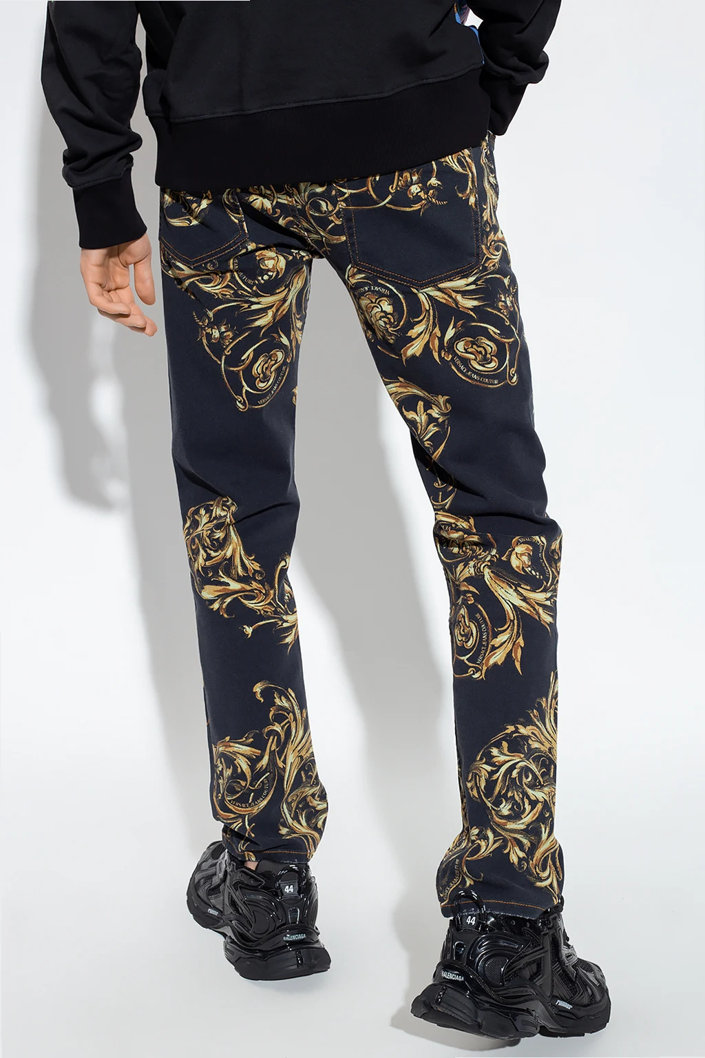 Czarne jeansy typu ‘slim’ Versace Jeans Couture. Zapinane na guziki. Ozdobione charakterystycznym dla marki wzorem w kolorze brązowo-żółto-czarnym. Z tyłu dekoracyjna naszywka z logo. Pięć wsuwanych kieszeni: trzy z przodu i dwie z tyłu. Nogawki zakończone przetarciami.