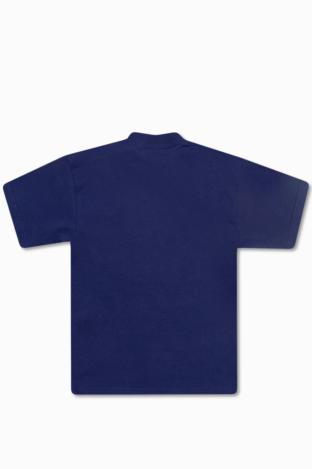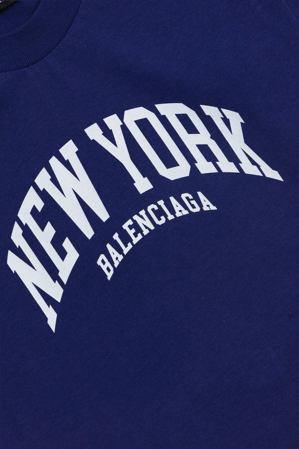 Granatowy, bawełniany t-shirt Balenciaga Kids. Z przodu ozdobiony białym nadrukiem z logo. Okrągły dekolt. Krótkie rękawy.