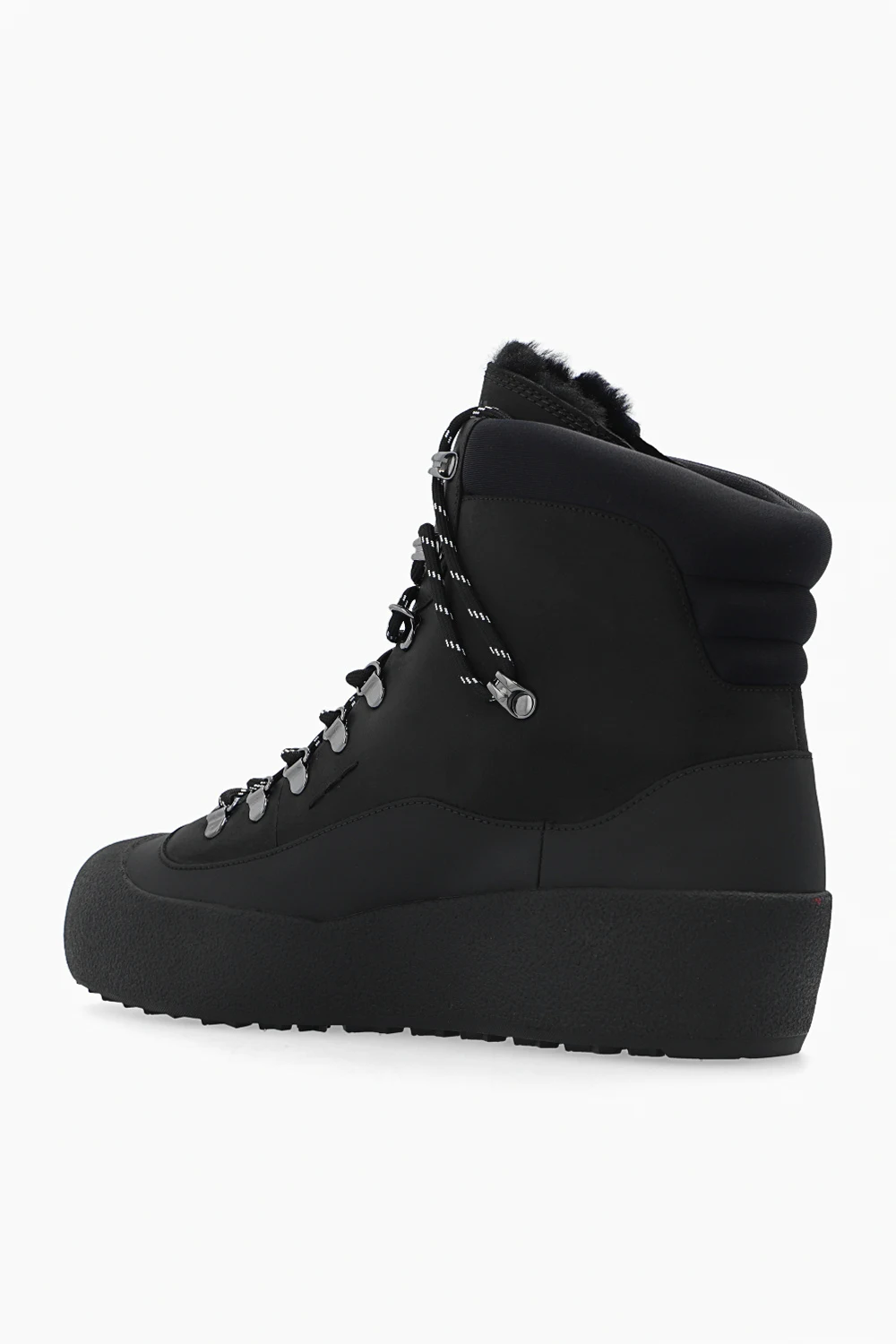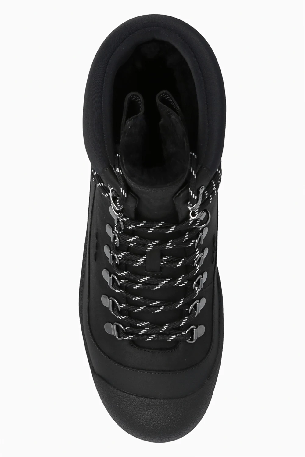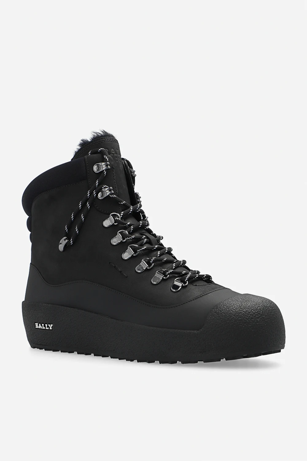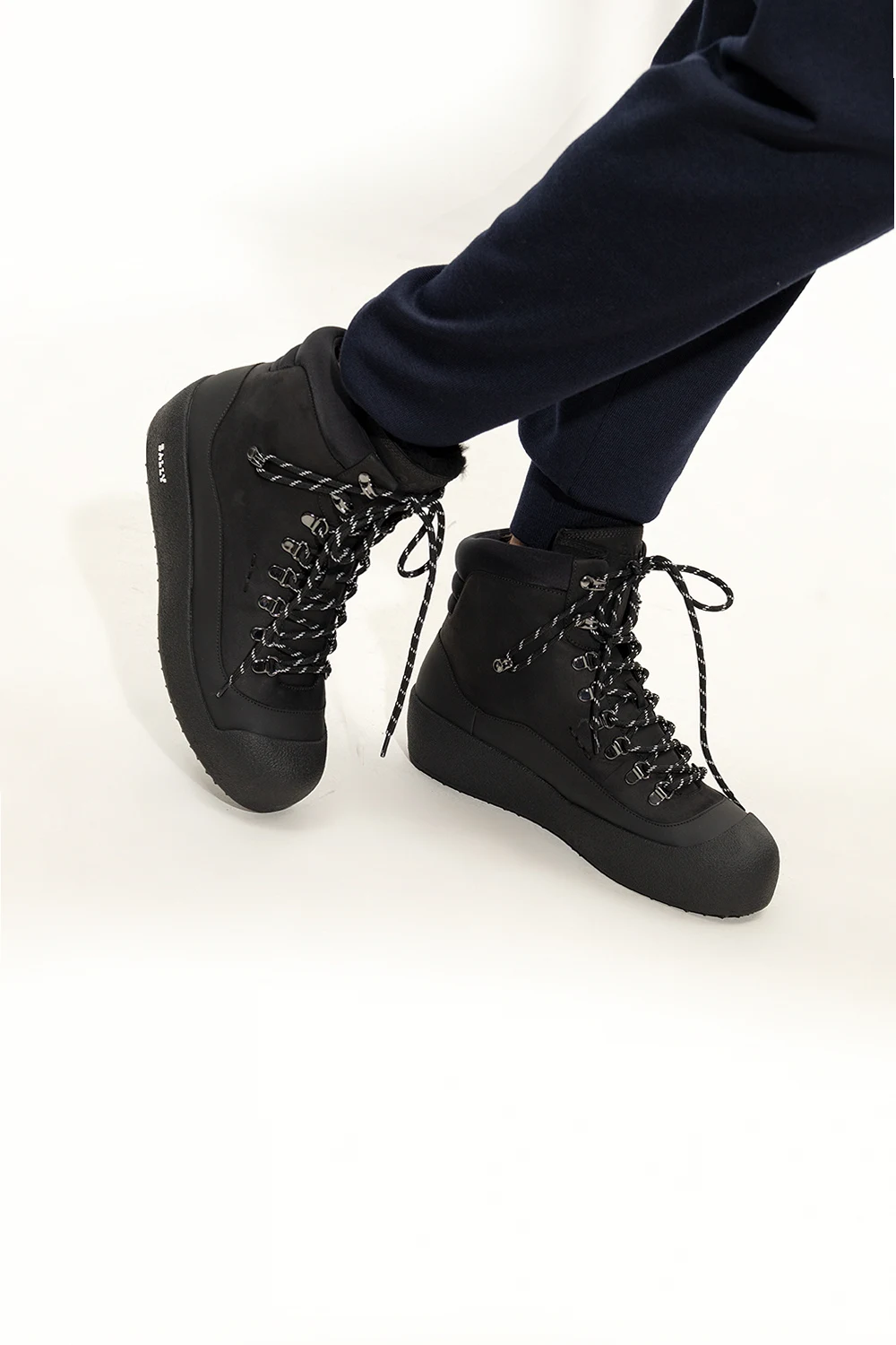 Czarne, sznurowane trapery, model ‘Cayden’ Bally. Wykonane ze skóry i materiału. Ozdobione białym wzorem z logo. Czarna, gumowa podeszwa ‘Vibram®’.
