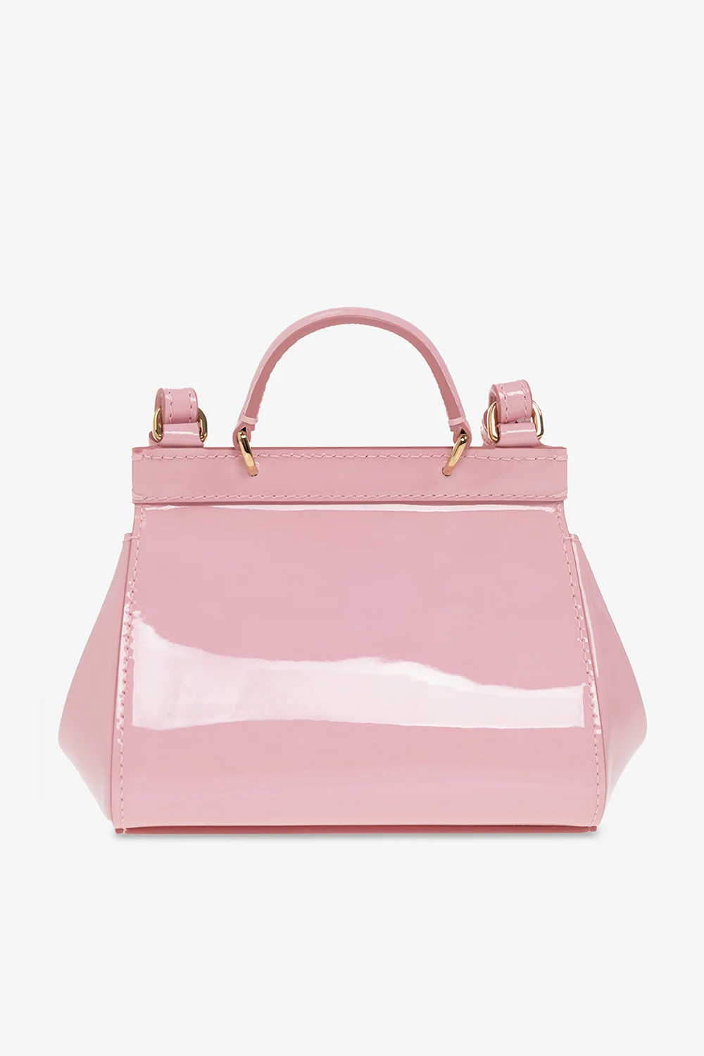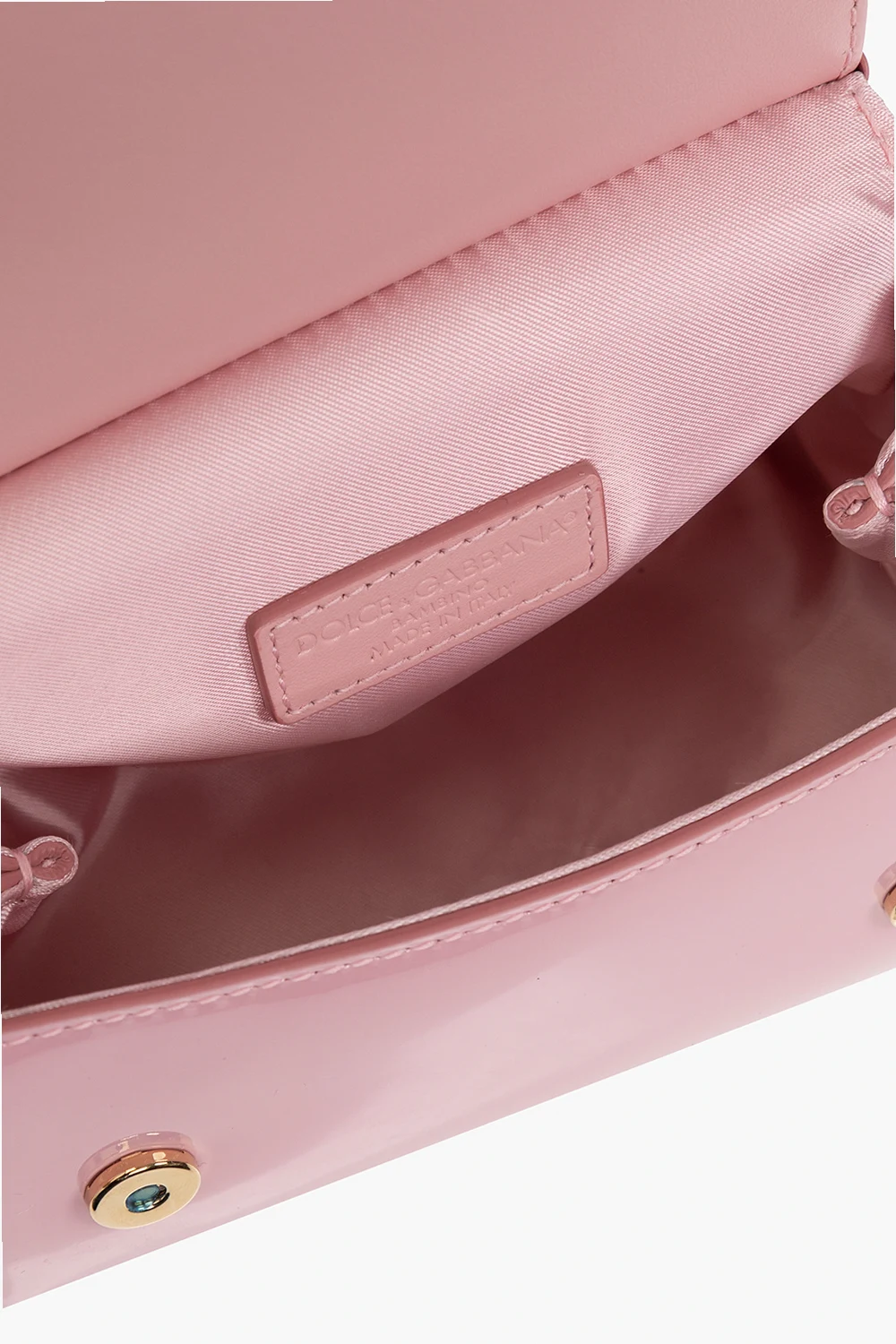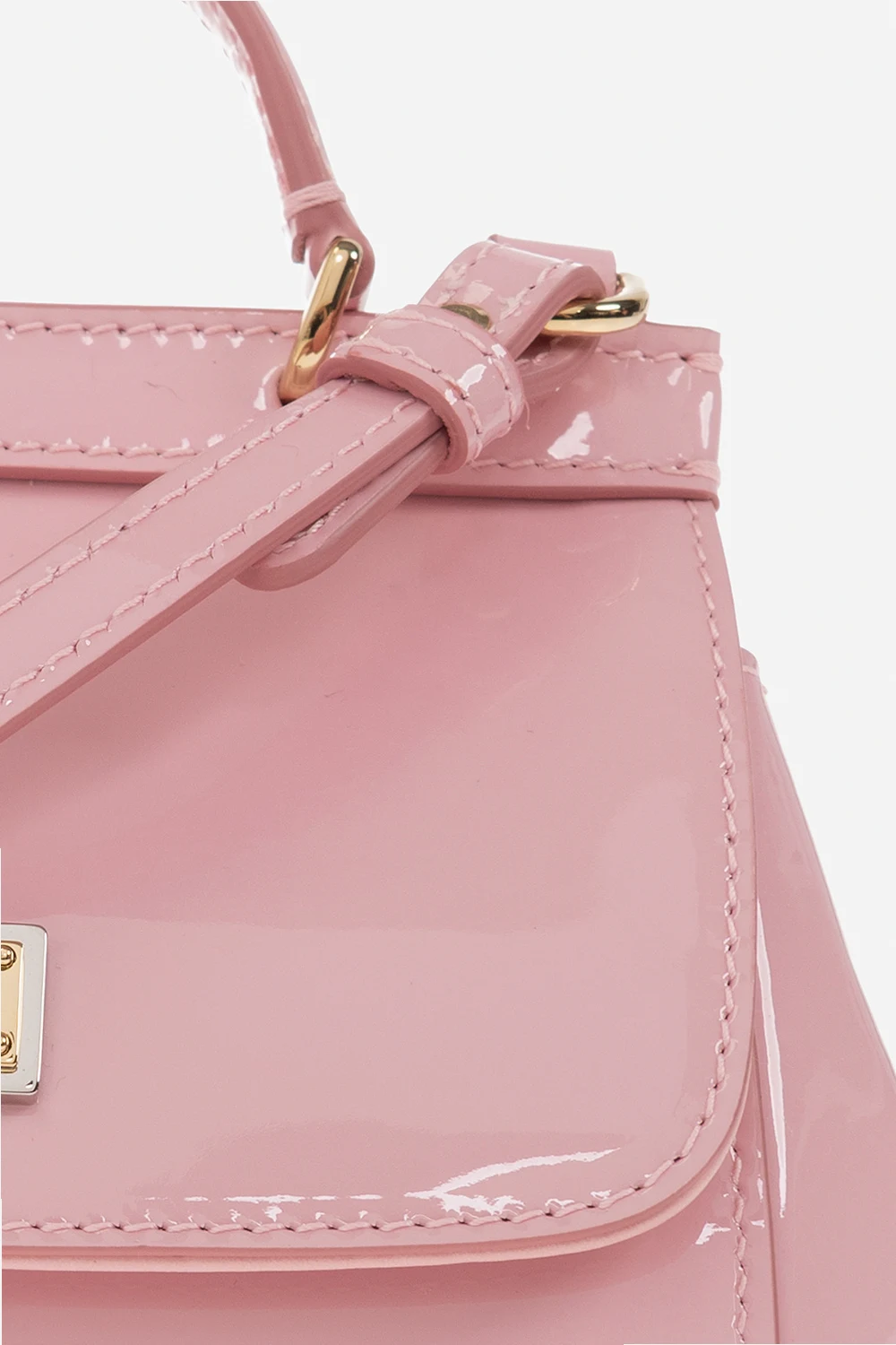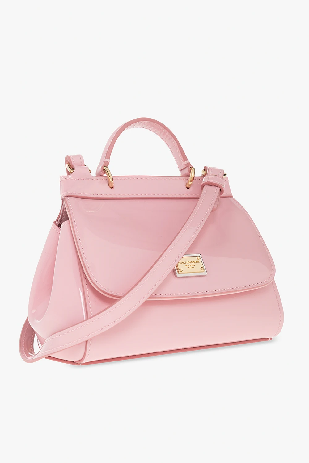 Jasnoróżowa torba na ramię Dolce & Gabbana. Wykonana z lakierowanej skóry cielęcej. Zamykana na magnetyczne zatrzaski. Z przodu aplikacja z logo. Półokrągła rączka. Regulowany pasek. Wewnątrz komora.