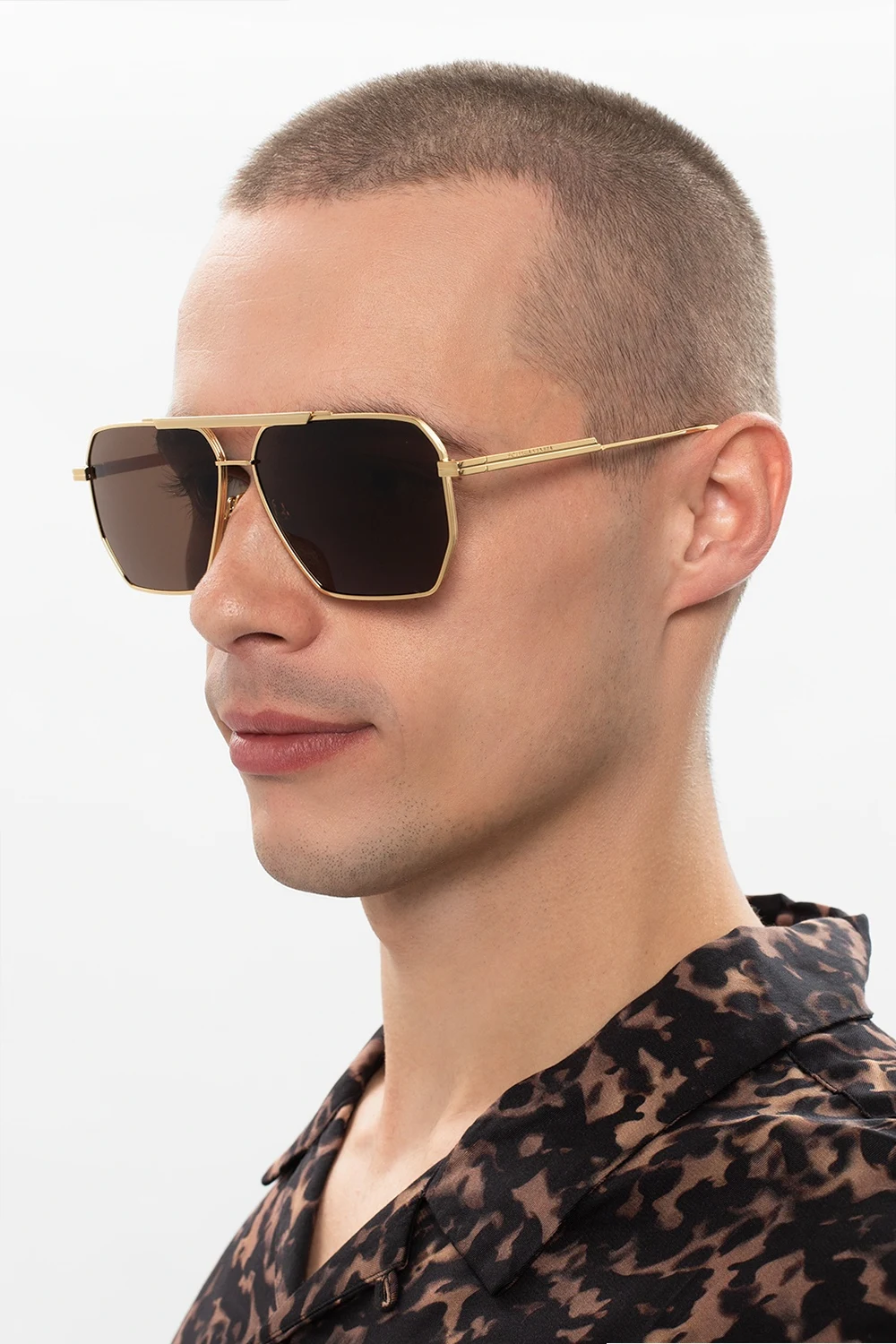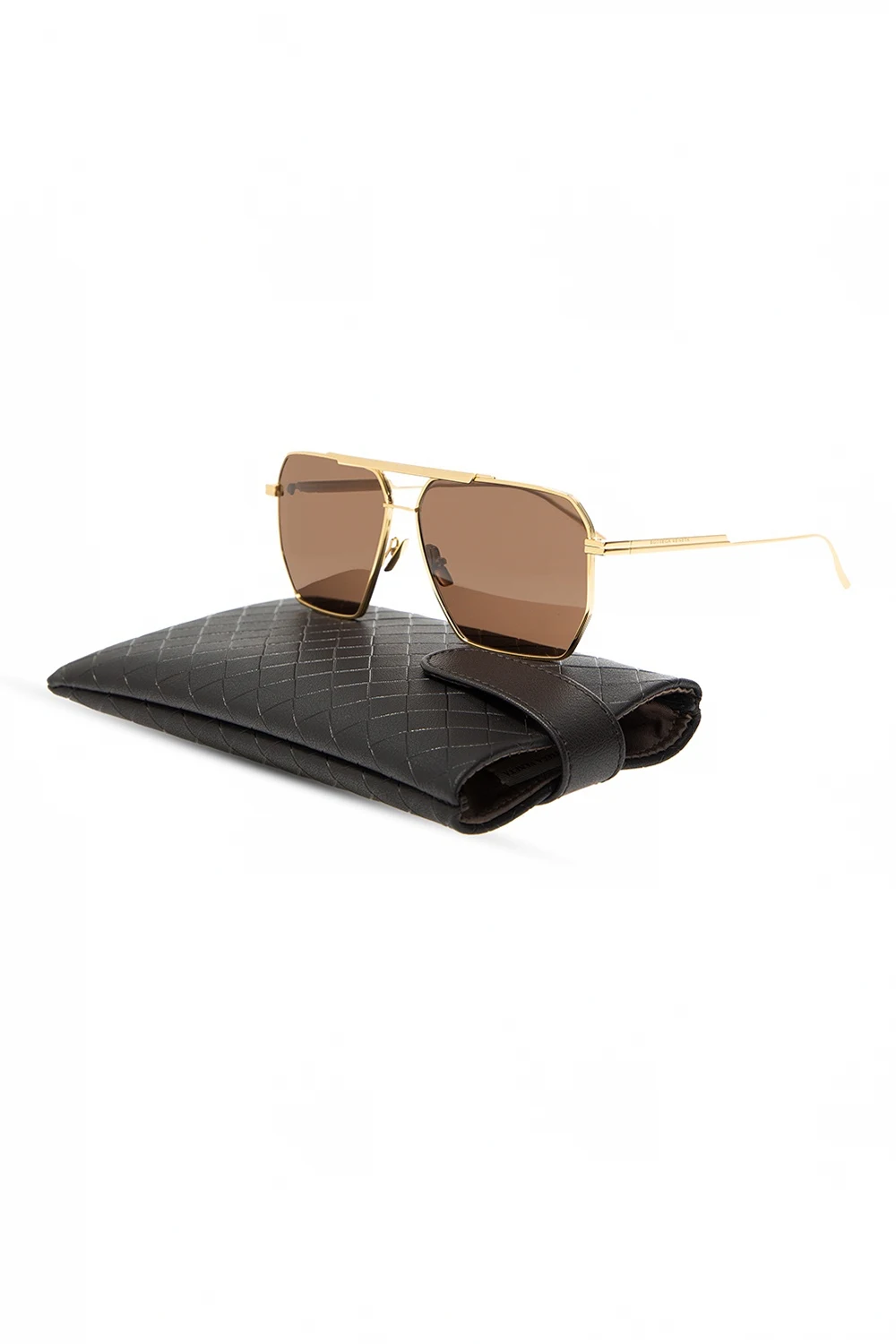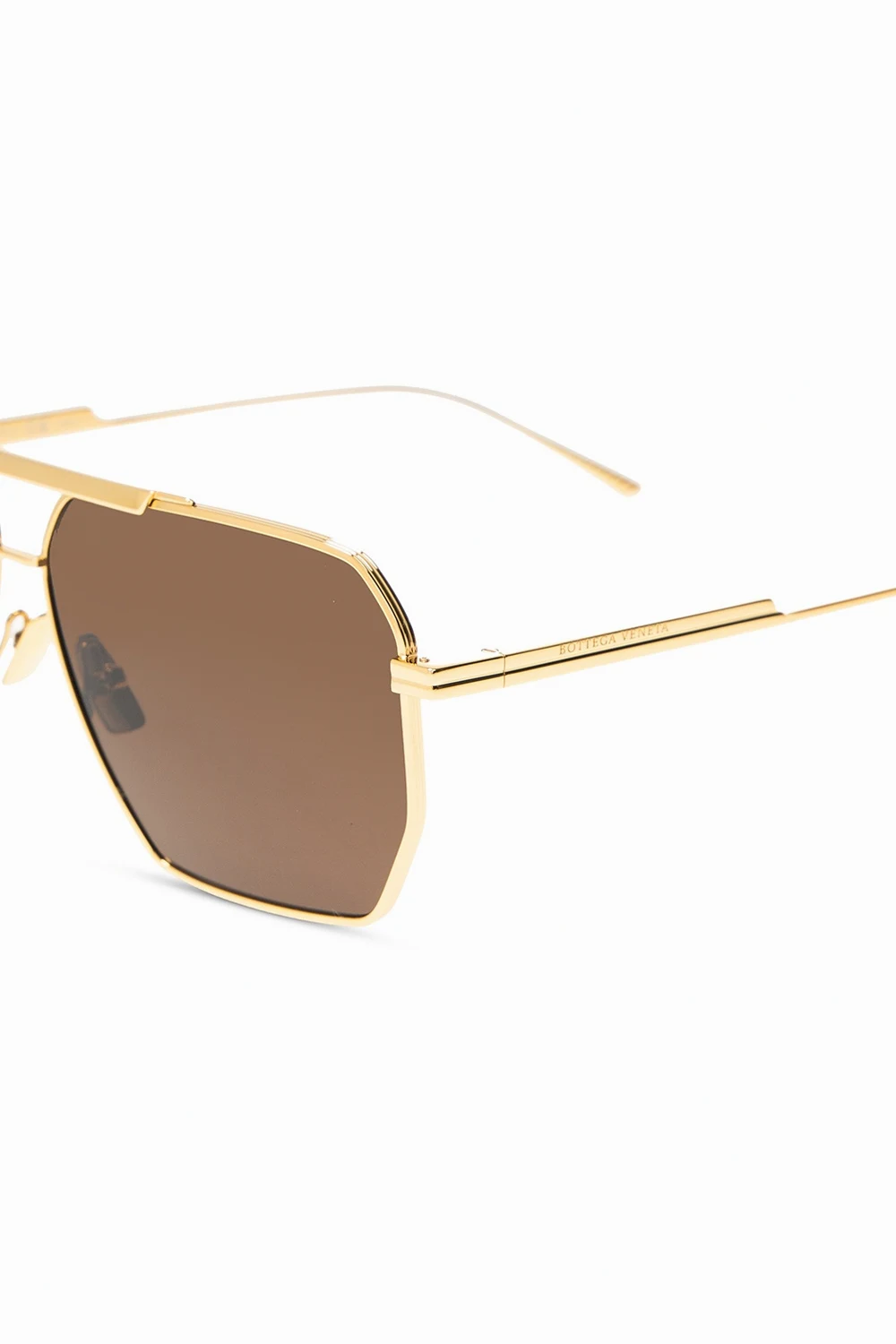 Okulary przeciwsłoneczne w kolorze złotym Bottega Veneta. Zauszniki z wytłoczonym logo. Podwójny mostek. Czarne, certyfikowane soczewki UVA/UVB.