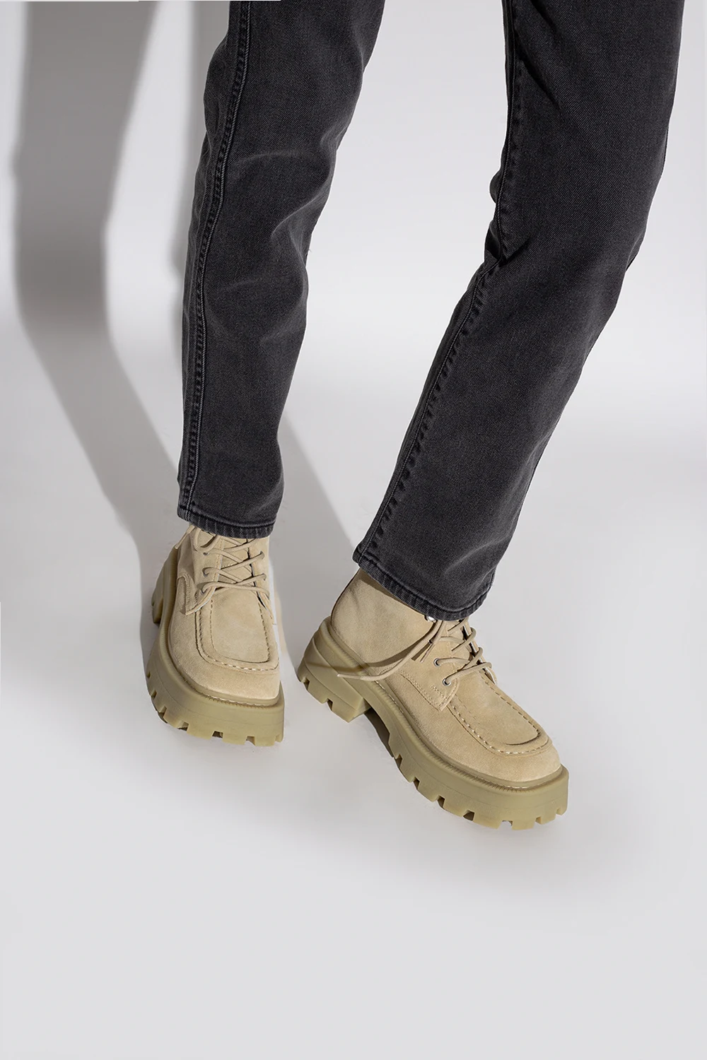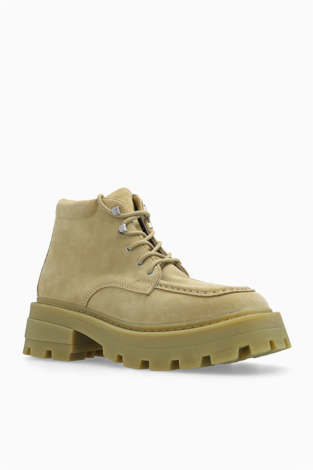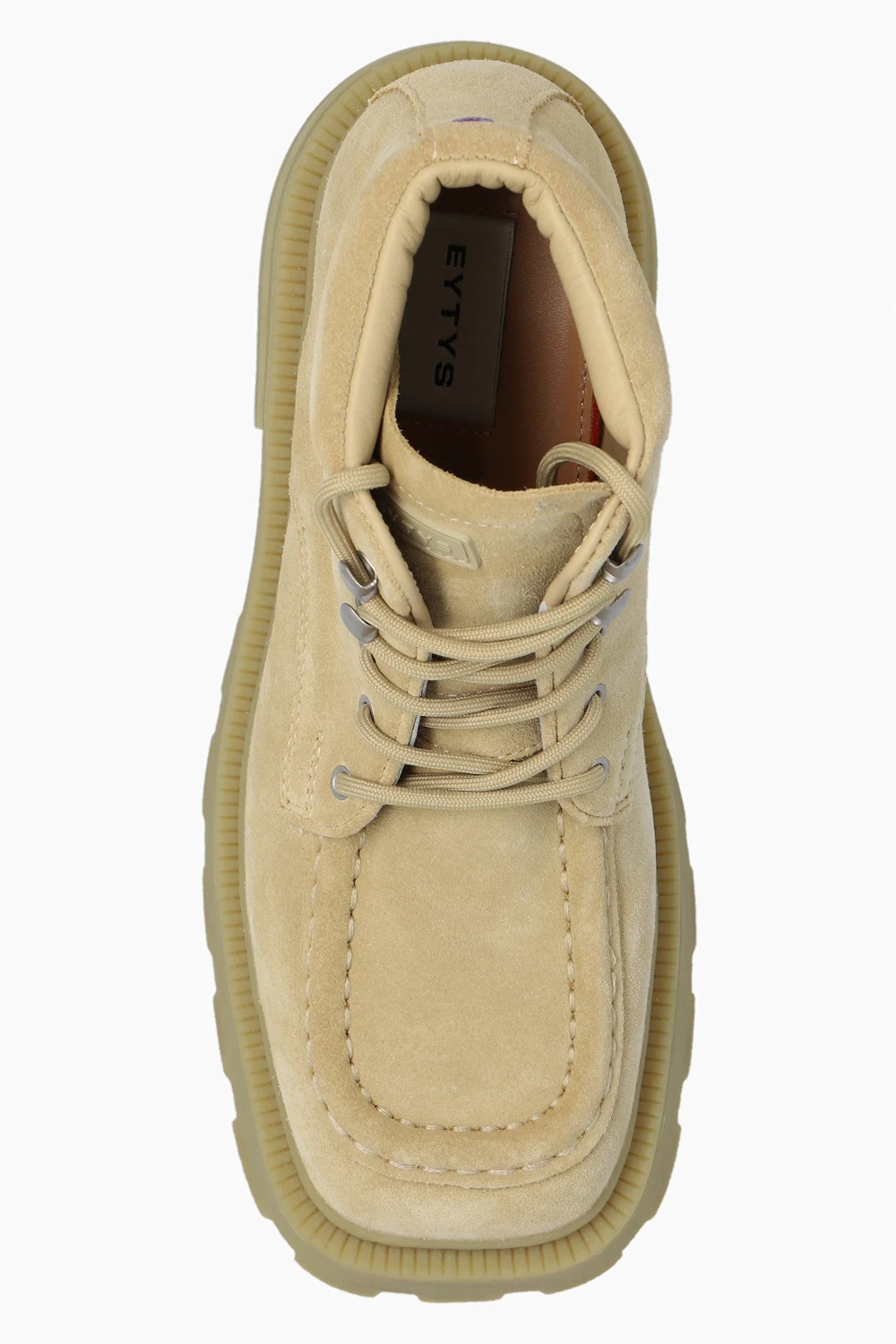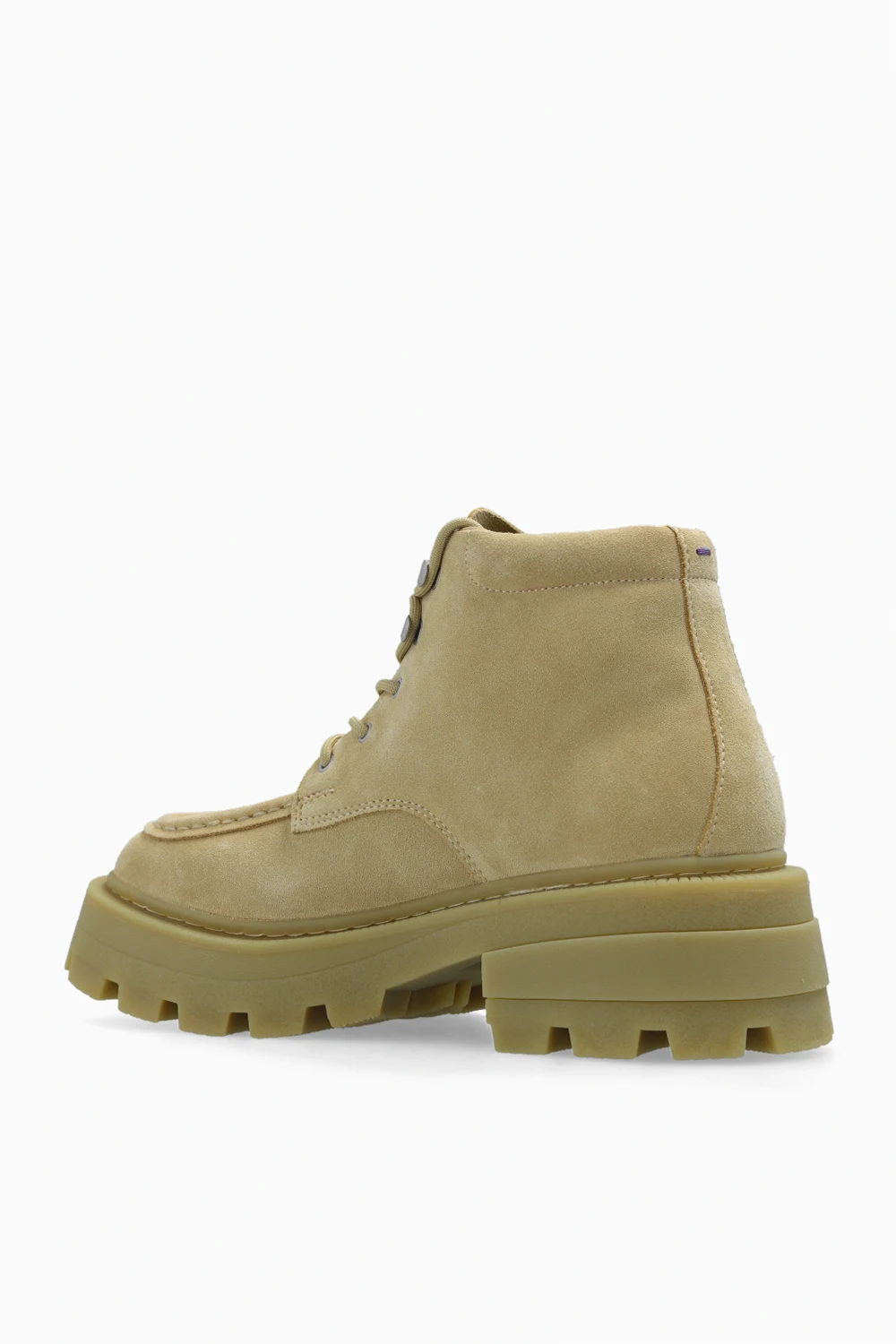 Jasnozielone, sznurowane buty za kostkę na platformie, model 'Tribeca' Eytys. Wykonane z zamszu. Język ozdobiony gumową naszywką z logo. Z przodu dekoracyjne przeszycia. Jasnozielona, gumowa podeszwa z wytłoczonymi prążkowaniami.