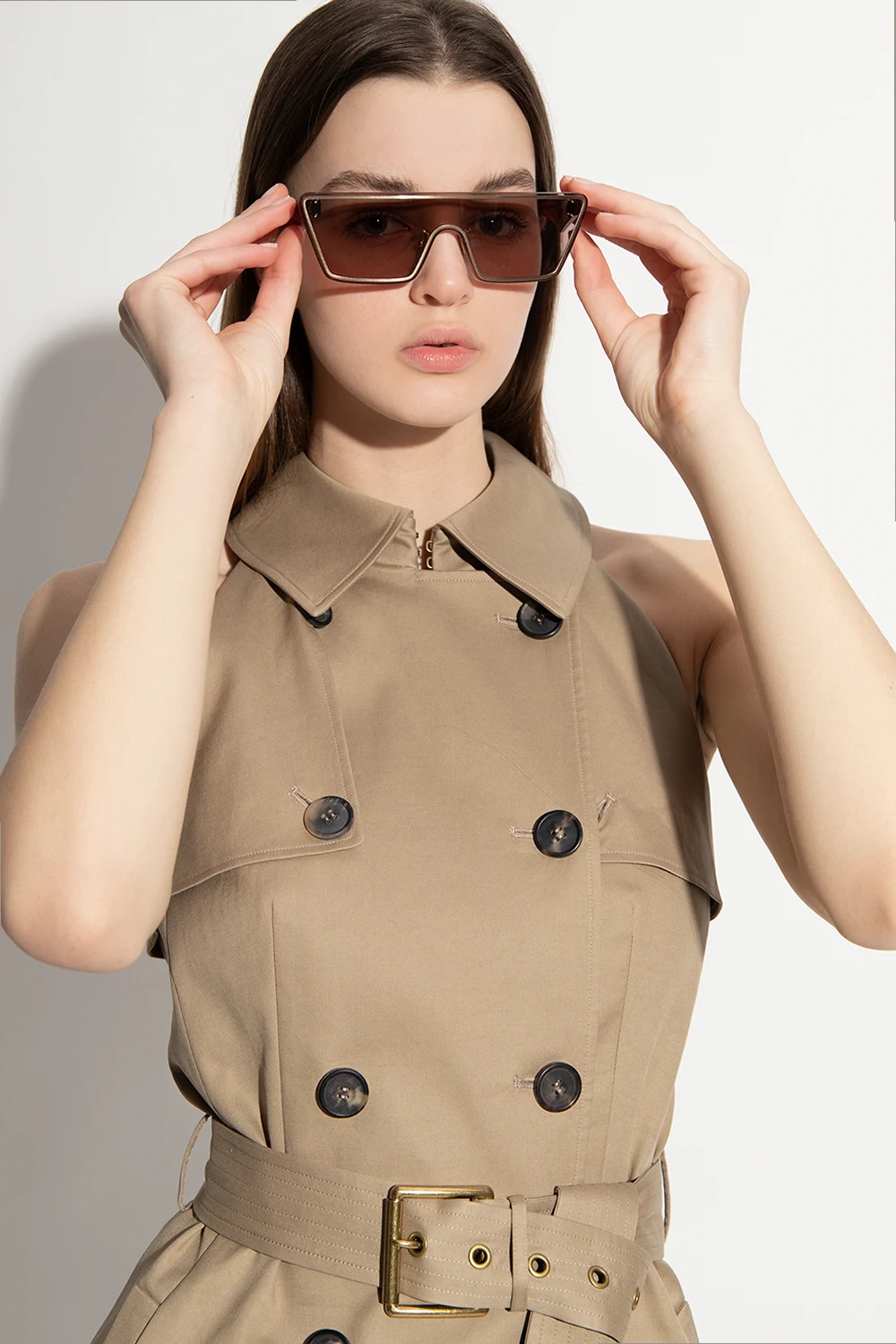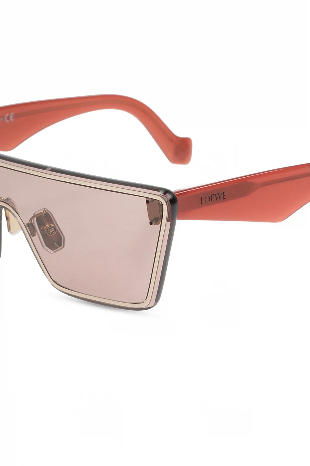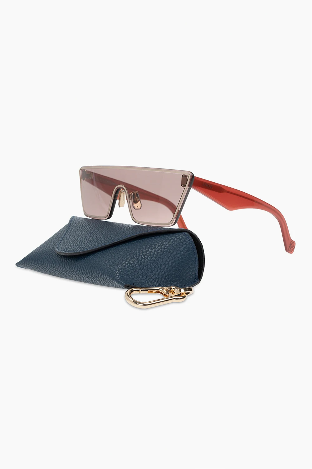 Czerwone okulary przeciwsłoneczne Loewe. Z boku wytłoczone logo. Brązowe, certyfikowane soczewki 100% UVA/UVB. Dołączone etui.