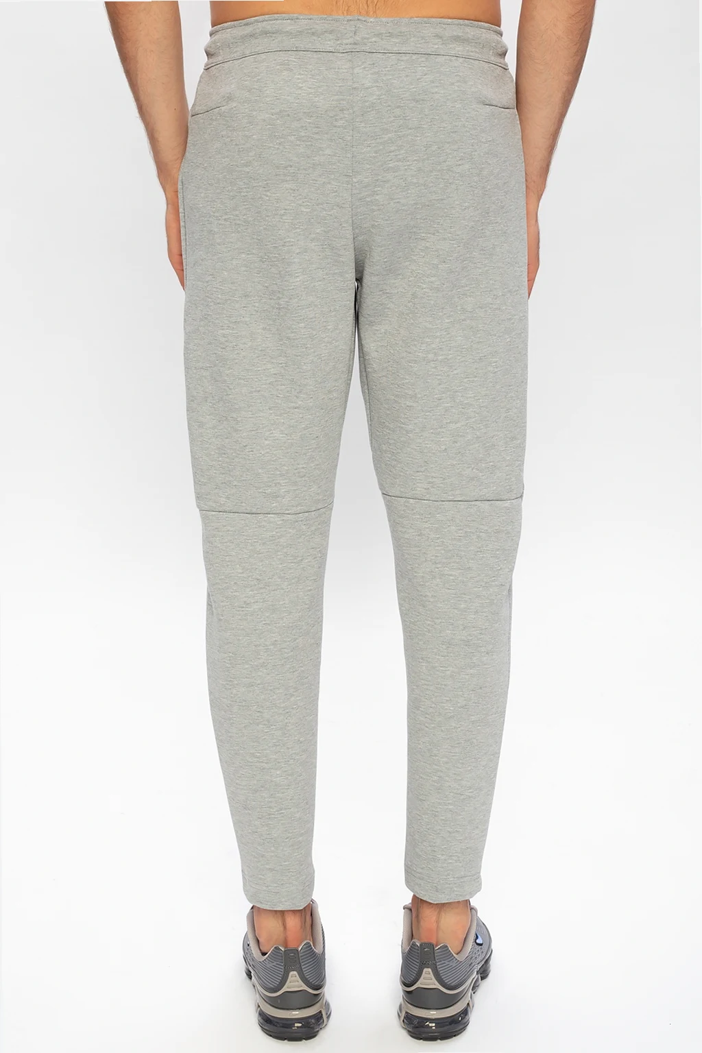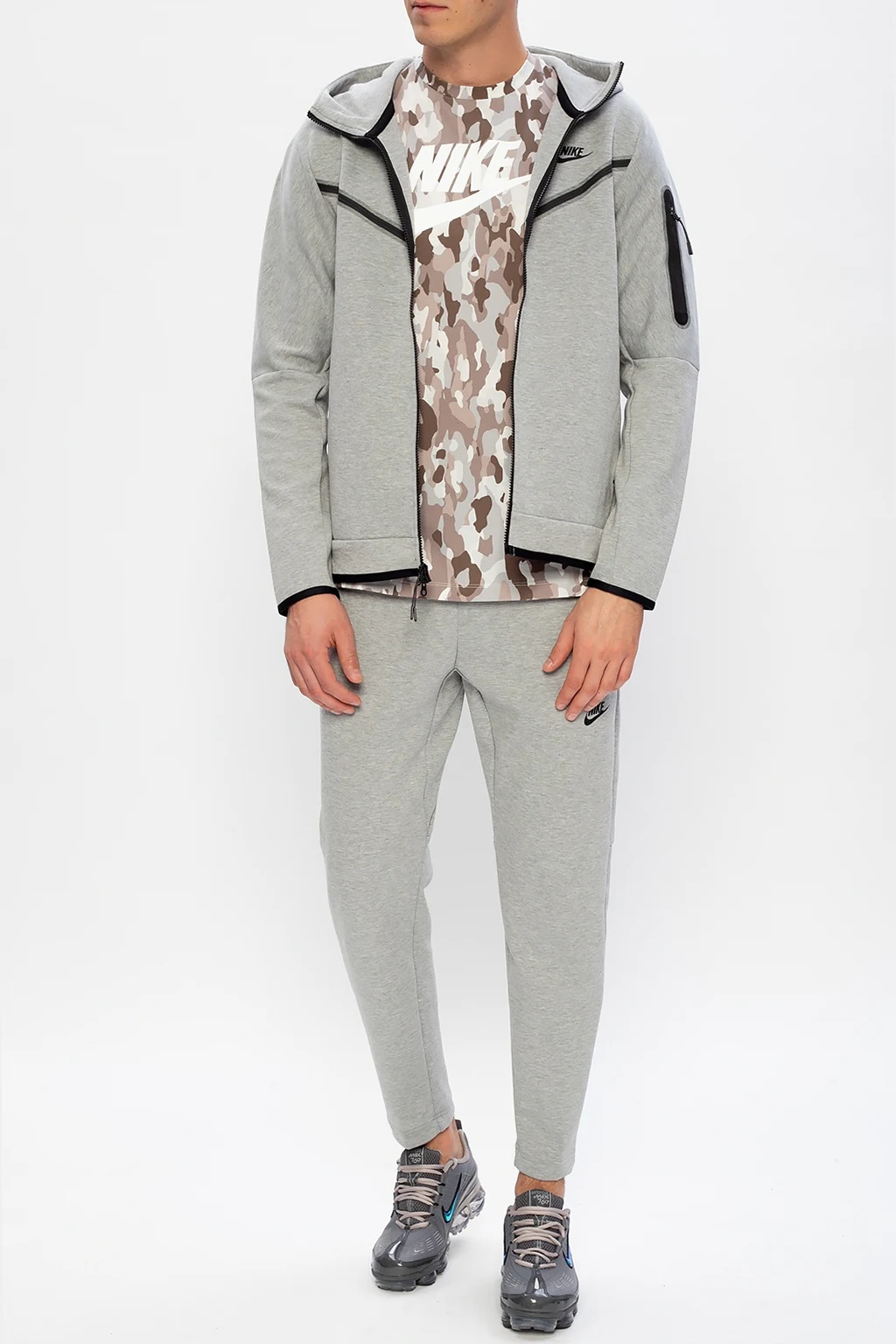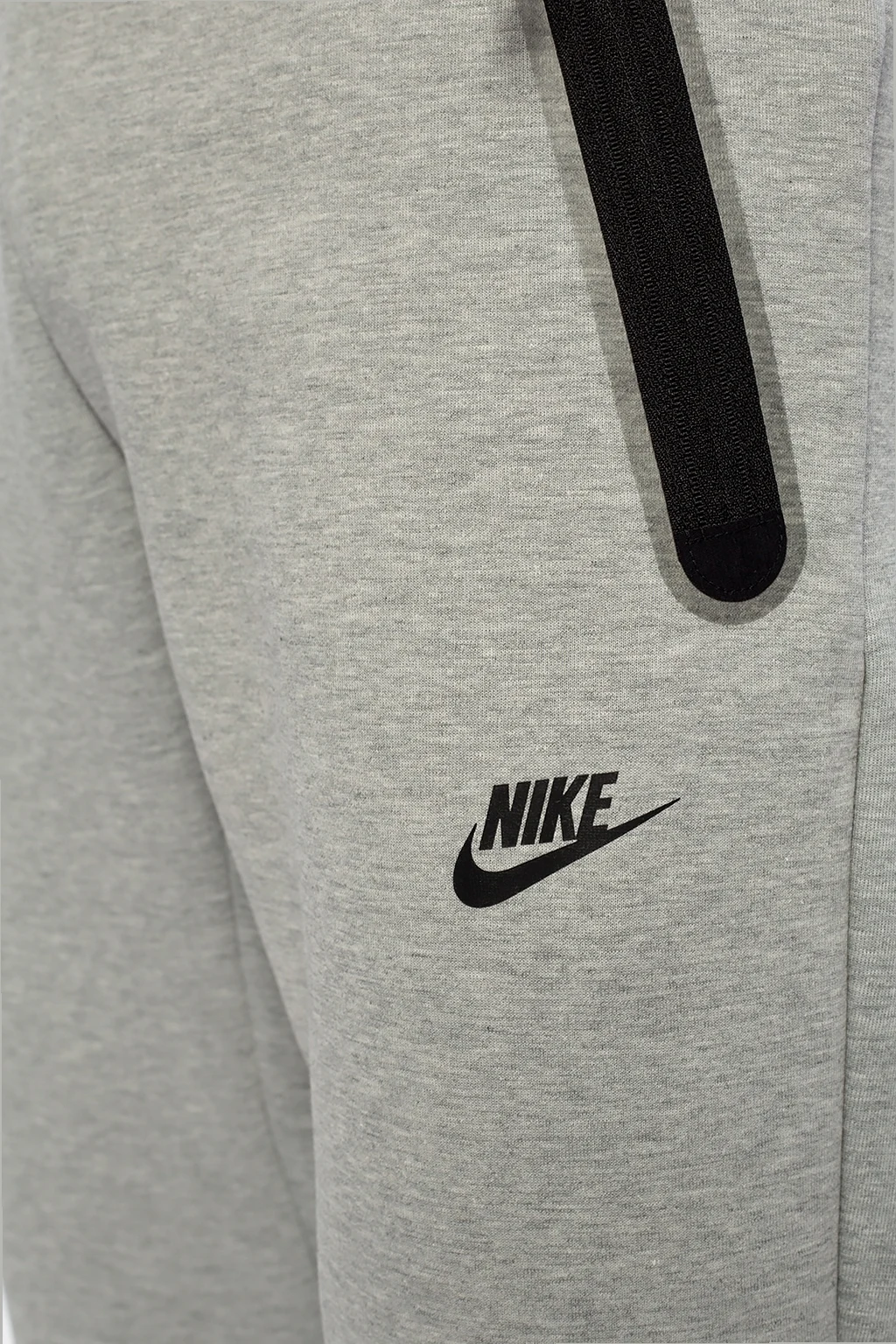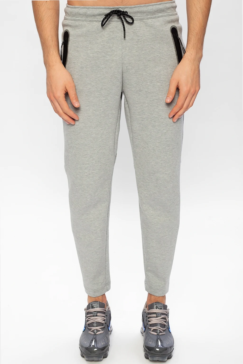 Szare spodnie dresowe Nike. W pasie ściągane trokami. Nadruk z logo w kolorze czarnym. Dwie kieszenie zapinane na zamki. Zwężane nogawki.