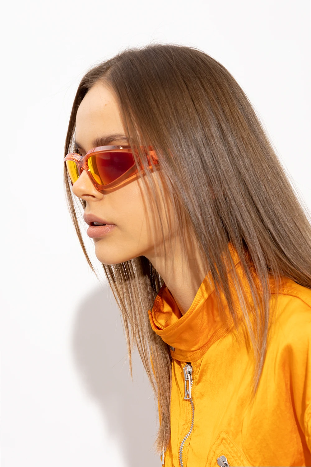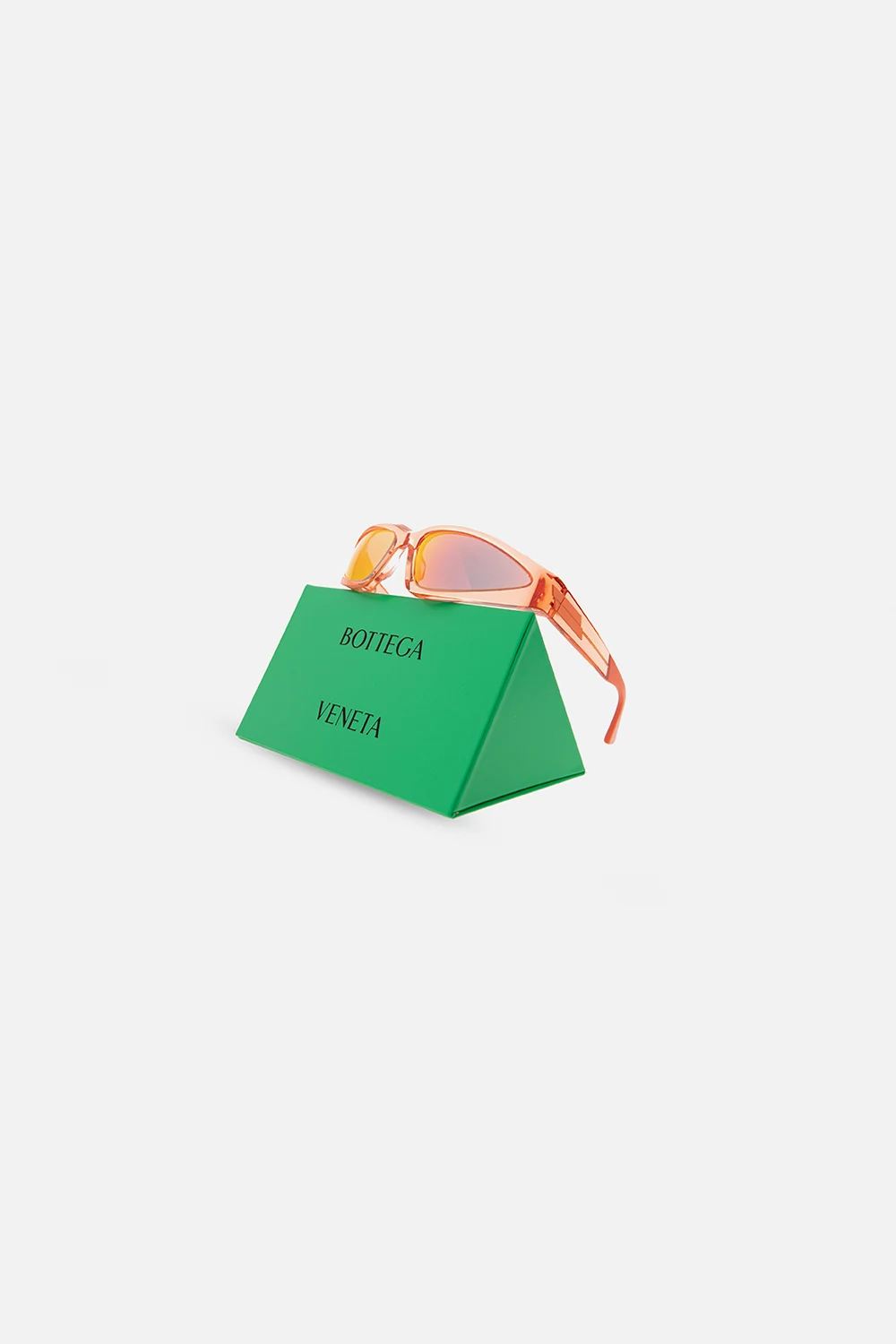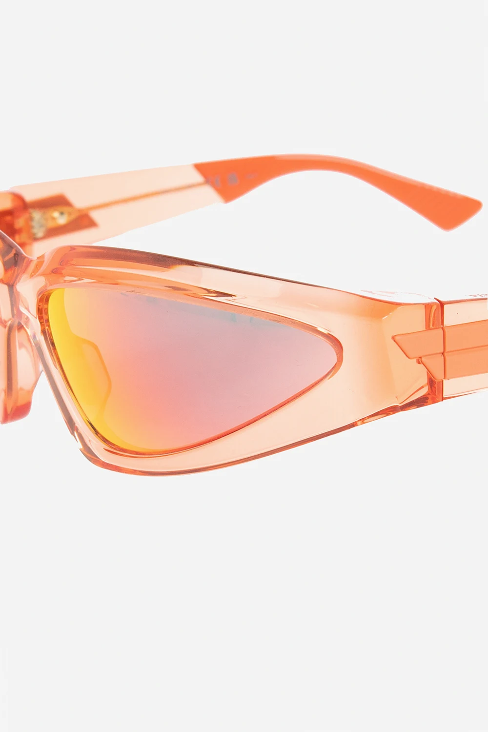 Pomarańczowe, lekko transparentne okulary przeciwsłoneczne Bottega Veneta. Zauszniki ozdobione charakterystyczną aplikacją. Jasnoniebieskie szkła z pomarańczowo-różowo-żółtym efektem lustrzanym i ze 100% ochroną przed promieniowaniem UV. Dołączone etui.