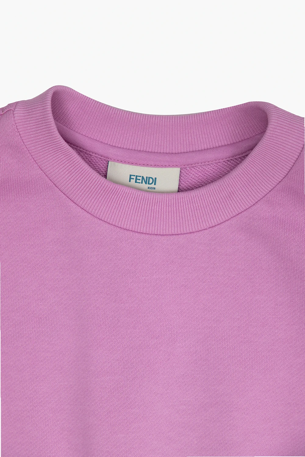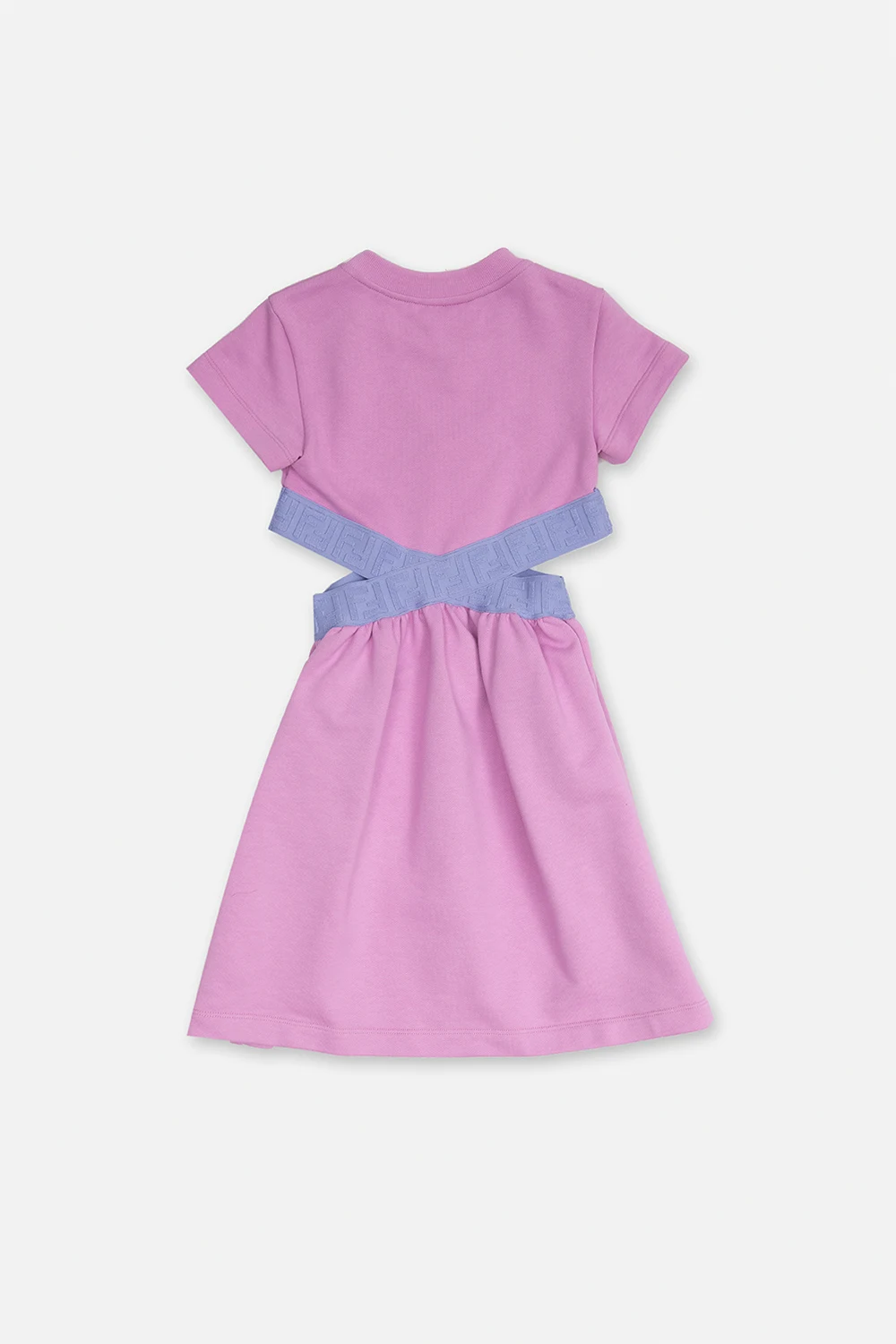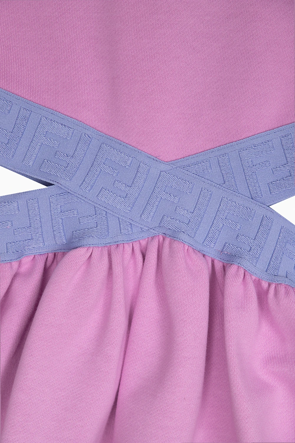 Różowa sukienka Fendi Kids. Wykonana z bawełny. Dekoracyjne wycięcia w talii wykończone ściągaczem ozdobionym wypukłym logo. Okrągły dekolt wykończony ściągaczem. Krótkie rękawy.