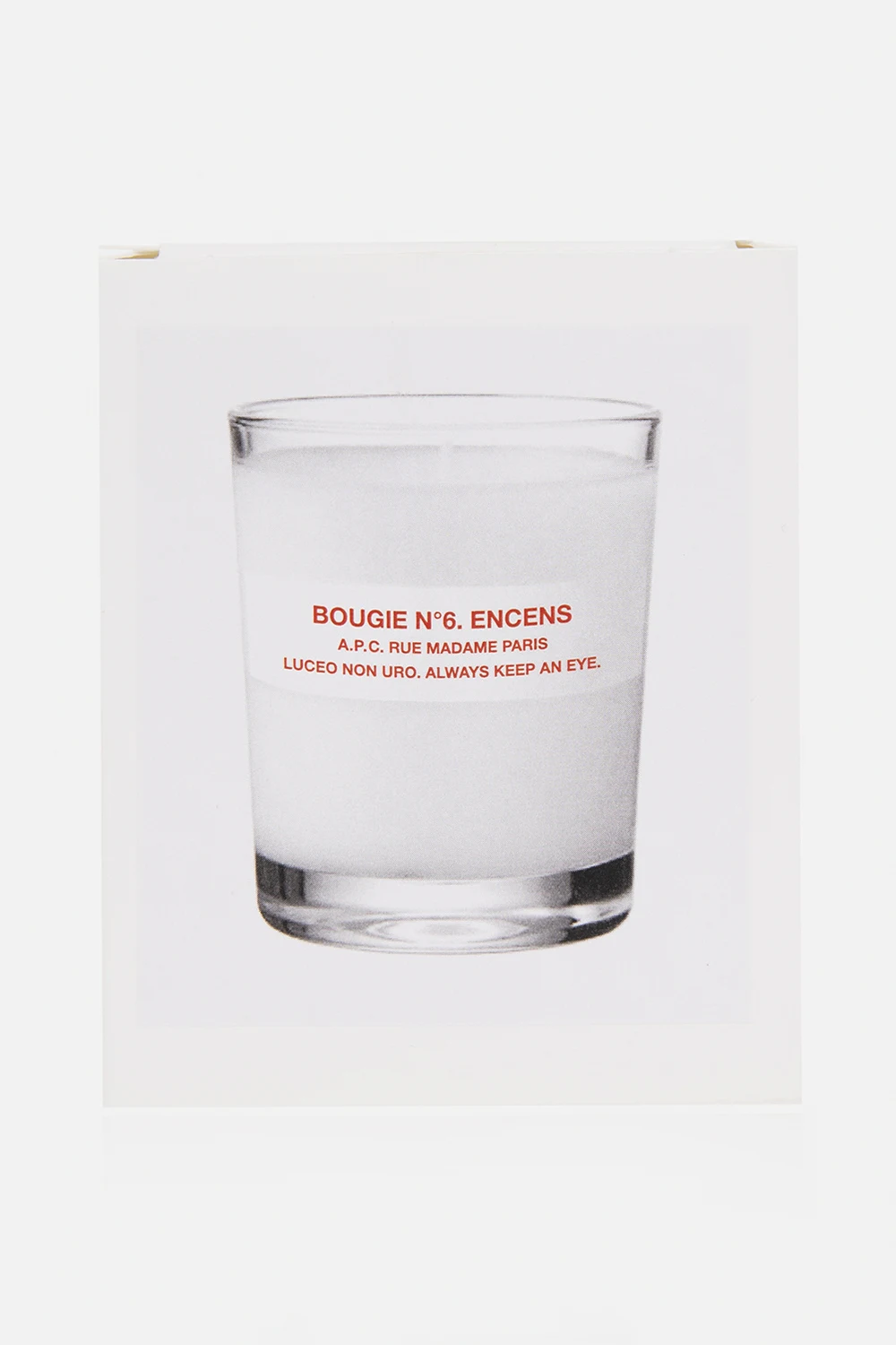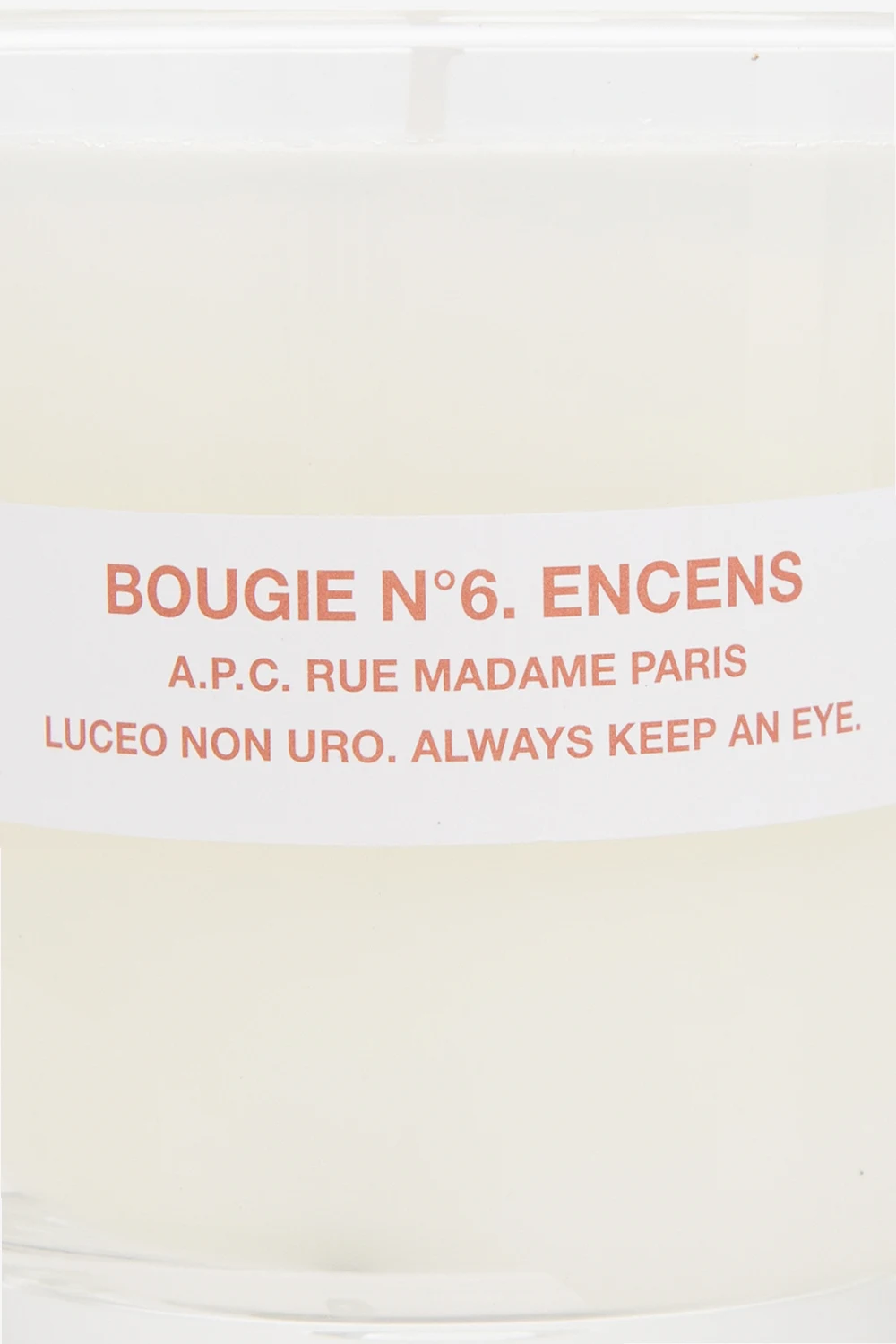 Świeczka zapachowa ‘Bougie nr 6. Encens’ A.P.C. Zapach kadzidła. Wykonana z wosku mineralnego i parafiny. Szklane opakowanie.