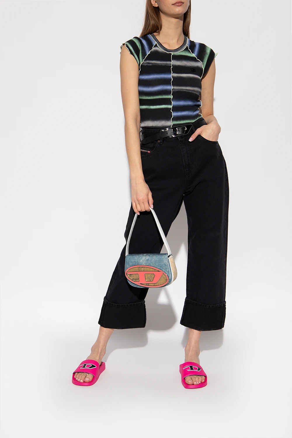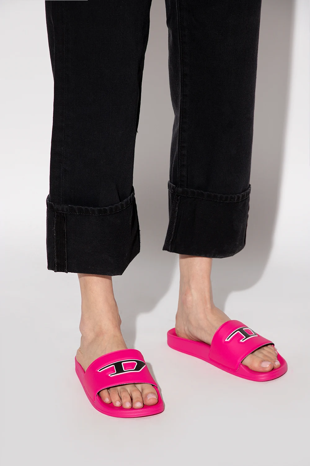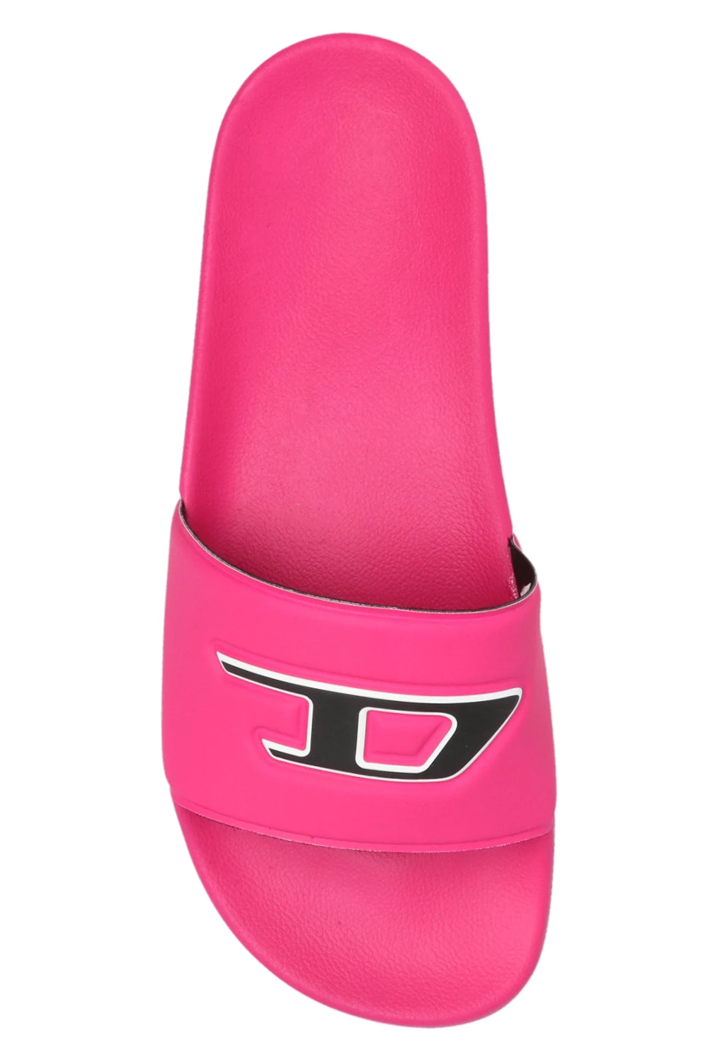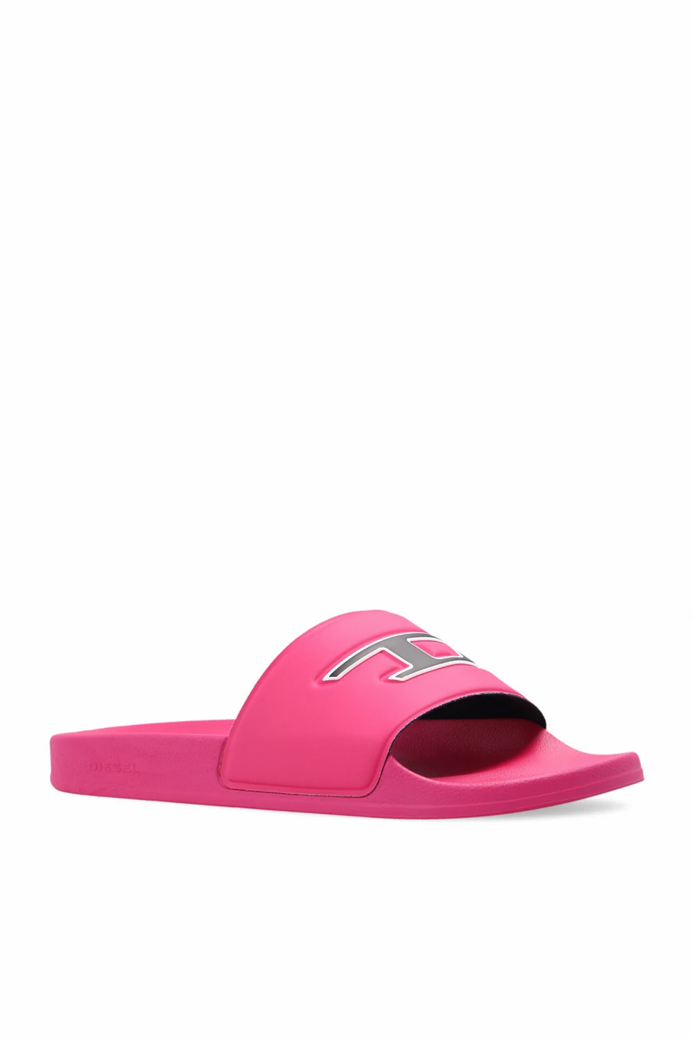 Różowe, gumowe klapki, model 'Sa-Mayemi' Diesel. Ozdobione z przodu wypukłym logo w kolorze czarno-białym. Różowa, gumowa podeszwa.