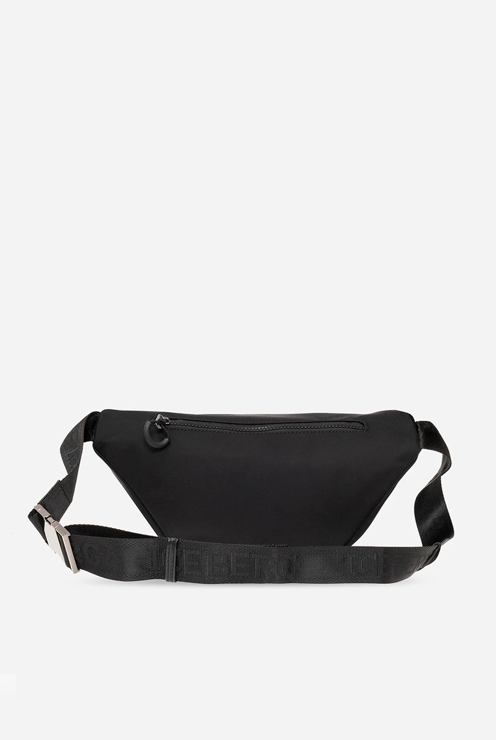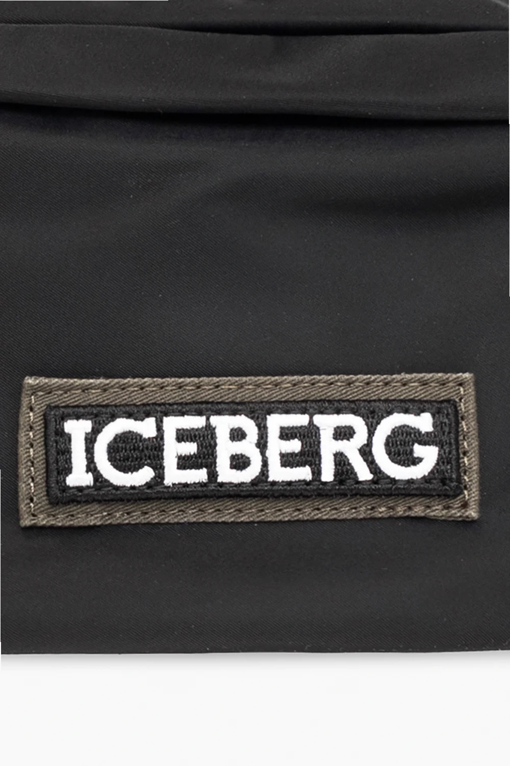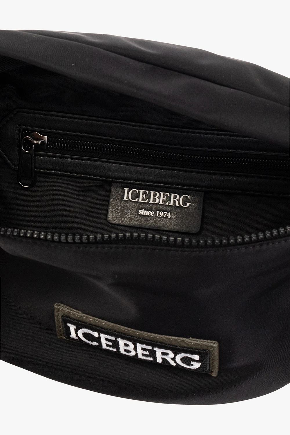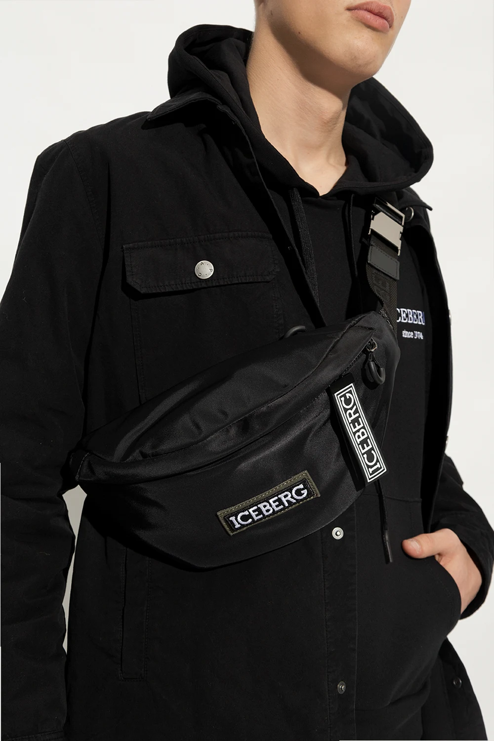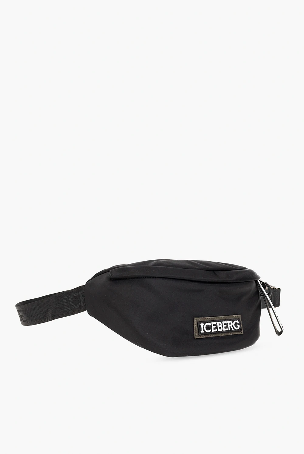 Czarna torba na pas Iceberg. Zamykana na zamek. Ozdobiona naszywką z logo. Z tyłu kieszeń zamykana na zamek. Pas biodrowy z możliwością regulacji długości. Wewnątrz komora oraz kieszeń zamykana na zamek. Metalowe wykończenie w kolorze czarnego srebra.