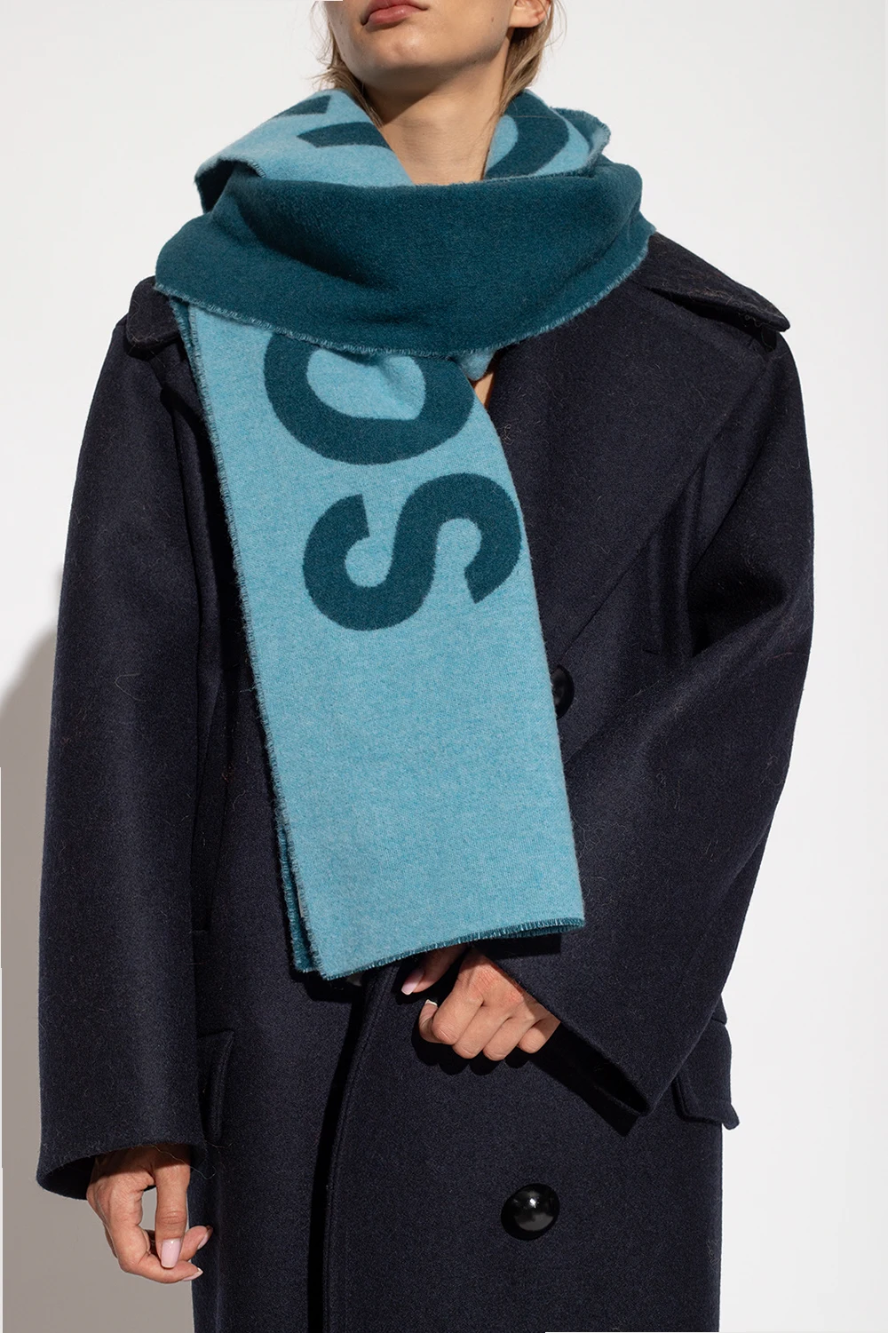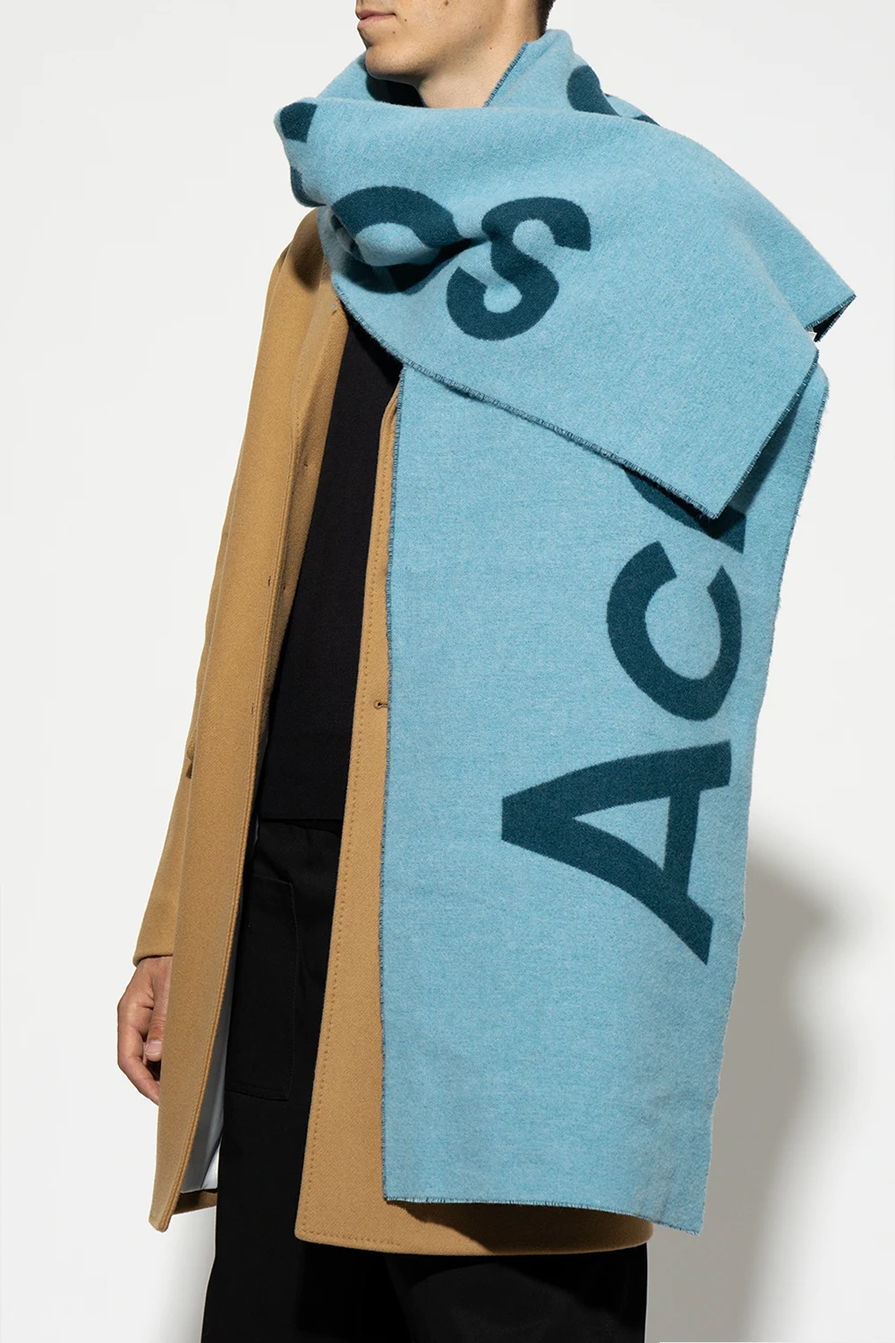 Niebieski szal Acne Studios. Wykonany z mieszanki wełny. Ozdobiony wyszytym logo.